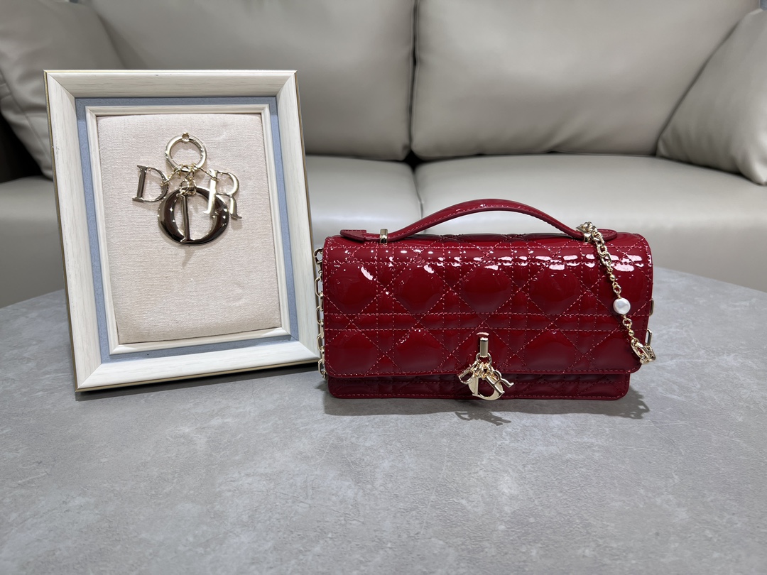 Lady Dior pearl clutch in cherry red lambskin.