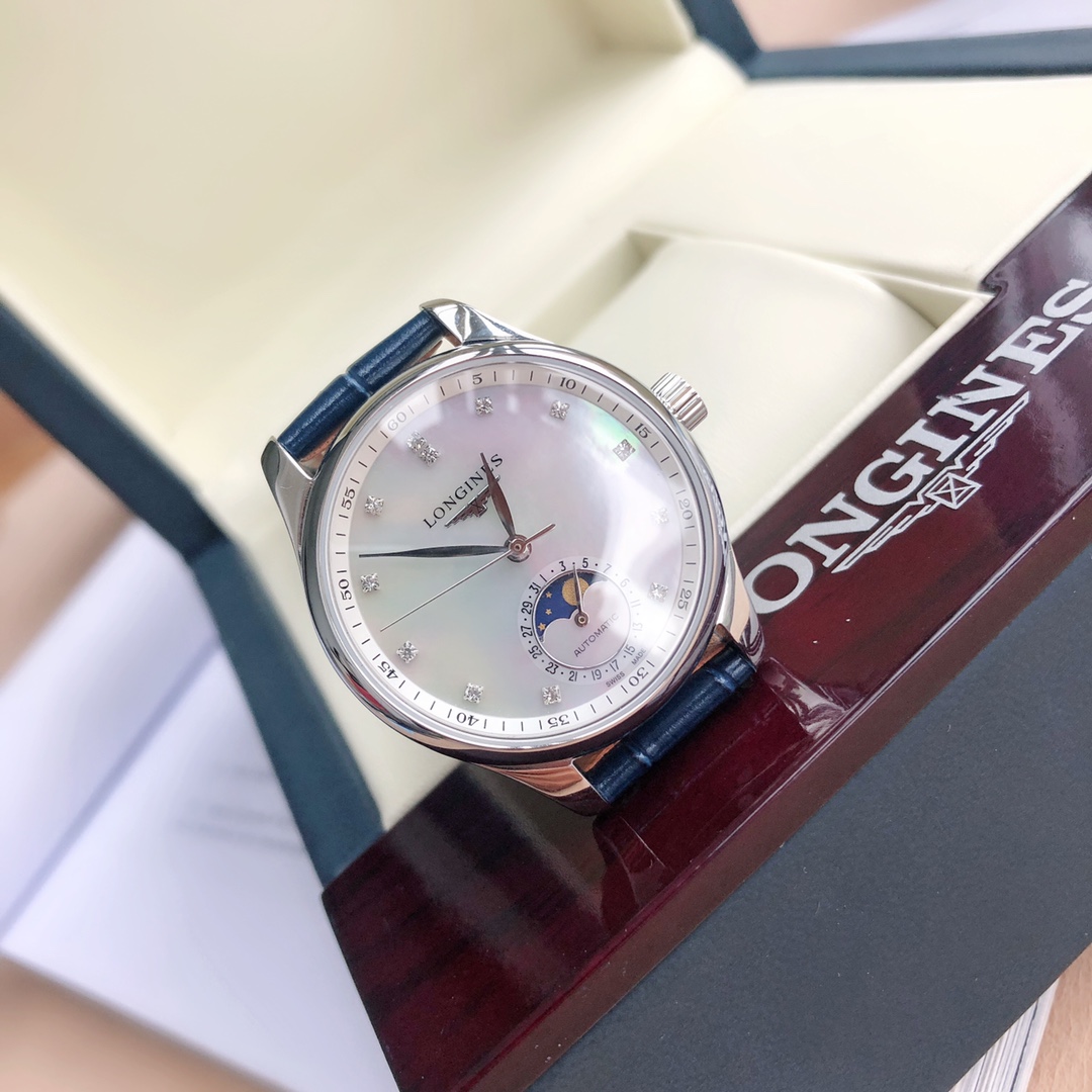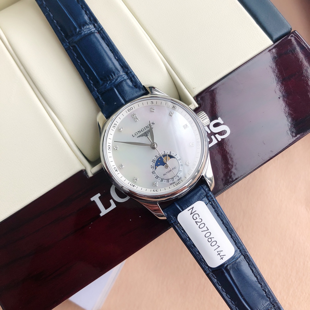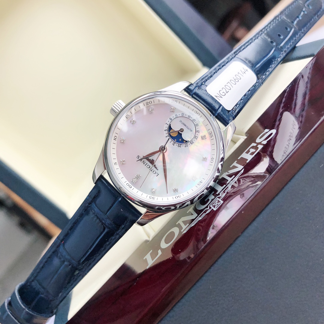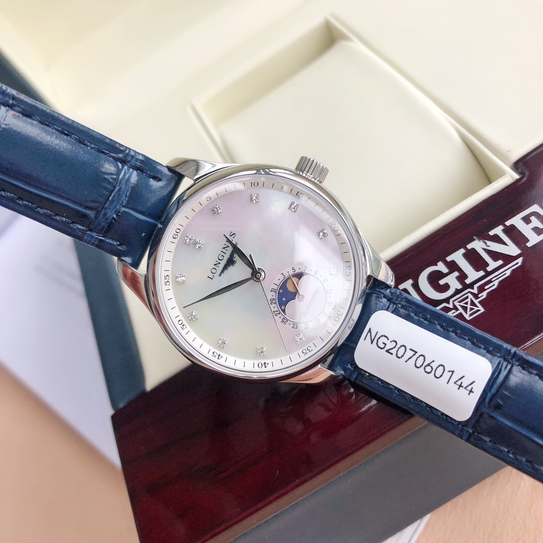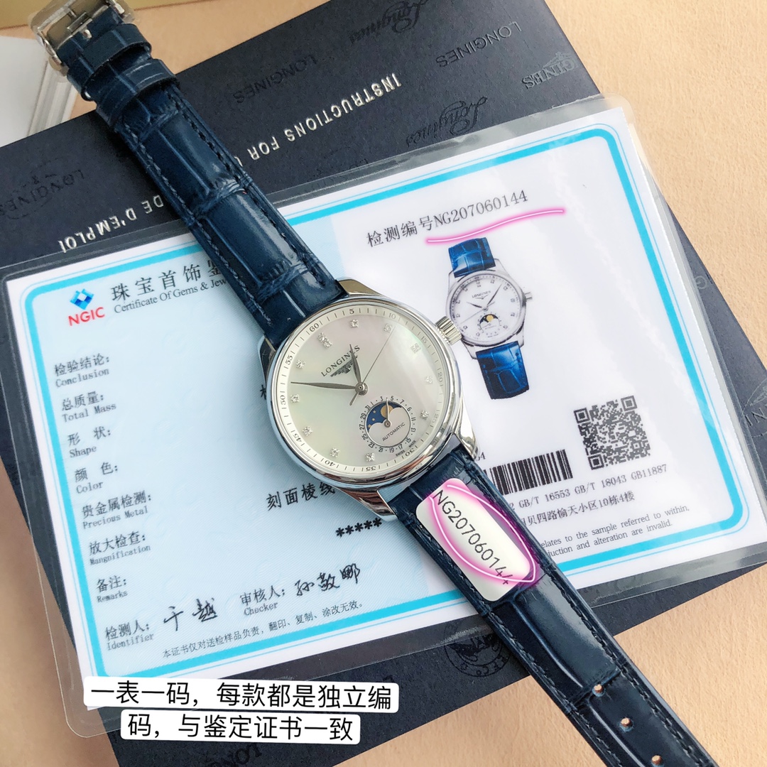 Batch Matching Box Qixi Festival Goddess Must-Have, Longines New Masterpiece Women's Series L2.409..4.87.4 Simple and Elegant, Fully Displaying Composure! [Function Synchronized with Original] Pull the crown to the second position to independently adjust the calendar function, recognize it! [Case] Watch dimensions 34✖12 millimeters. Meticulously developed, not overlooking any details, meticulously restoring the unique elegant essence of the Masterpiece series case, ensuring the wearer feels both fitted and comfortable during wear. Willow-leaf-shaped blue steel tempered hands (blued hands) with version and craftsmanship synchronized with the genuine product. Operation and adjustment methods match the original. The wheat grain texture on the dial is identical to the genuine product, indistinguishable to the naked eye. Paired with an Italian calfskin strap and Longines classic butterfly-style steel buckle. The movement uses a 2824 modified moon phase original movement, ensuring accurate timekeeping! ⚠️ Please recognize the exclusive quality.