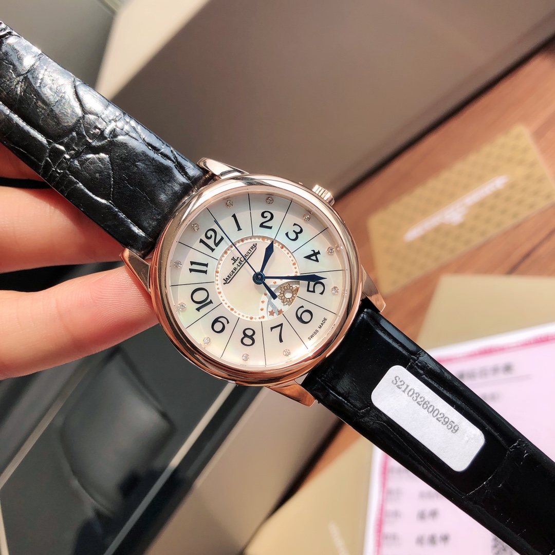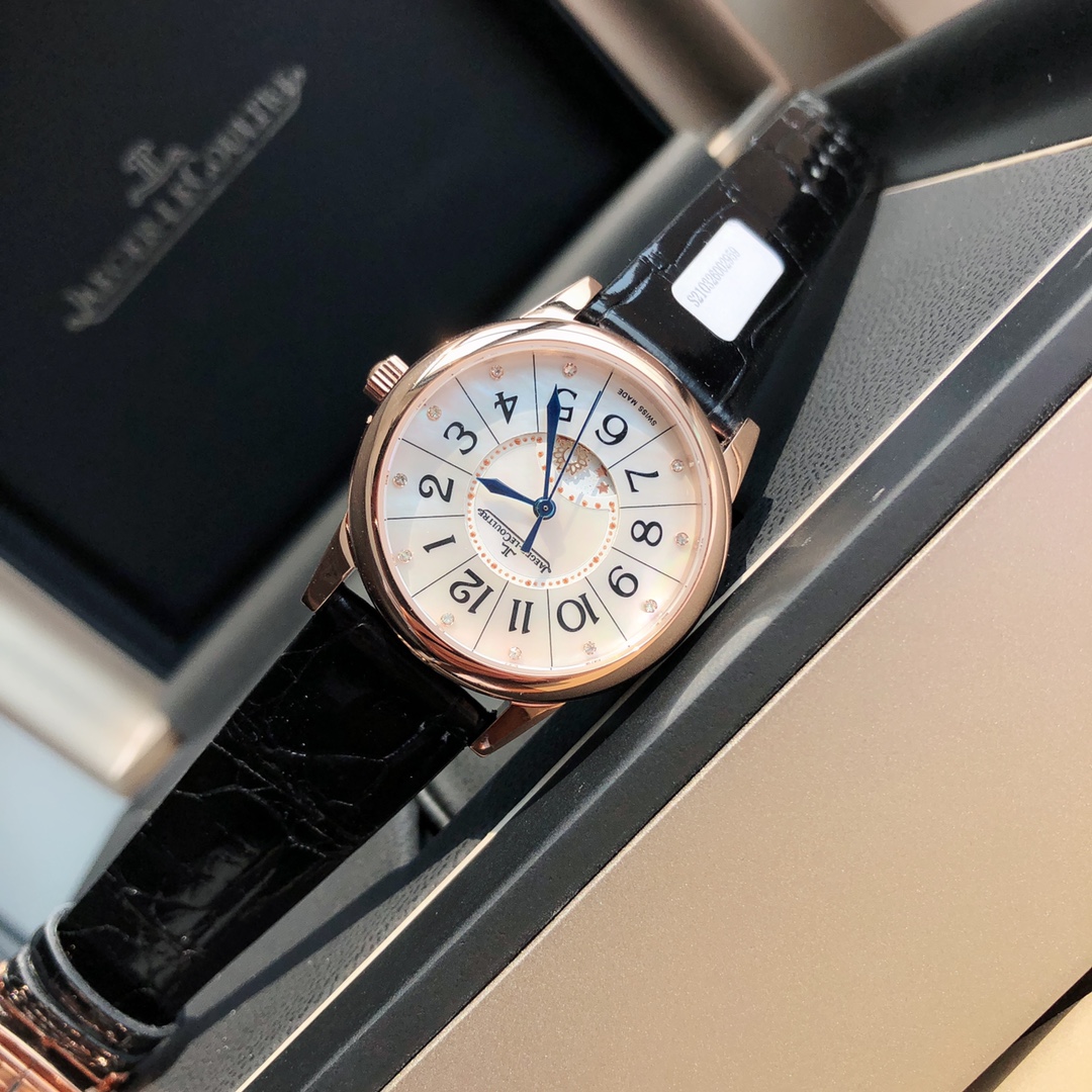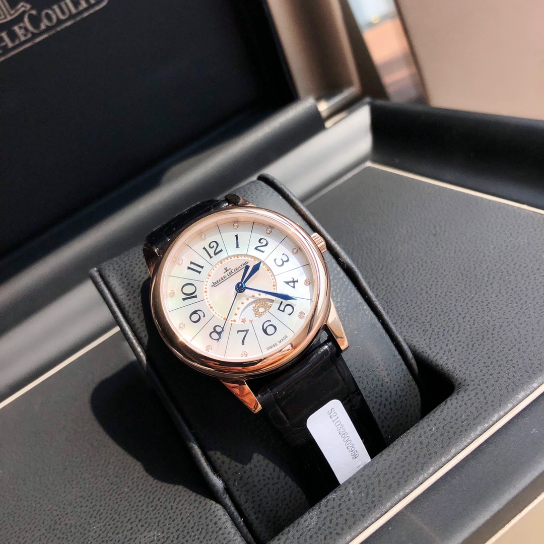 New hard goods! Jaeger-LeCoultre Rendez-Vous series watch romantically debuts. Set with real diamonds, American imported crocodile leather strap. Corrects all shortcomings of any current market versions, simple and ladylike, fully displaying romantic feelings! Watch size 34MM/thickness 8.9MM, simple and capable case finely polished, ensuring polishing craftsmanship matches, texture synchronized with genuine product. Dial set with 11 VS1.2 top-grade South African natural diamonds. Strict setting work, heavily invested to create. Restores the most beautiful style of the genuine product! Equipped with national inspection agency testing certificate, verifiable and queryable! Uses original Swiss imported stone movement, perfectly achieves original calendar day/night star optional/hour/minute/second change functions, closely follows original replication! Accurate timekeeping. Quality assured! Completely consistent with genuine product, electric light blued hands shine brilliantly in sunlight. American imported crocodile leather strap. Lightweight and breathable, excellent texture, paired with Jaeger-LeCoultre classic folding clasp. Comes with original gift box, perfect recommendation for gifting or personal use!!