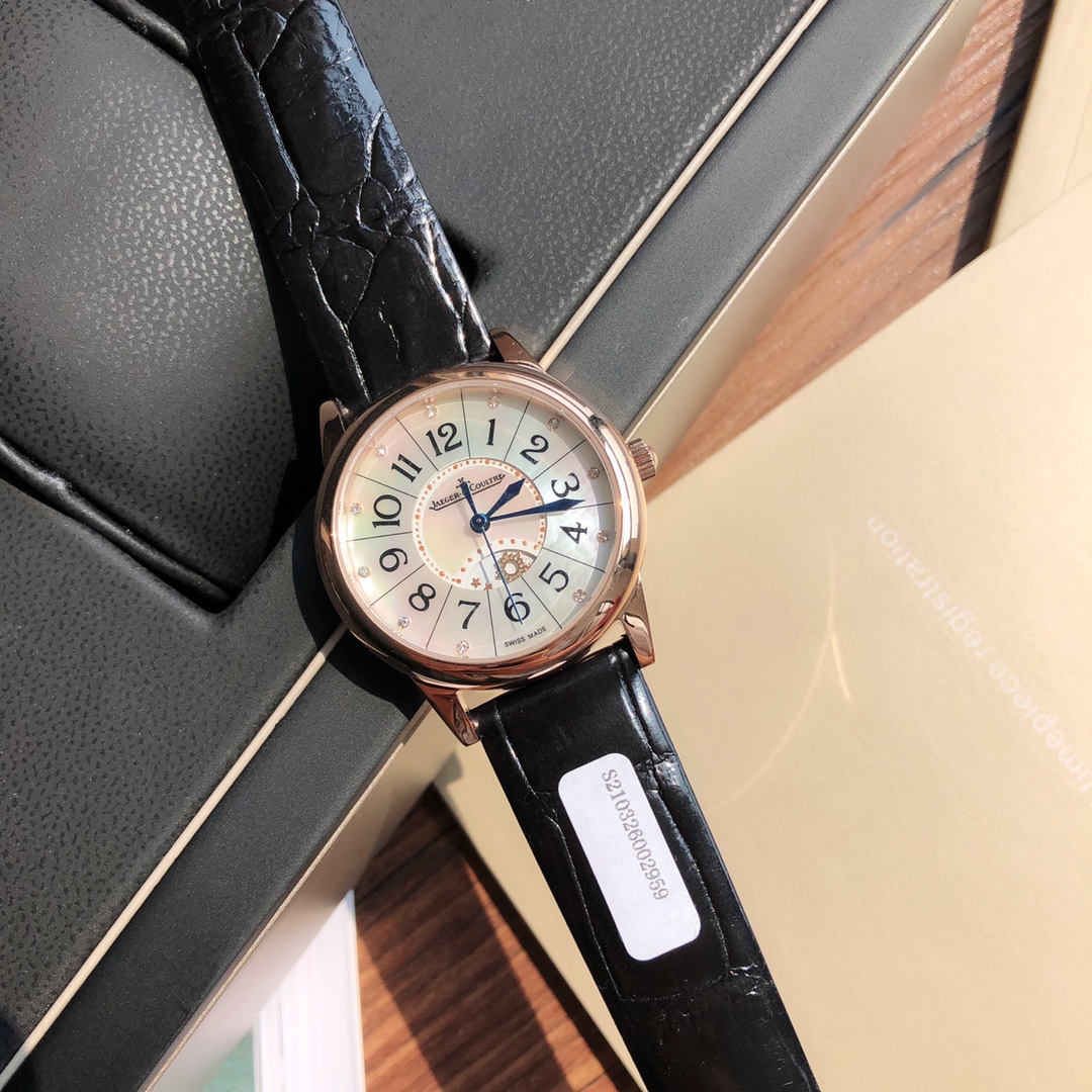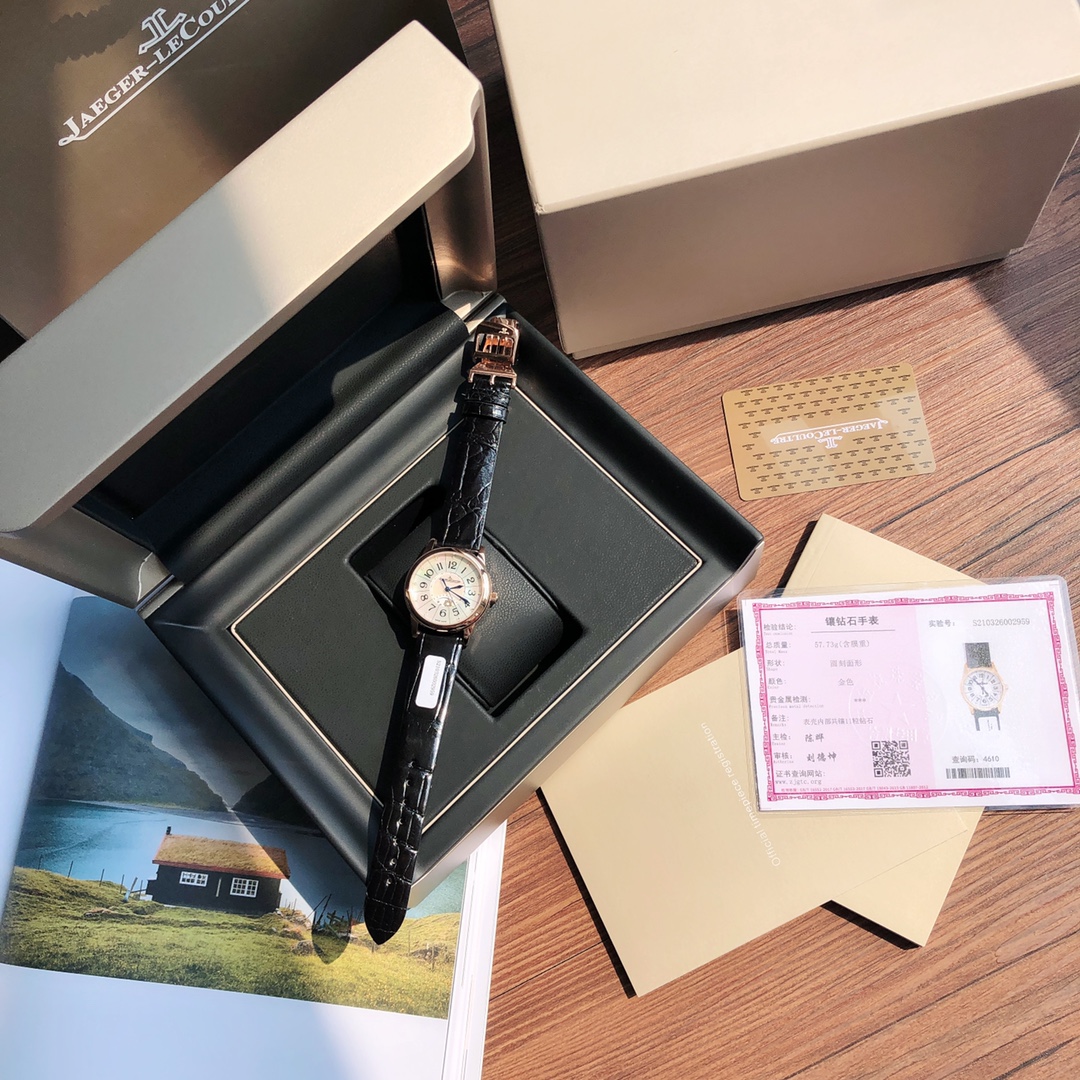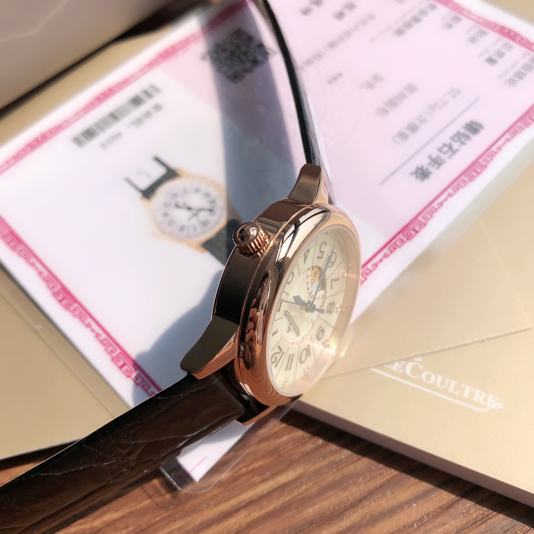New hard goods! Jaeger-LeCoultre Rendez-Vous series watch romantically debuts. Set with real diamonds, American imported crocodile leather strap. Corrects all shortcomings of any current market versions, simple and ladylike, fully displaying romantic feelings! Watch size 34MM/thickness 8.9MM, simple and capable case finely polished, ensuring polishing craftsmanship matches, texture synchronized with genuine product. Dial set with 11 VS1.2 top-grade South African natural diamonds. Strict setting work, heavily invested to create. Restores the most beautiful style of the genuine product! Equipped with national inspection agency testing certificate, verifiable and queryable! Uses original Swiss imported stone movement, perfectly achieves original calendar day/night star optional/hour/minute/second change functions, closely follows original replication! Accurate timekeeping. Quality assured! Completely consistent with genuine product, electric light blued hands shine brilliantly in sunlight. American imported crocodile leather strap. Lightweight and breathable, excellent texture, paired with Jaeger-LeCoultre classic folding clasp. Comes with original gift box, perfect recommendation for gifting or personal use!!