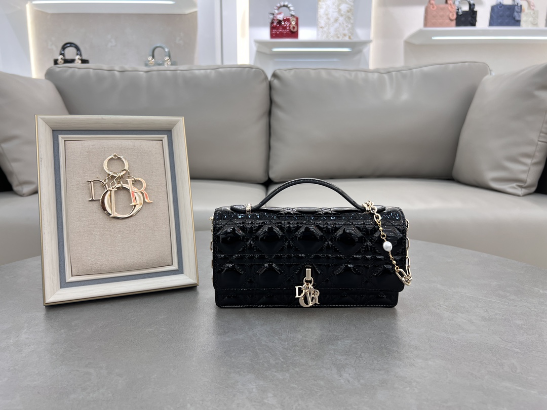 Lady Dior pearl clutch in black lambskin and patent leather.