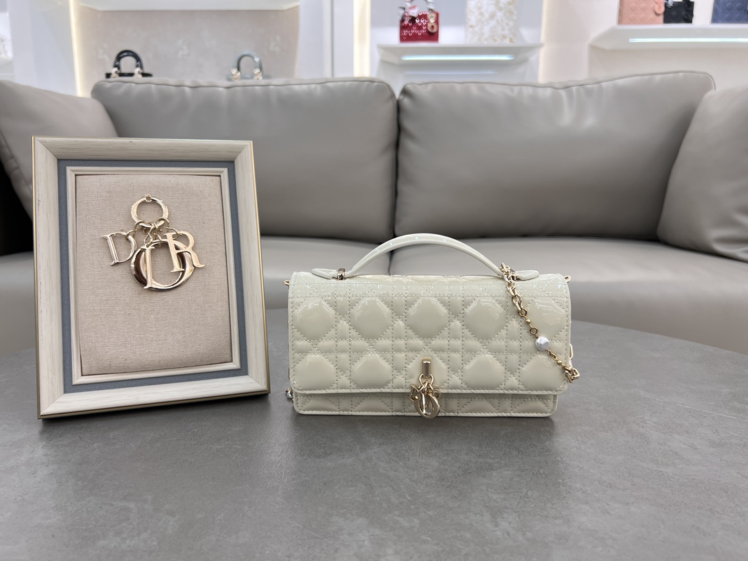Lady Dior pearl clutch in white lambskin and patent leather.