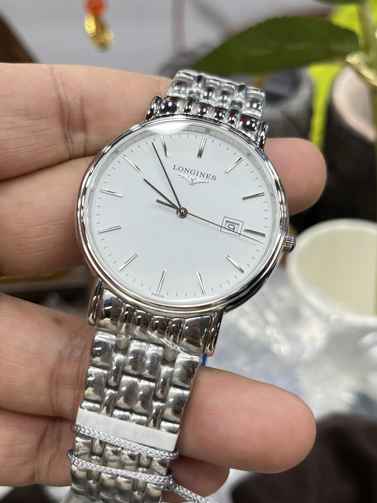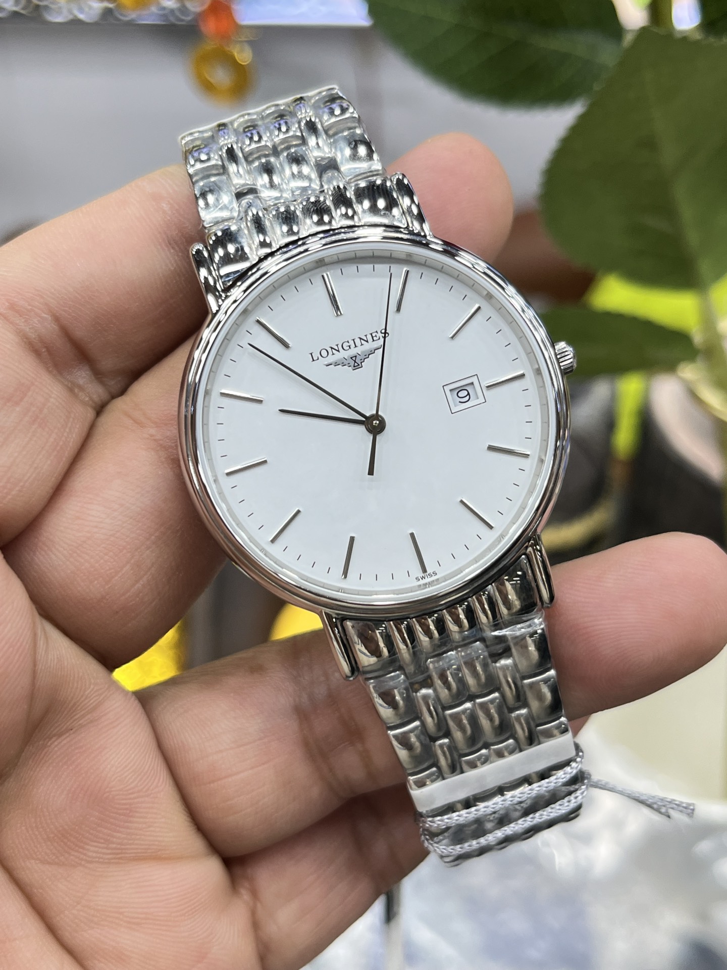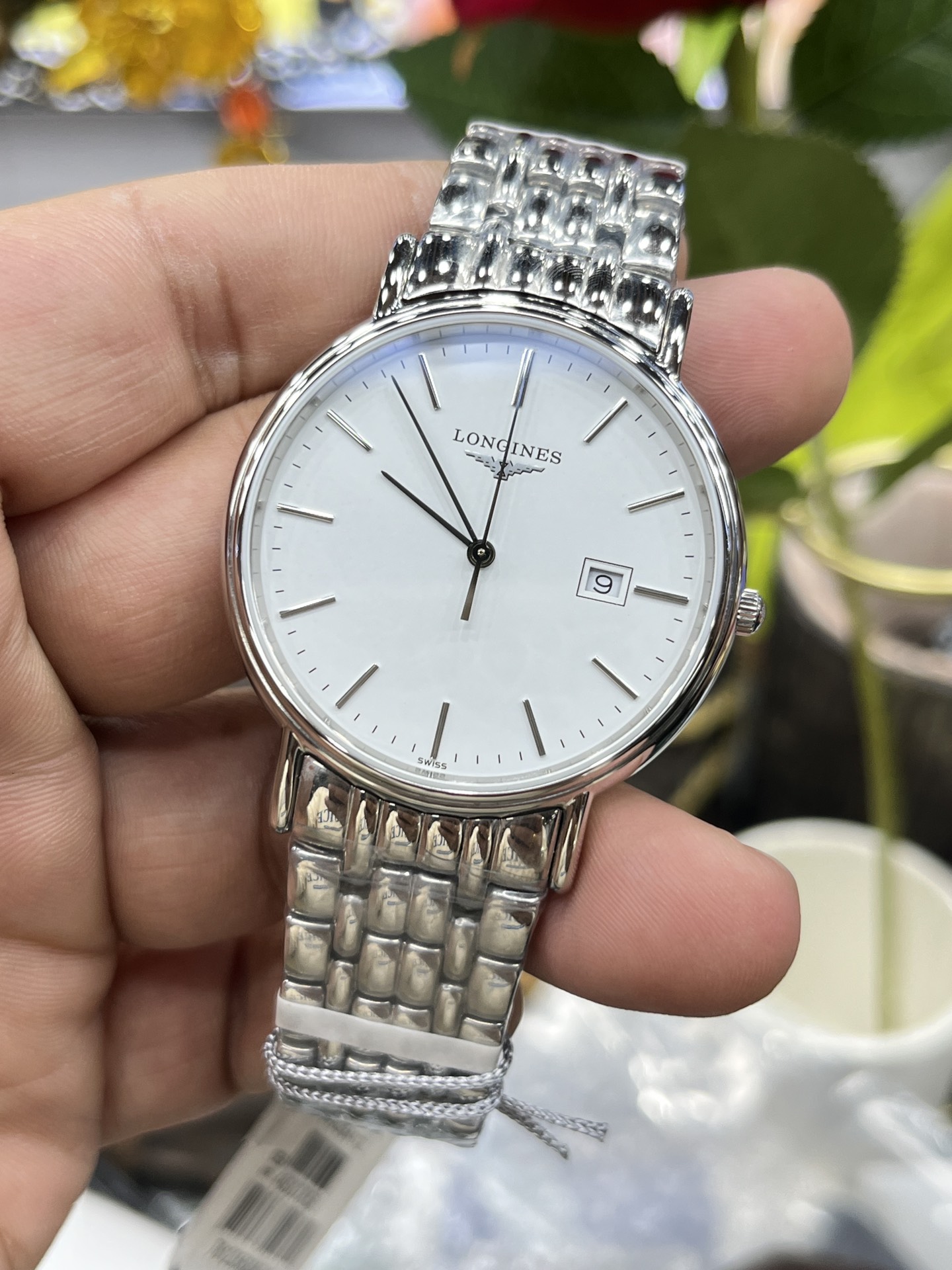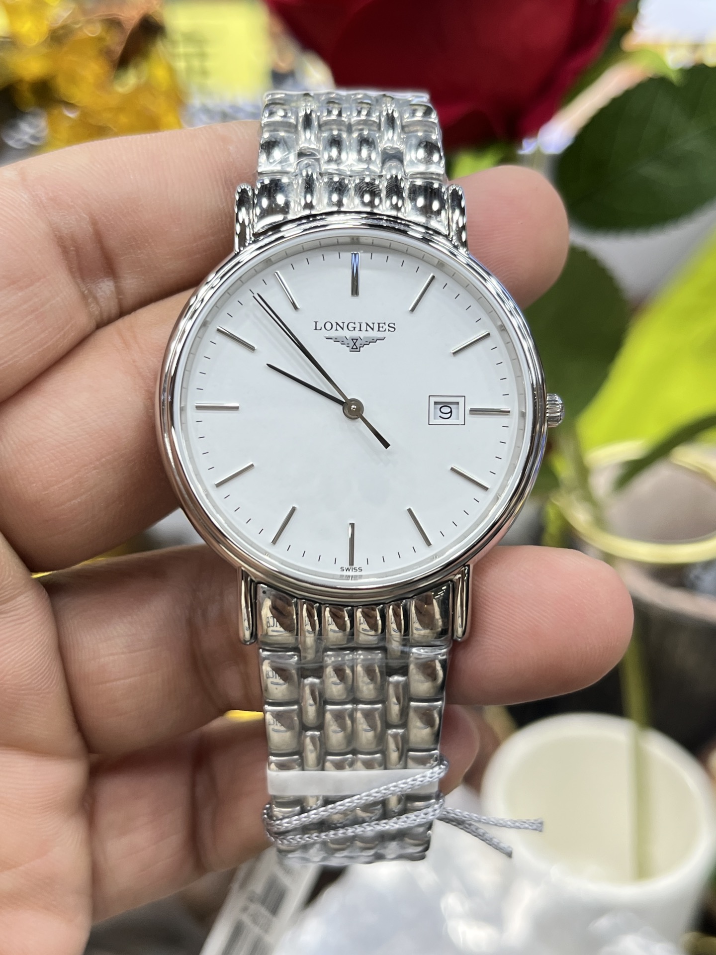 Longines La Grande Classique series, ultra-thin Swiss quartz, 316L steel case, sapphire crystal, water-resistant, classic design.