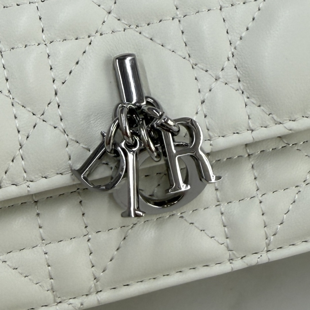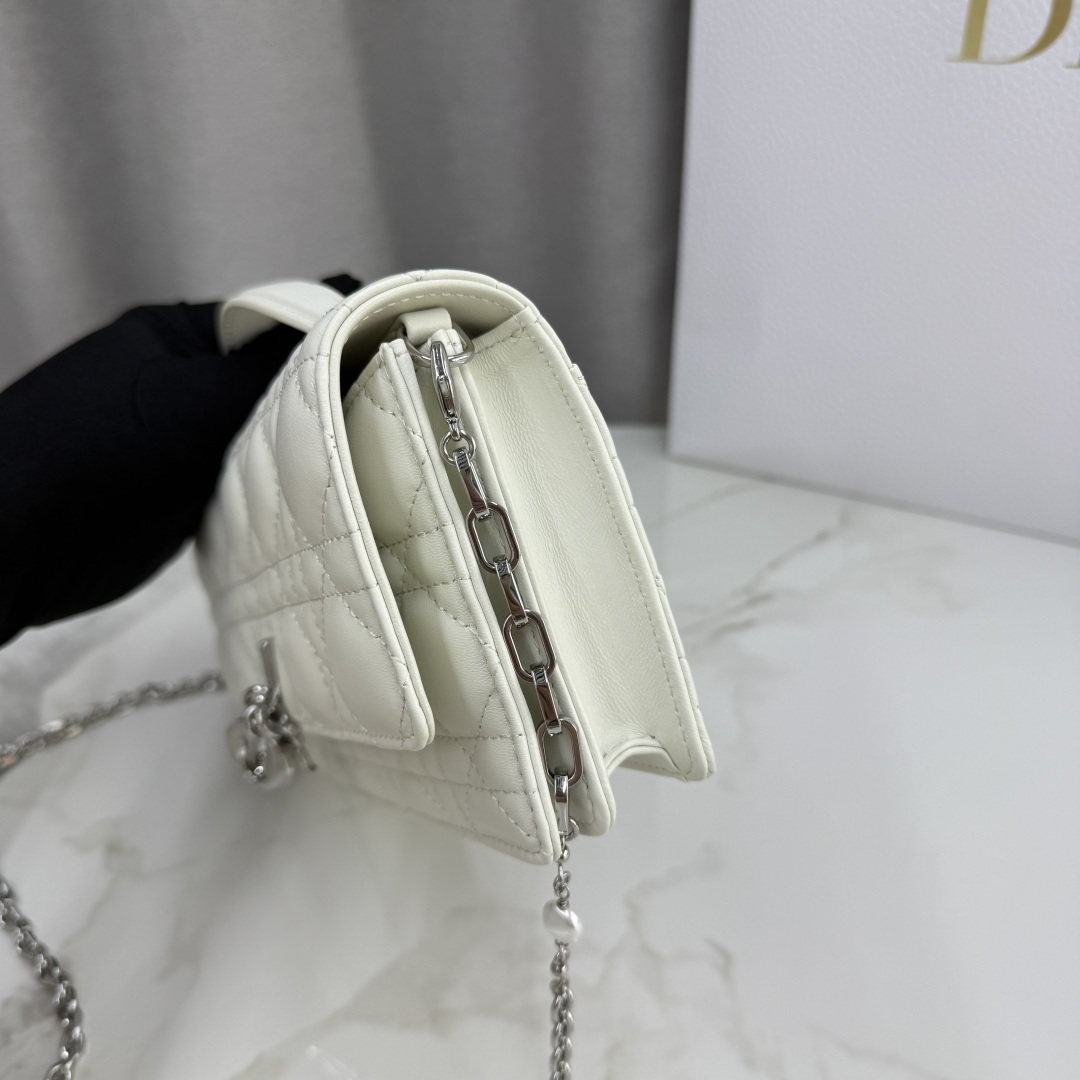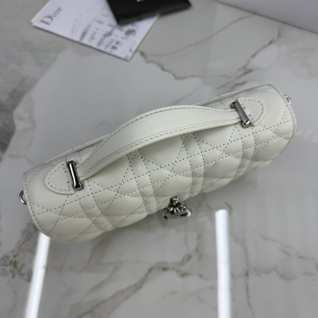 This clutch is the new season product, featuring a top handle, elegant and practical, enriching the Lady Dior collection. Meticulously crafted from lambskin leather, adorned with cannage pattern, the flap design is enhanced with a D.I.O.R. charm for elevated style. The practical design includes multiple compartments and card slots to organize various daily essentials, making it an ideal companion for both day and evening wear. Top handle, detachable chain embellished with pearls for added delicacy, can be carried by hand or cross-body. Dimensions: 21 x 11.5 x 4.5 cm