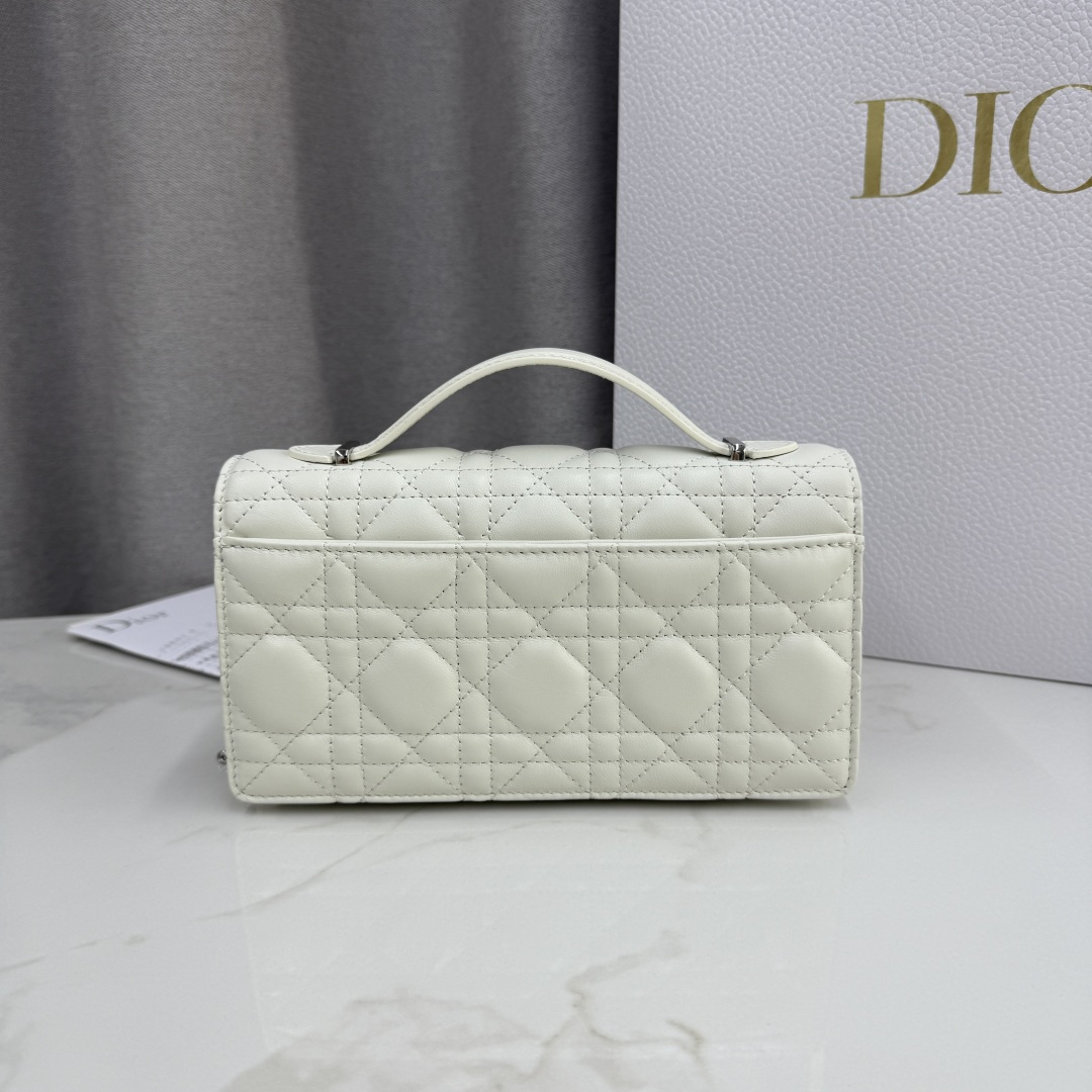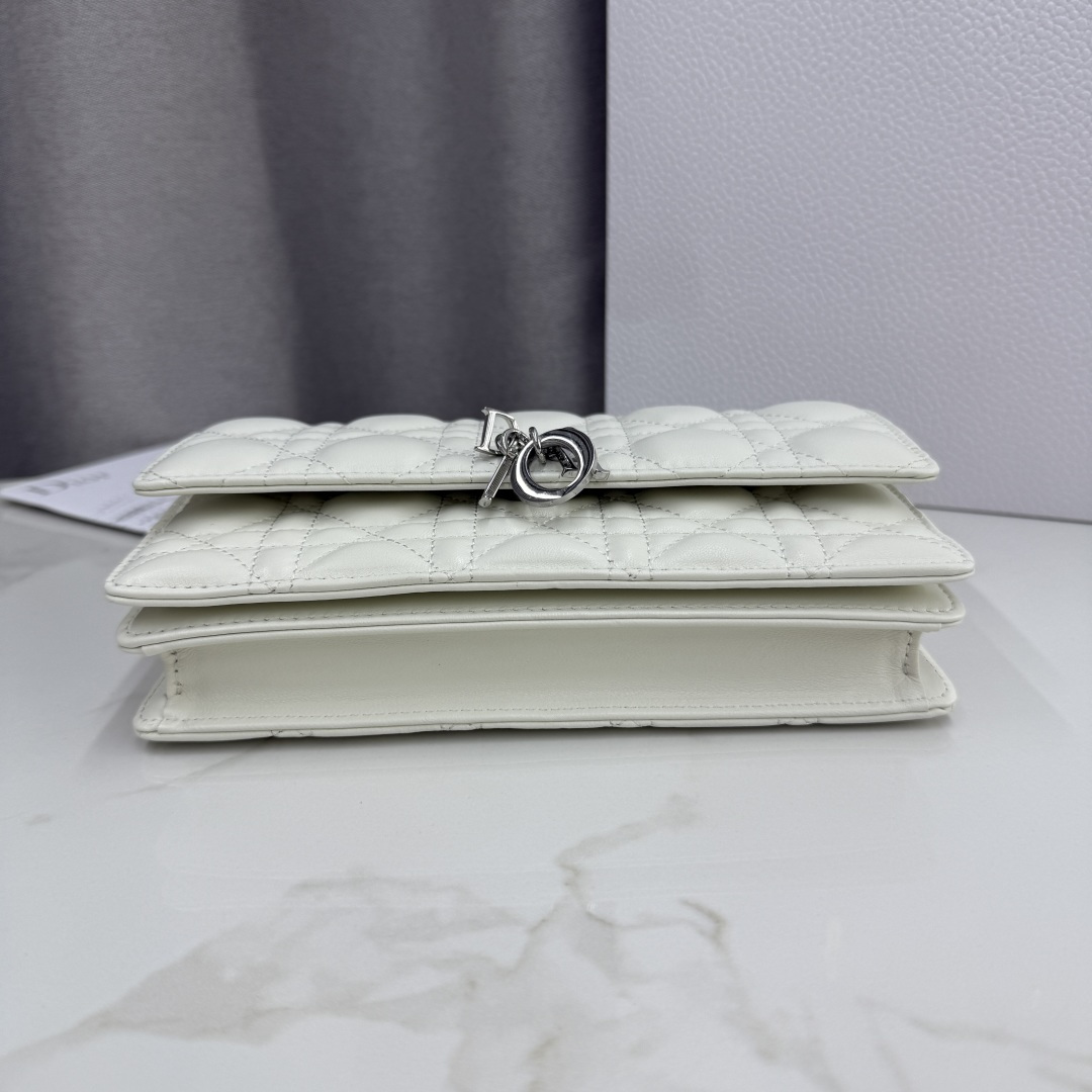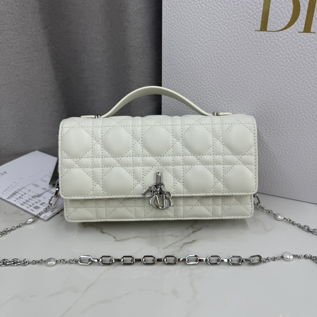 This clutch is the new season product, featuring a top handle, elegant and practical, enriching the Lady Dior collection. Meticulously crafted from lambskin leather, adorned with cannage pattern, the flap design is enhanced with a D.I.O.R. charm for elevated style. The practical design includes multiple compartments and card slots to organize various daily essentials, making it an ideal companion for both day and evening wear. Top handle, detachable chain embellished with pearls for added delicacy, can be carried by hand or cross-body. Dimensions: 21 x 11.5 x 4.5 cm