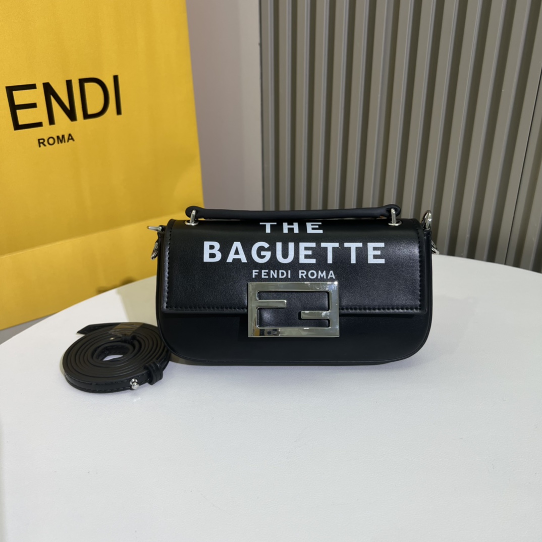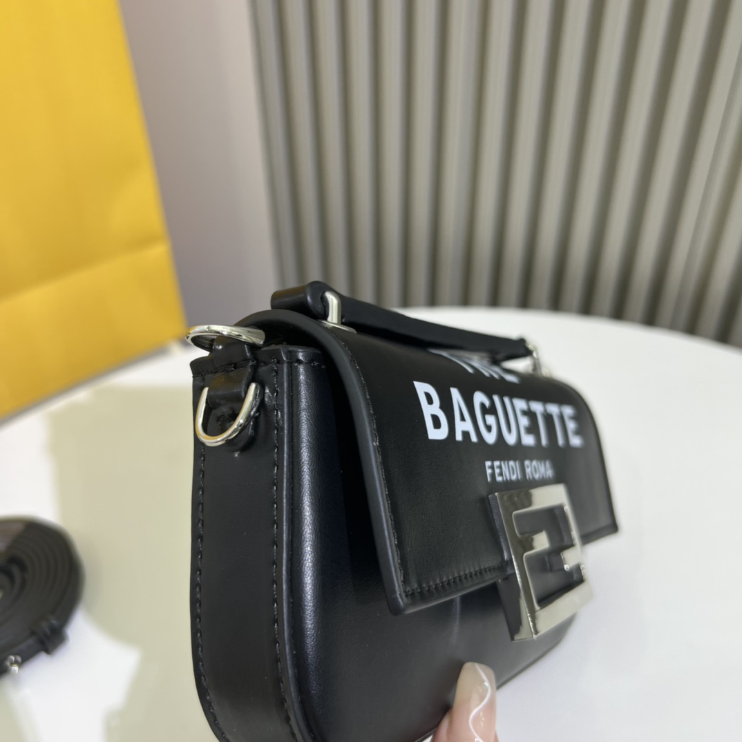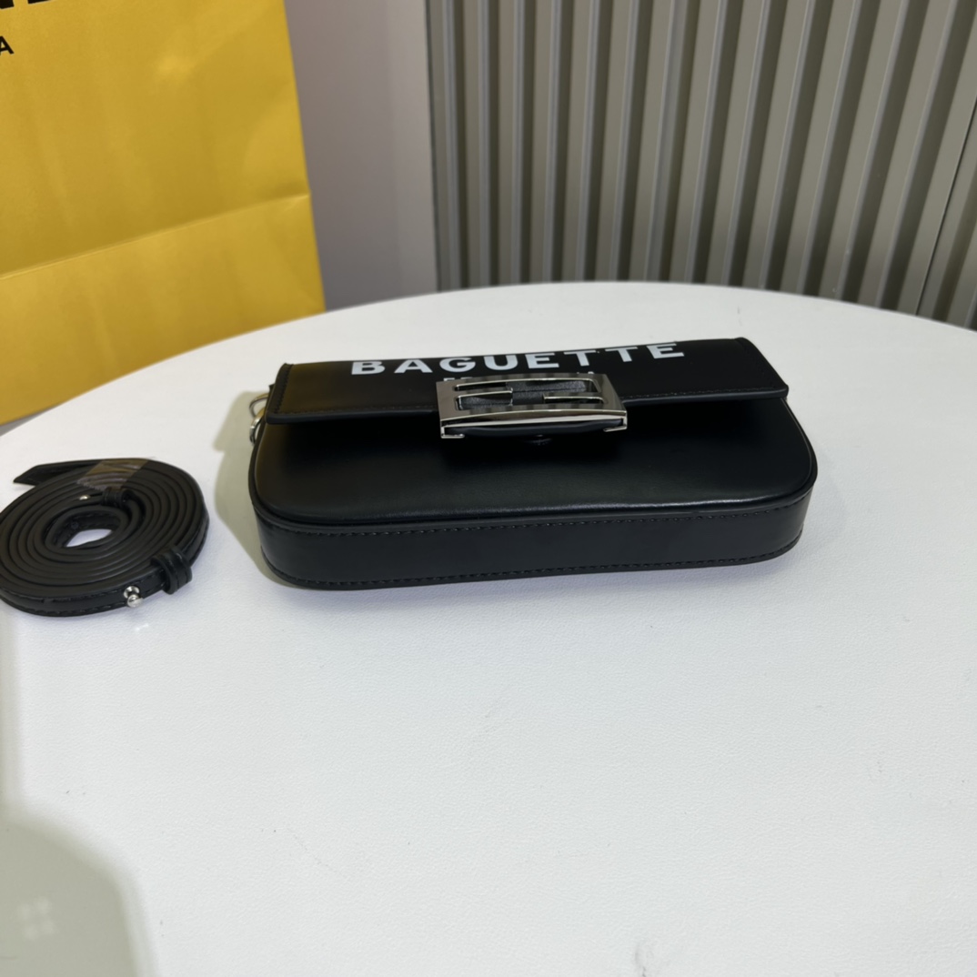 Factory direct sale, genuine leather manufacturing. The Baguette smartphone bag features a front flap design with a magnetic FF button closure. Detachable shoulder strap. As part of the FENDI by Marc Jacobs limited edition, this piece is crafted from cowhide Napa leather. Silver-finished metal hardware.