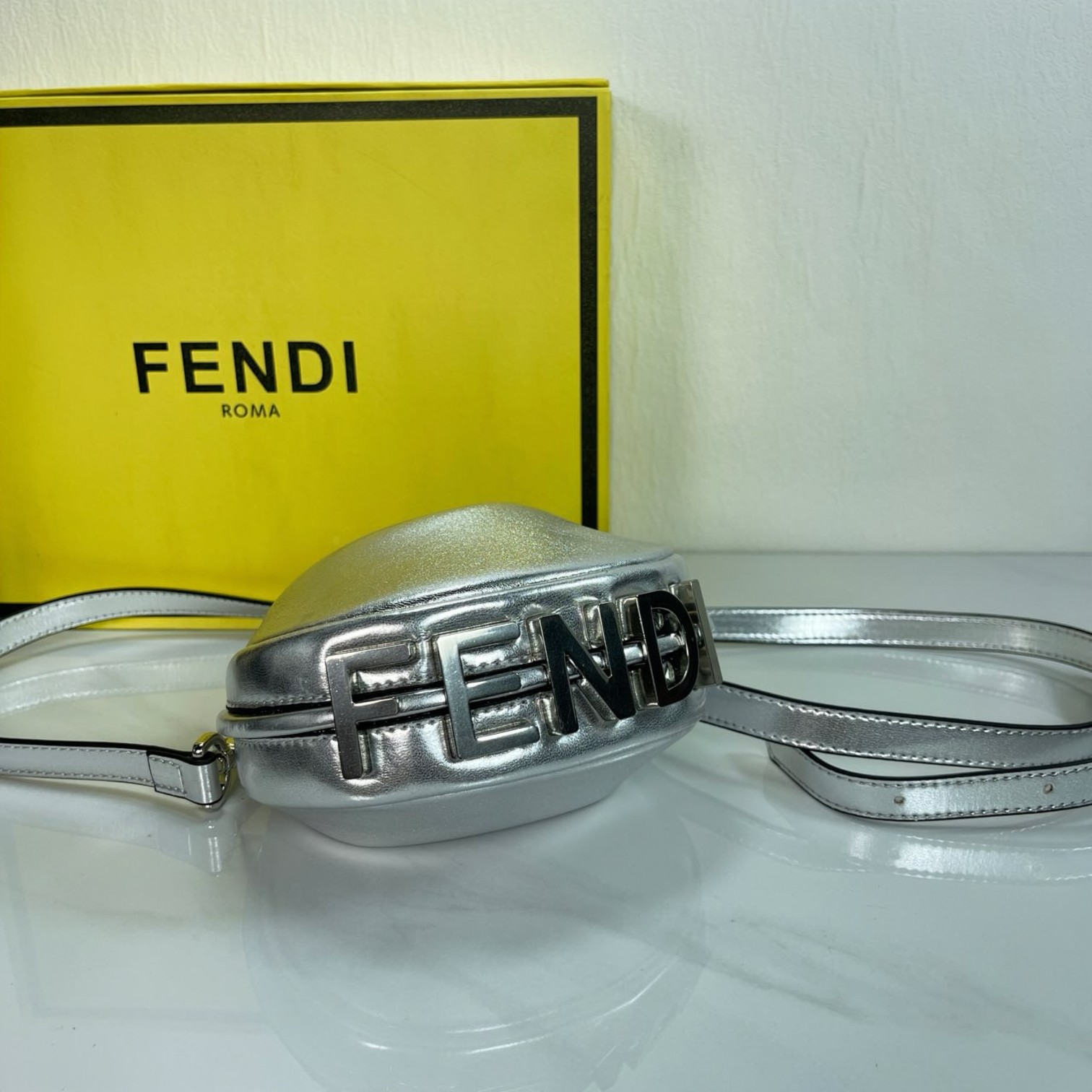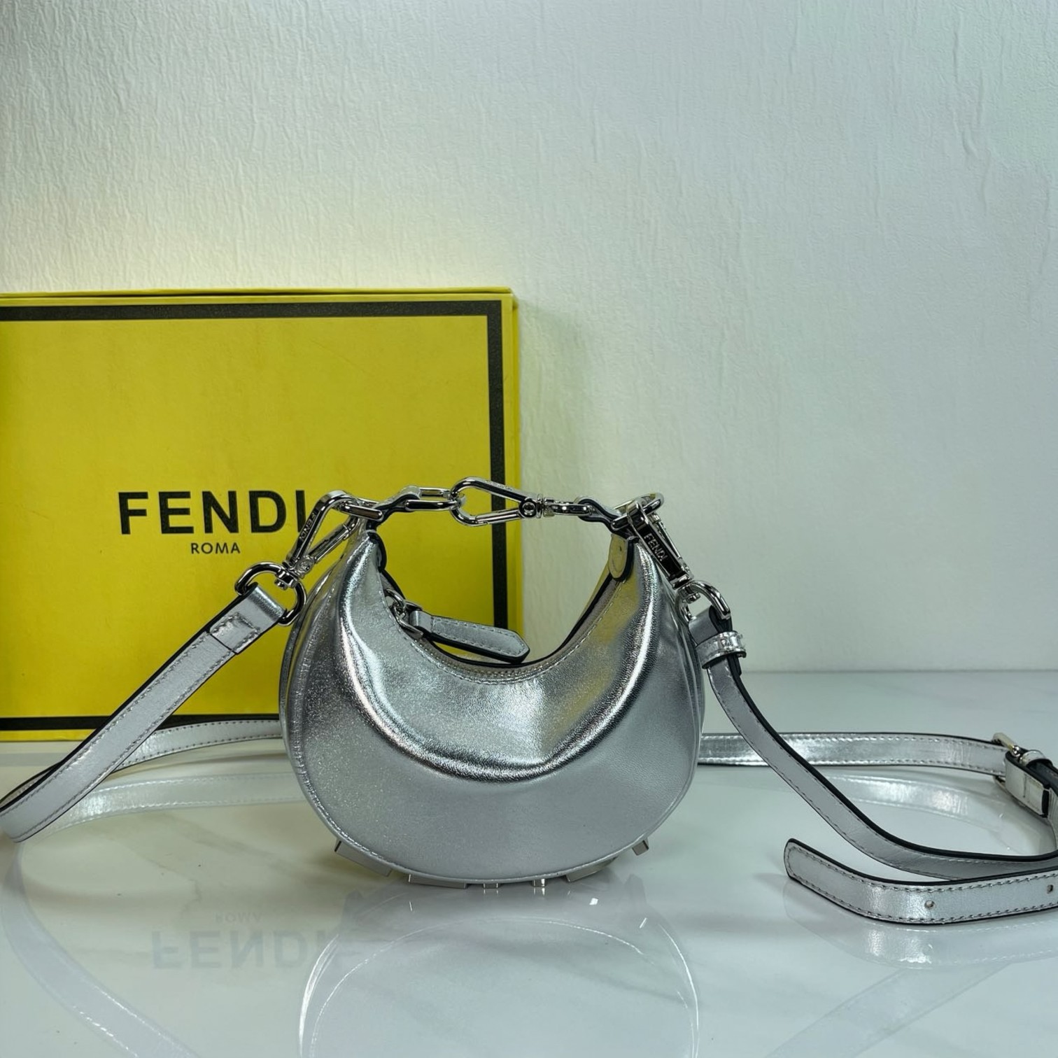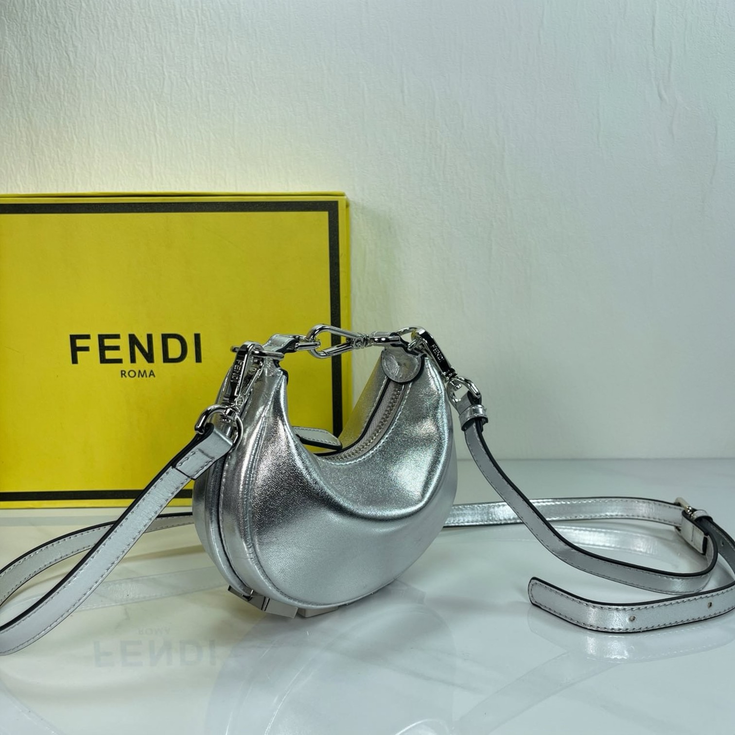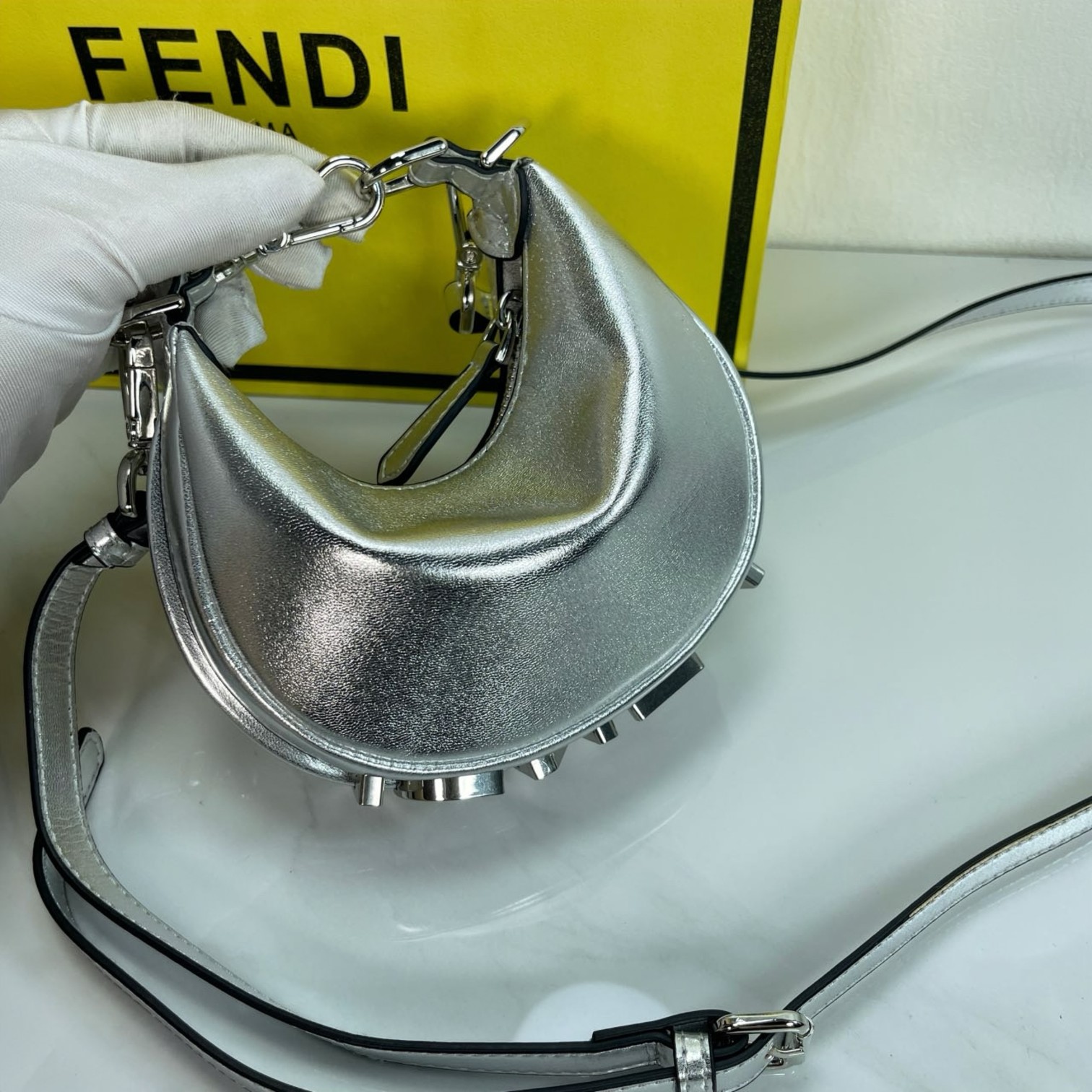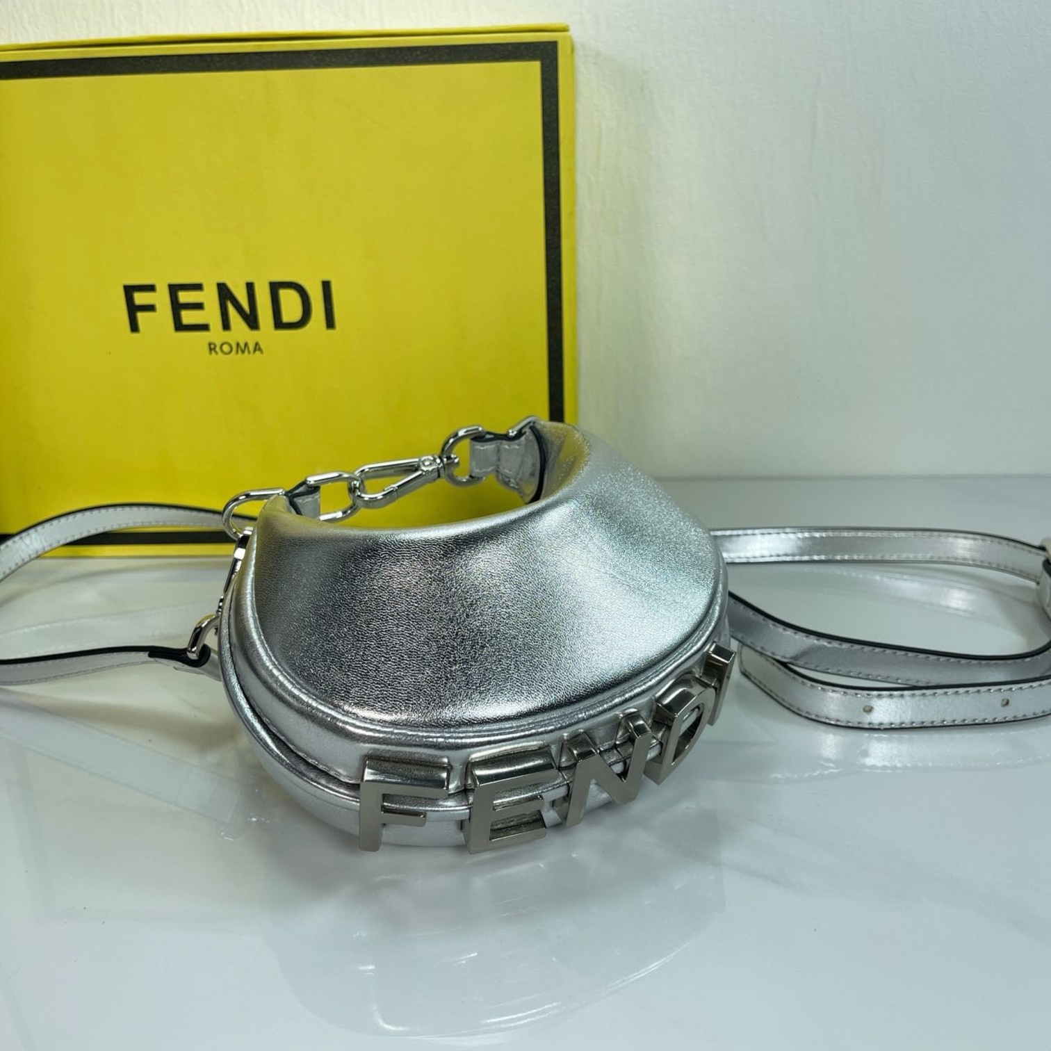Factory direct sales of the mini version FEND1praphy underarm bag, comes with a long shoulder strap, featuring a crescent moon design. The classic large metal logo [FEND1] is decorated at the bottom of the bag. The bag's contour fits the body's lines very well, and when carried under the arm, it is full of fashion sense—simply a walking grass-planting machine!