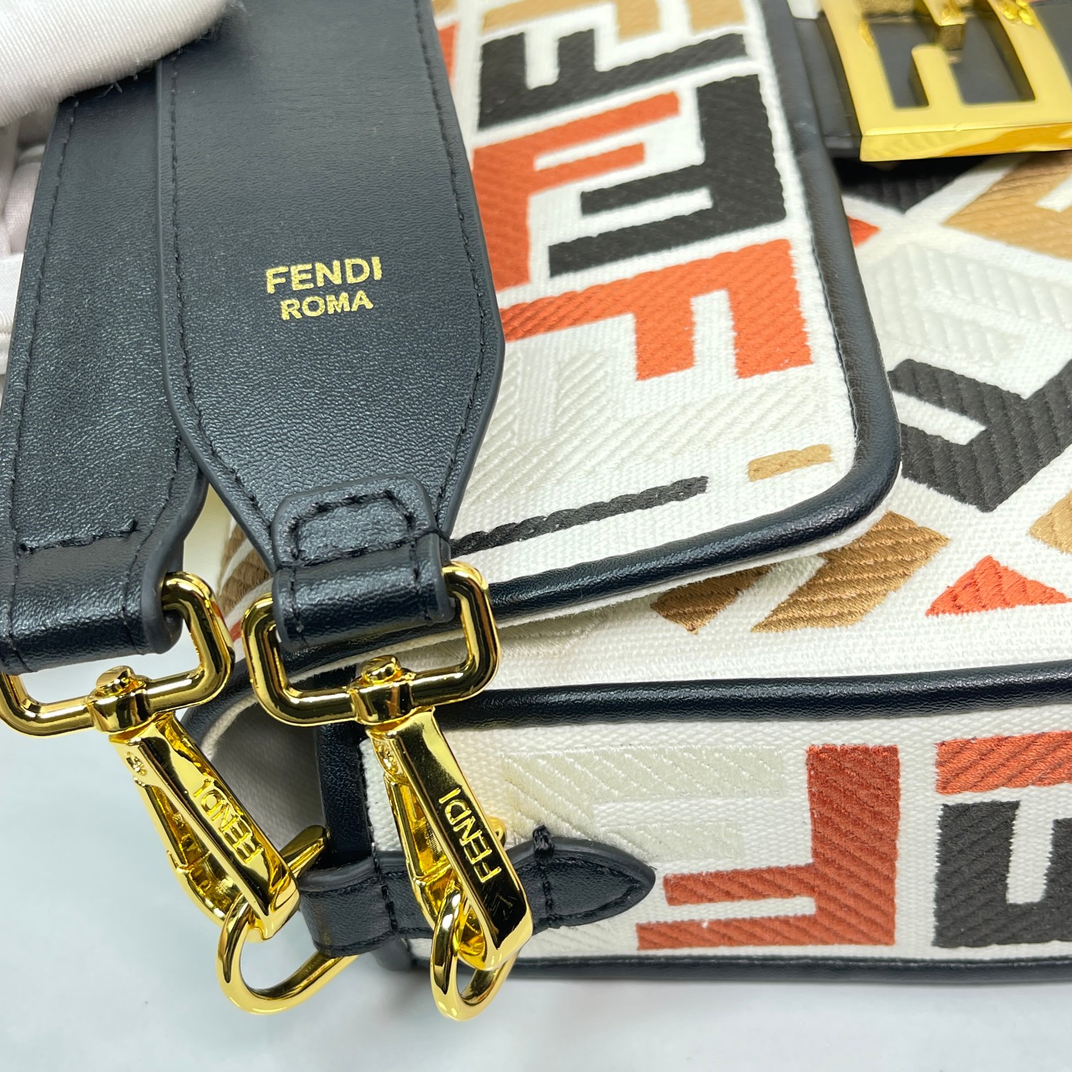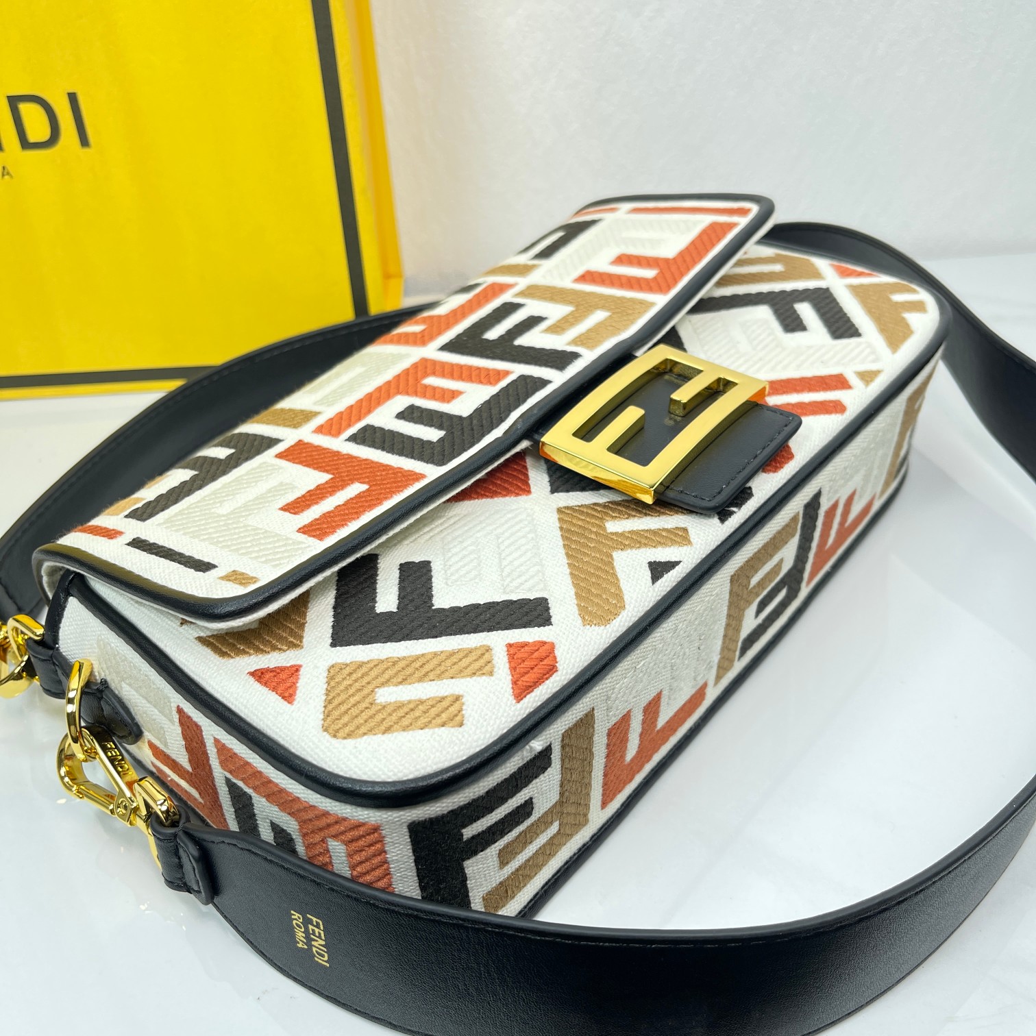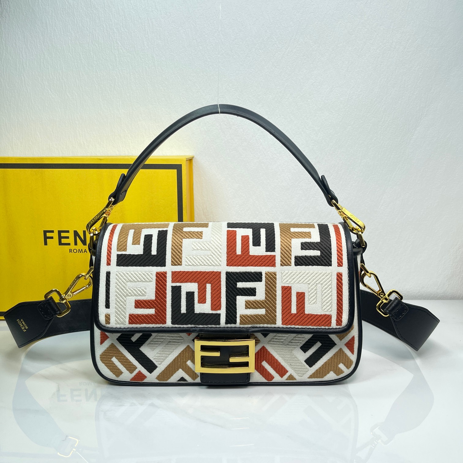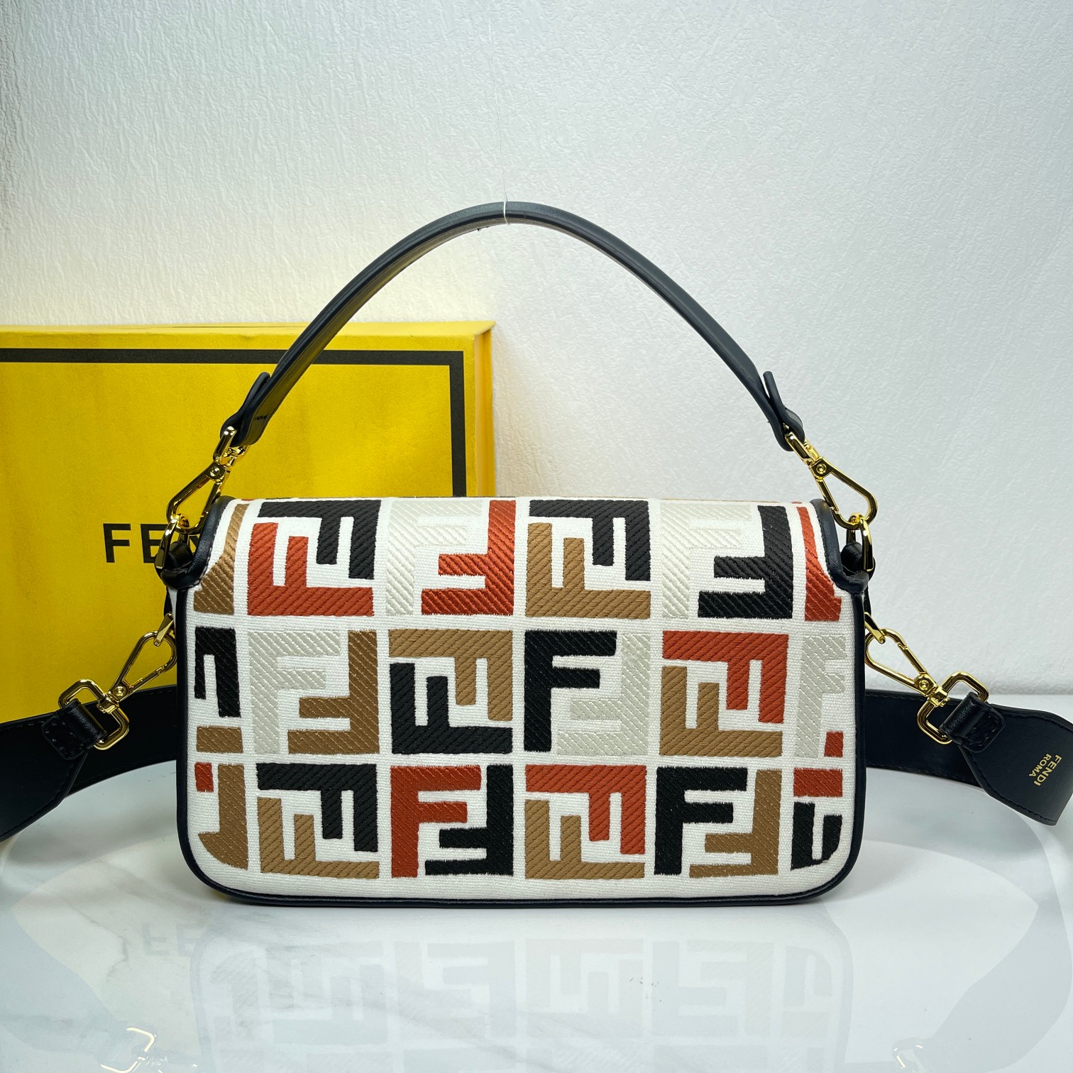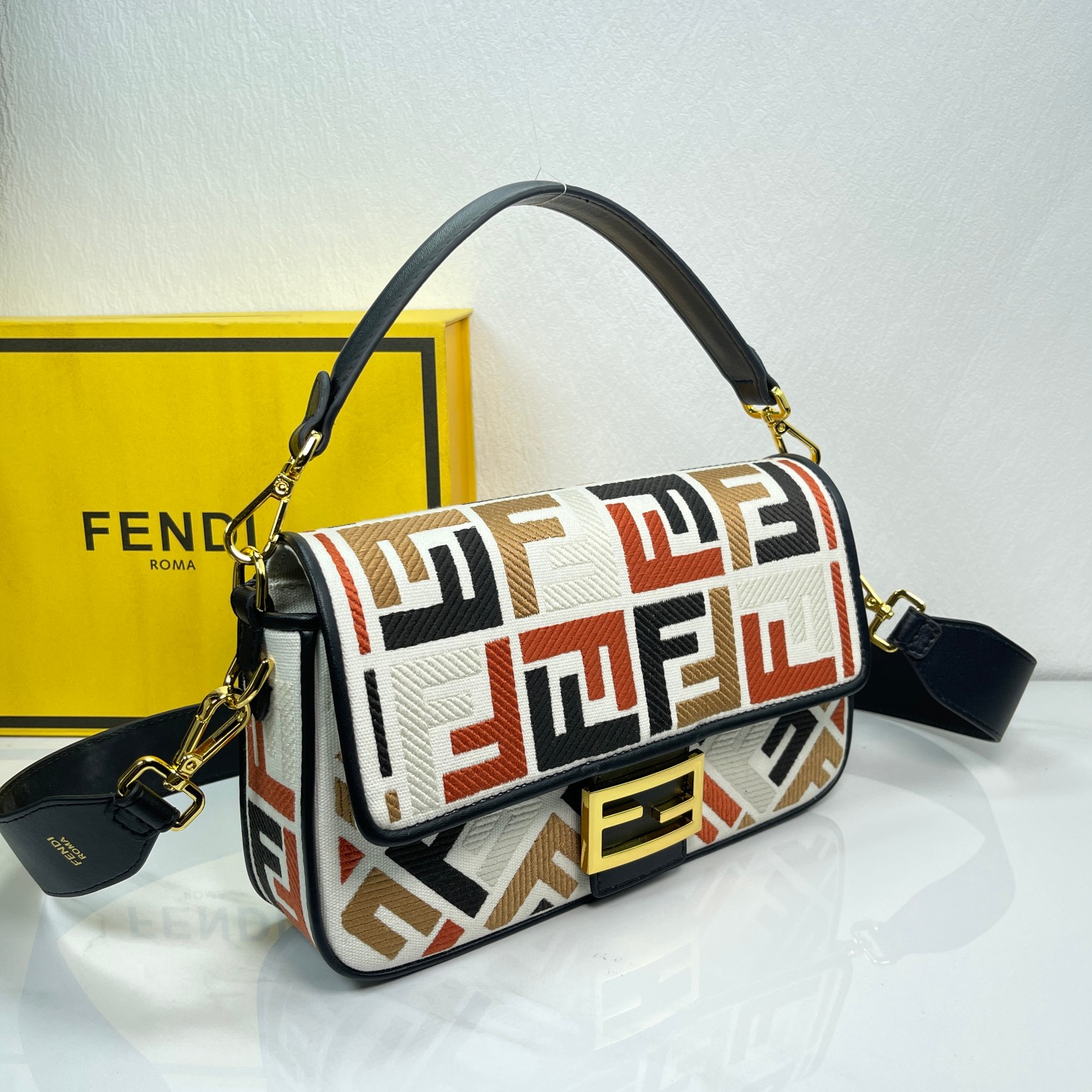 Factory Direct Sales New FENDI Baguette Classic Popular. Made with high-end canvas craftsmanship, the entire bag features double FF 3D embroidery for an unbeatable texture. Paired with exquisite piping and small color contrasts for a more fashionable and stylish look. The wide strap design and flap offer strong practicality. Small details are visible everywhere, truly love it~~ Size 26×5×15cm Style Number 2029