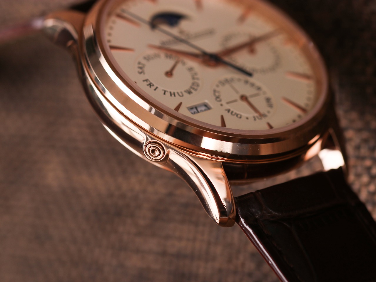 2. Day, Month, and Star (Annual Calendar)—The date (3 o'clock position), month (6 o'clock position), and day of the week (9 o'clock position) all operate normally and can be manually adjusted (the date is adjusted bidirectionally by pulling out the second crown position, the month is adjusted via the hidden button at 8 o'clock, and the day of the week can be adjusted by moving the hands).