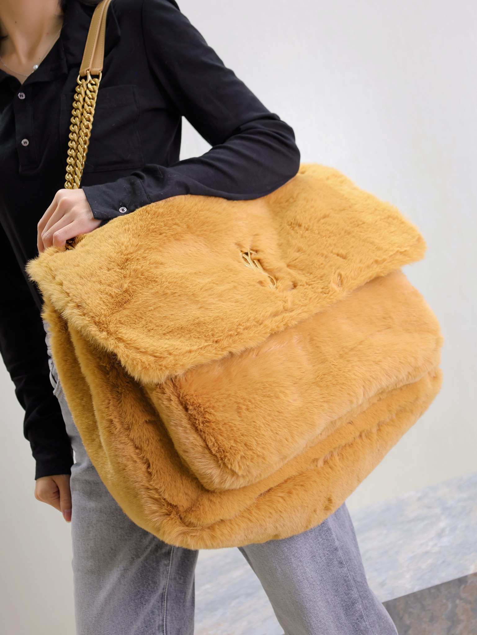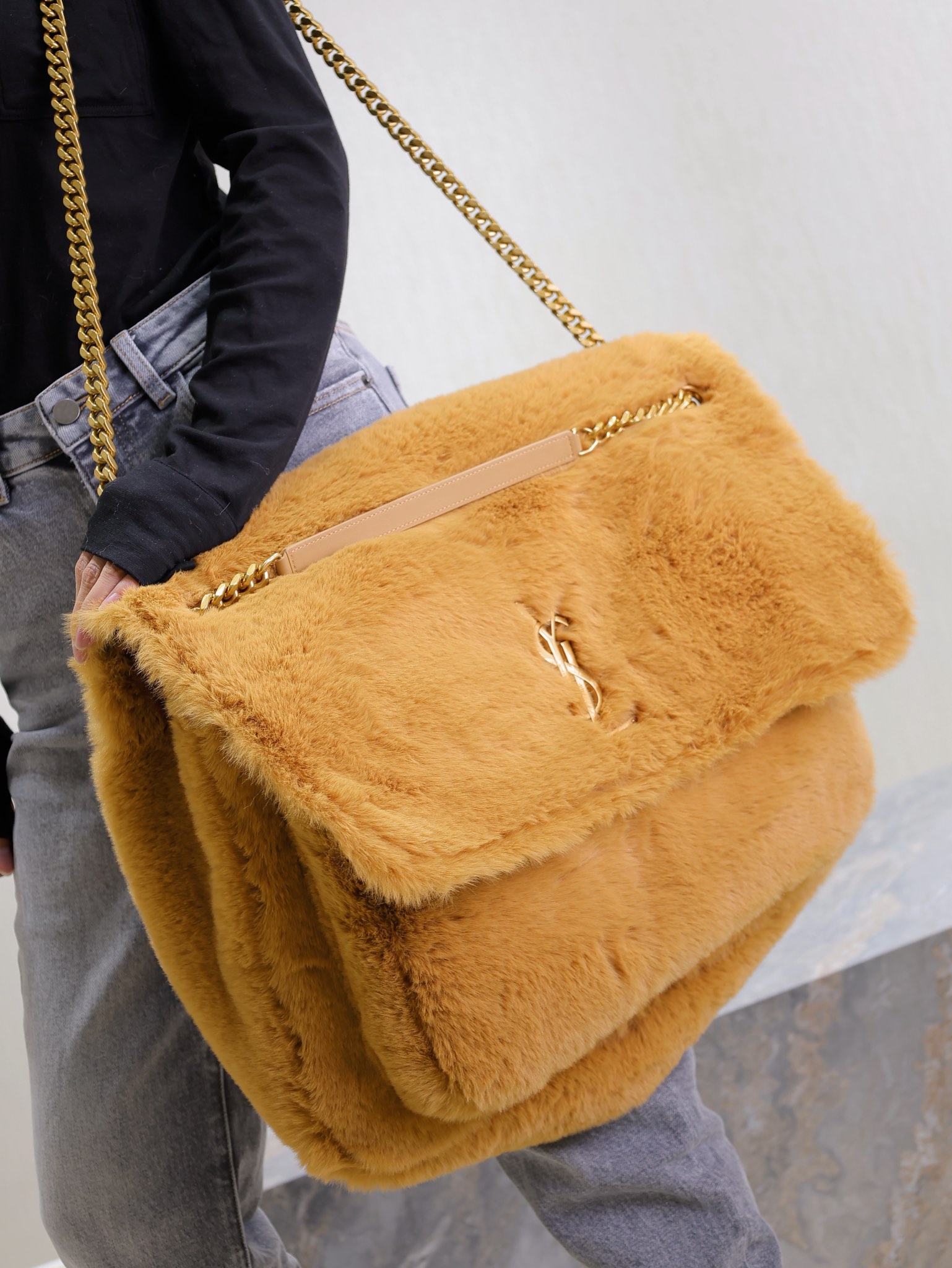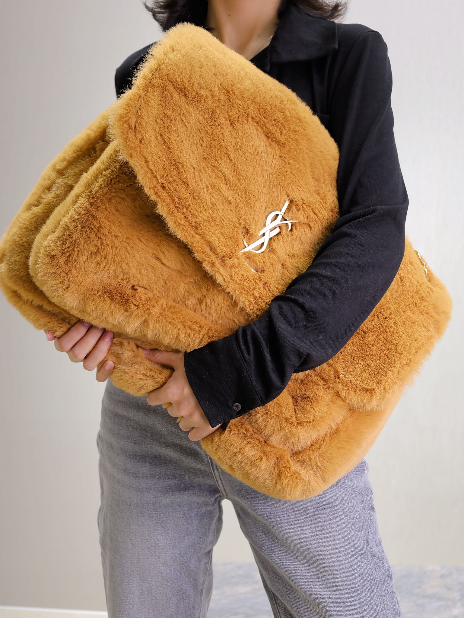 Niki oversize A bronze metal logo is embedded in the fluffy and soft rabbit fur Presenting a lazy and sexy vibe
