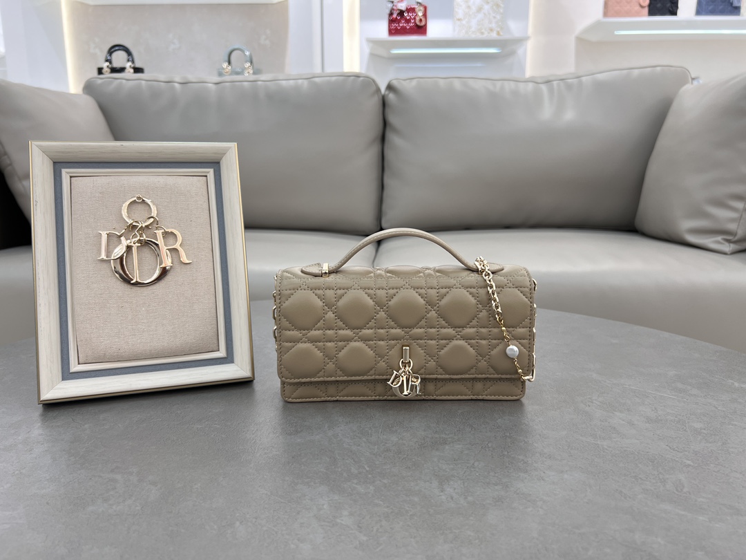 Lady Dior pearl clutch in apricot lambskin.