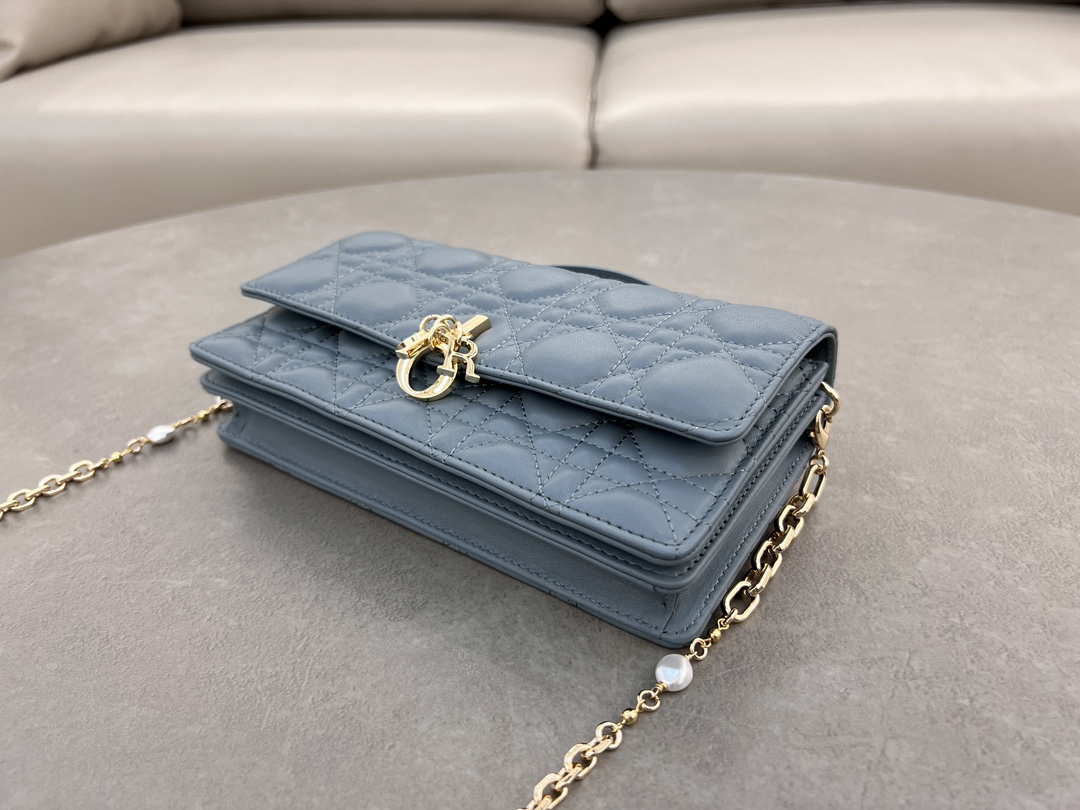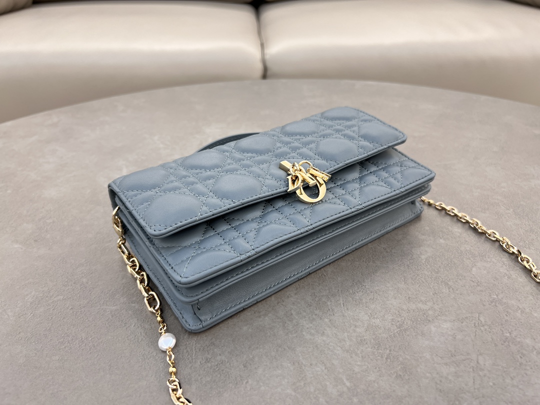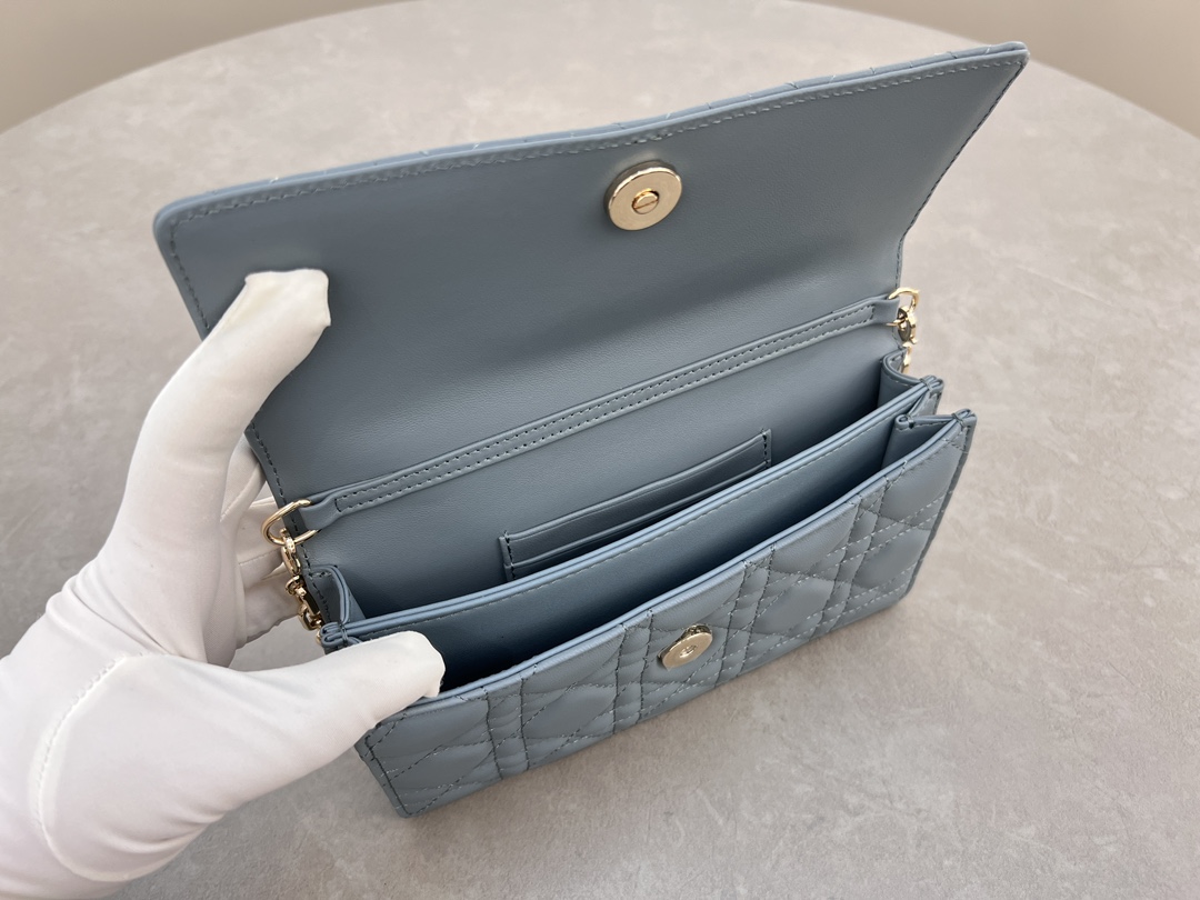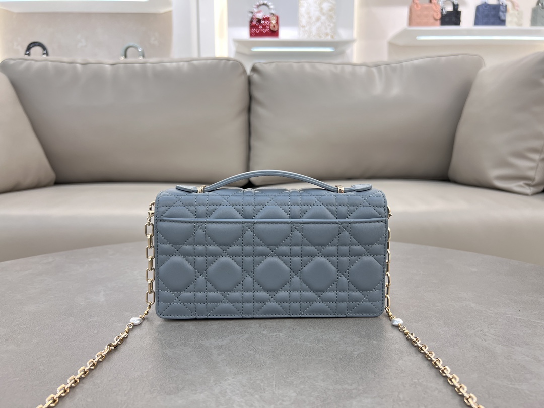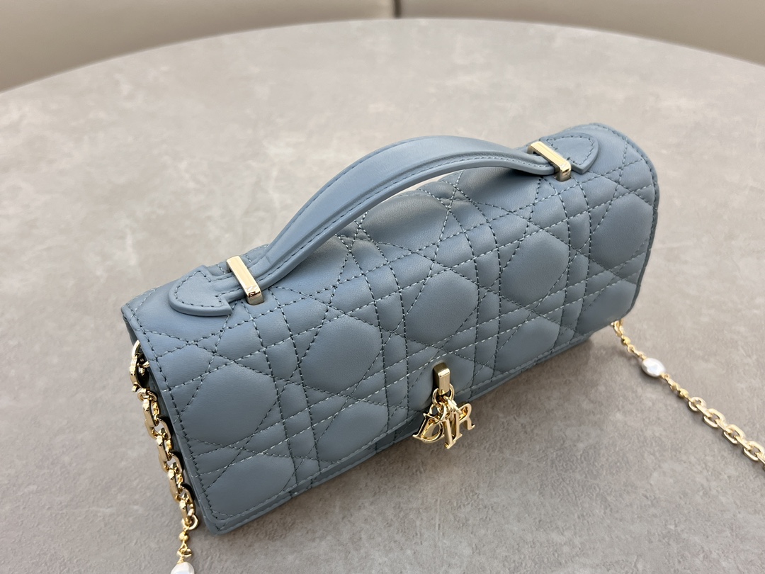This clutch is the new season's latest, featuring a top handle, elegant and practical, enriching the Lady Dior collection. Meticulously crafted from lamb leather, adorned with cannage pattern, flap design with D.I.O.R. charm enhances the style. Practical design with multiple compartments and card slots, can hold various daily essentials, ideal for both day and evening wear. Top handle, detachable chain embellished with pearls for added refinement, can be carried by hand or cross-body. Dimensions: 21 x 11.5 x 4.5 cm