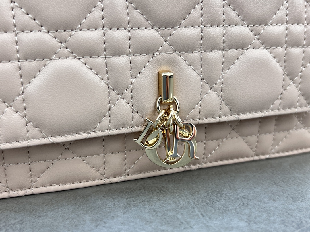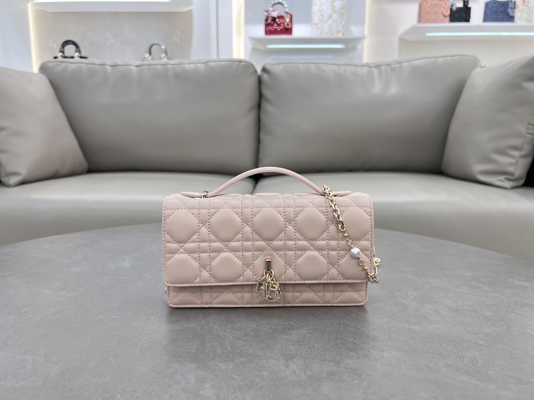 This clutch is the new season's latest, featuring a top handle, elegant and practical, enriching the Lady Dior collection. Meticulously crafted from lambskin leather, adorned with cannage pattern, flap design with D.I.O.R. charm enhances the style. Practical design with multiple compartments and card slots to store various daily essentials, ideal for both day and evening wear. Top handle, detachable chain embellished with pearls for added refinement, can be carried by hand or cross-body. Dimensions: 21 x 11.5 x 4.5 cm