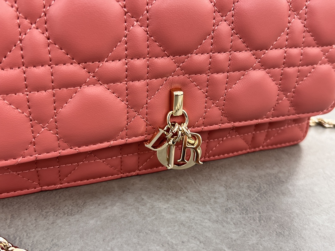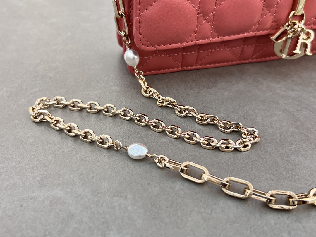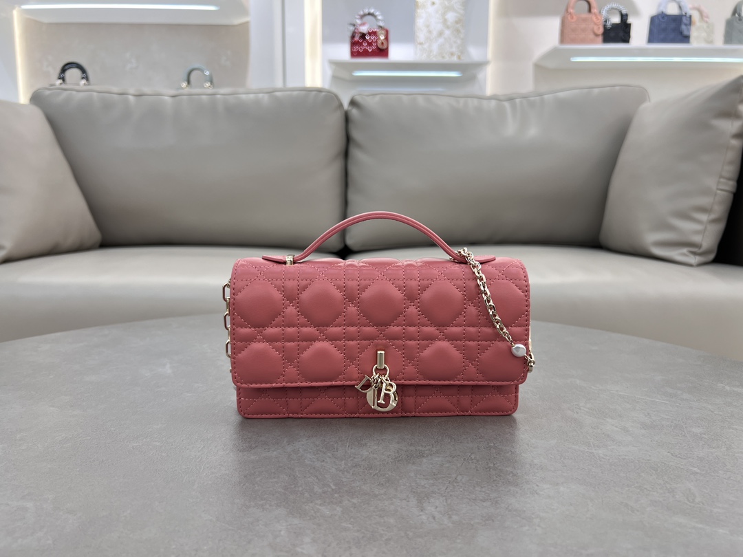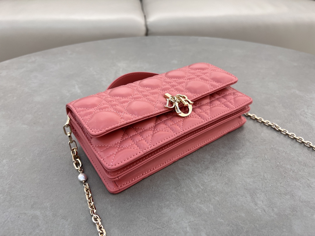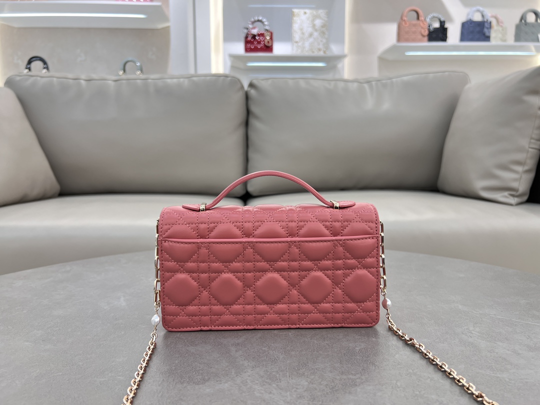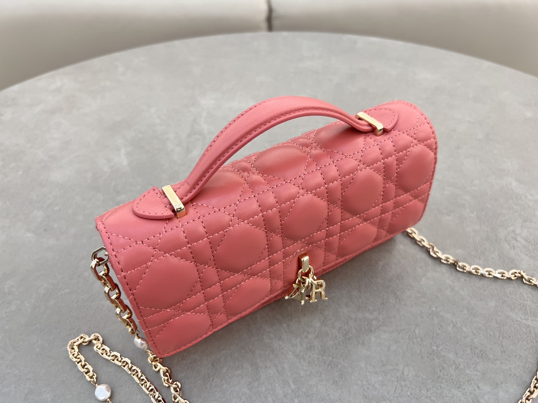 This clutch is the new season's latest, featuring a top handle, elegant and practical, enriching the Lady Dior collection. Meticulously crafted from lambskin leather, adorned with cannage pattern, flap design with D.I.O.R. charm enhances the style. Practical design with multiple compartments and card slots, can hold various daily essentials, ideal for both day and evening wear. Top handle, detachable chain embellished with pearls for added refinement, can be carried by hand or cross-body. Dimensions: 21 x 11.5 x 4.5 cm