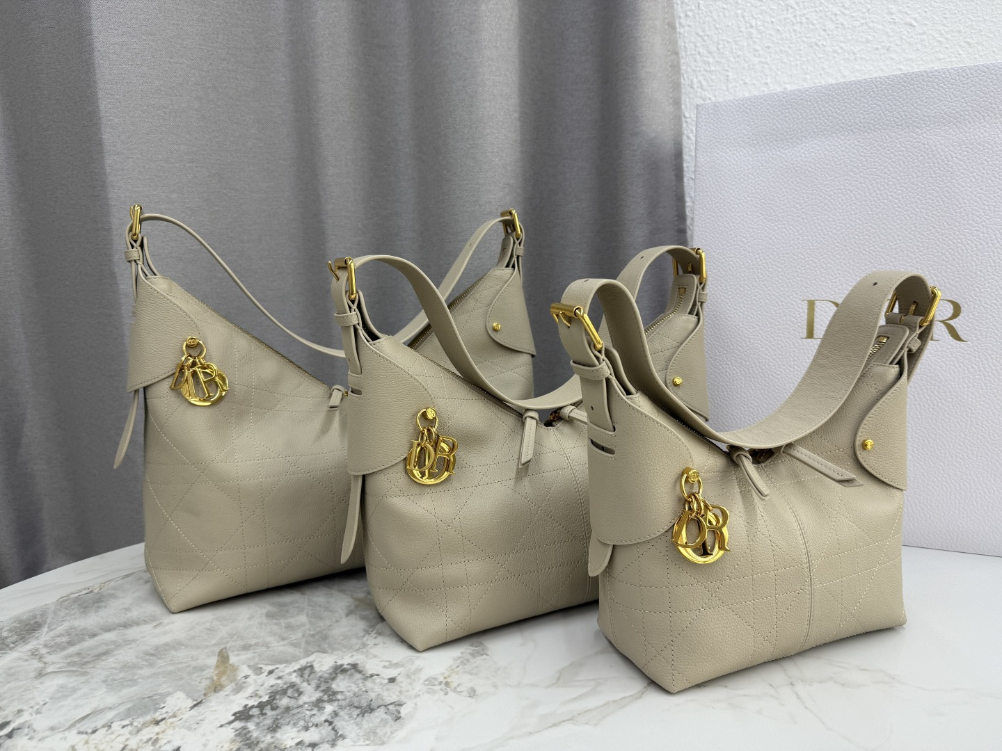 This Dior Voyage handbag is part of the early spring 2026 ready-to-wear collection, combining soft lines and elegant details to create a harmonious dumpling-shaped silhouette. Meticulously crafted from rouge riz calfskin, it features flat, oversized cannage stitching, offering a fresh interpretation of Dior's classic pattern. The soft silhouette is enhanced with antique gold-finish metal D.I.O.R. charms and meticulously crafted leather accents, adding sophistication and structure to the design. The main compartment is secured with a practical two-way zip closure. In a large size, it comes with a top handle and an adjustable clasp, allowing it to be carried on the shoulder, making it an ideal companion for everyday styling.