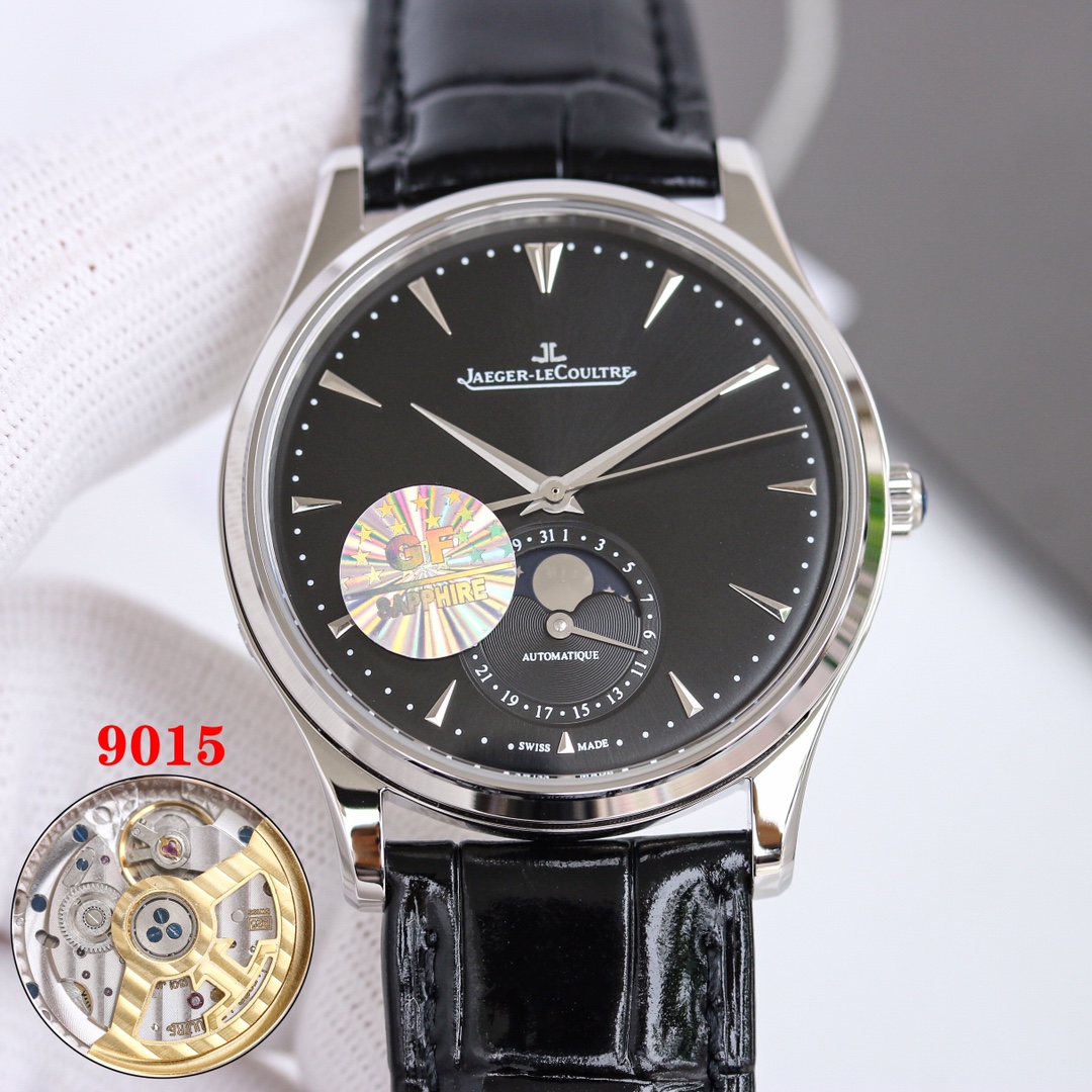 H8 Jaeger-LeCoultre Master Series (Classic Moon Phase) equipped with Cal2824 modified/9015 modified movement, diameter 39mm! 316 stainless steel perfectly replicates the original master, transparent sapphire crystal glass, exquisite yin-yang mother-child hands, flash silver wire panel, imported platinum scales from Taiwan, Italian calfskin and original butterfly clasp, all showcasing elegance and delicacy comparable to genuine boutique products! Meticulously crafted, enjoy luxury, exclusive quality.