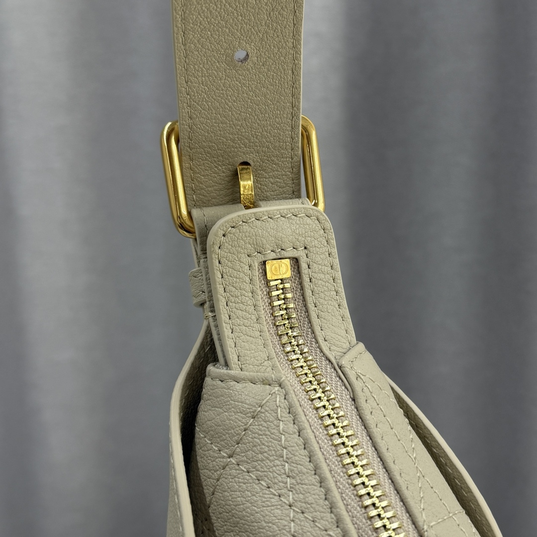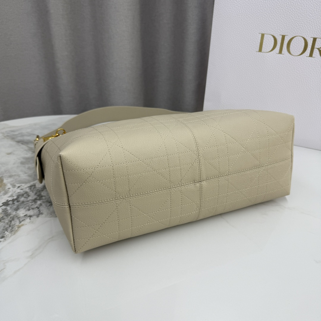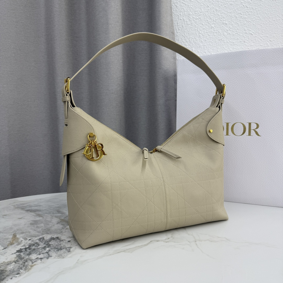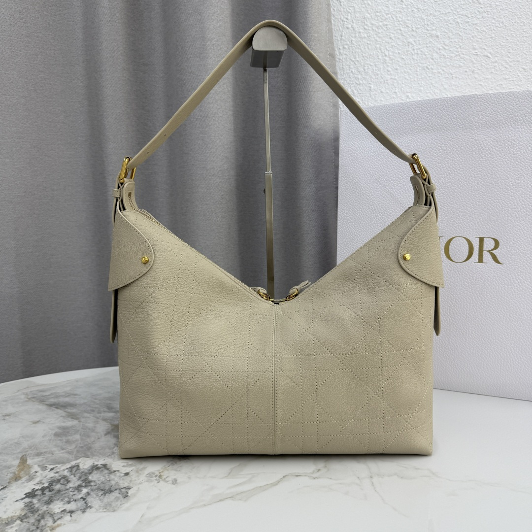 This Dior Voyage handbag is a new addition to the early spring 2026 ready-to-wear collection. It combines soft lines and elegant details to create a harmonious dumpling bag silhouette. Meticulously crafted from rouge grained calfskin, it features flat, oversized cannage stitching, offering a fresh interpretation of Dior's classic pattern. The soft silhouette is enhanced with an antique gold-finished metal D.I.O.R. charm and meticulously crafted leather accents, adding sophistication and structure to the shape. The main compartment is secured with a practical and safe two-way zipper closure. The large size features a top handle with an adjustable clasp, allowing it to be carried on the shoulder, making it an ideal companion for everyday styling.