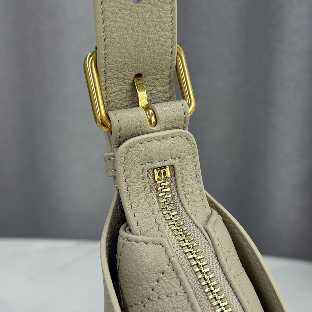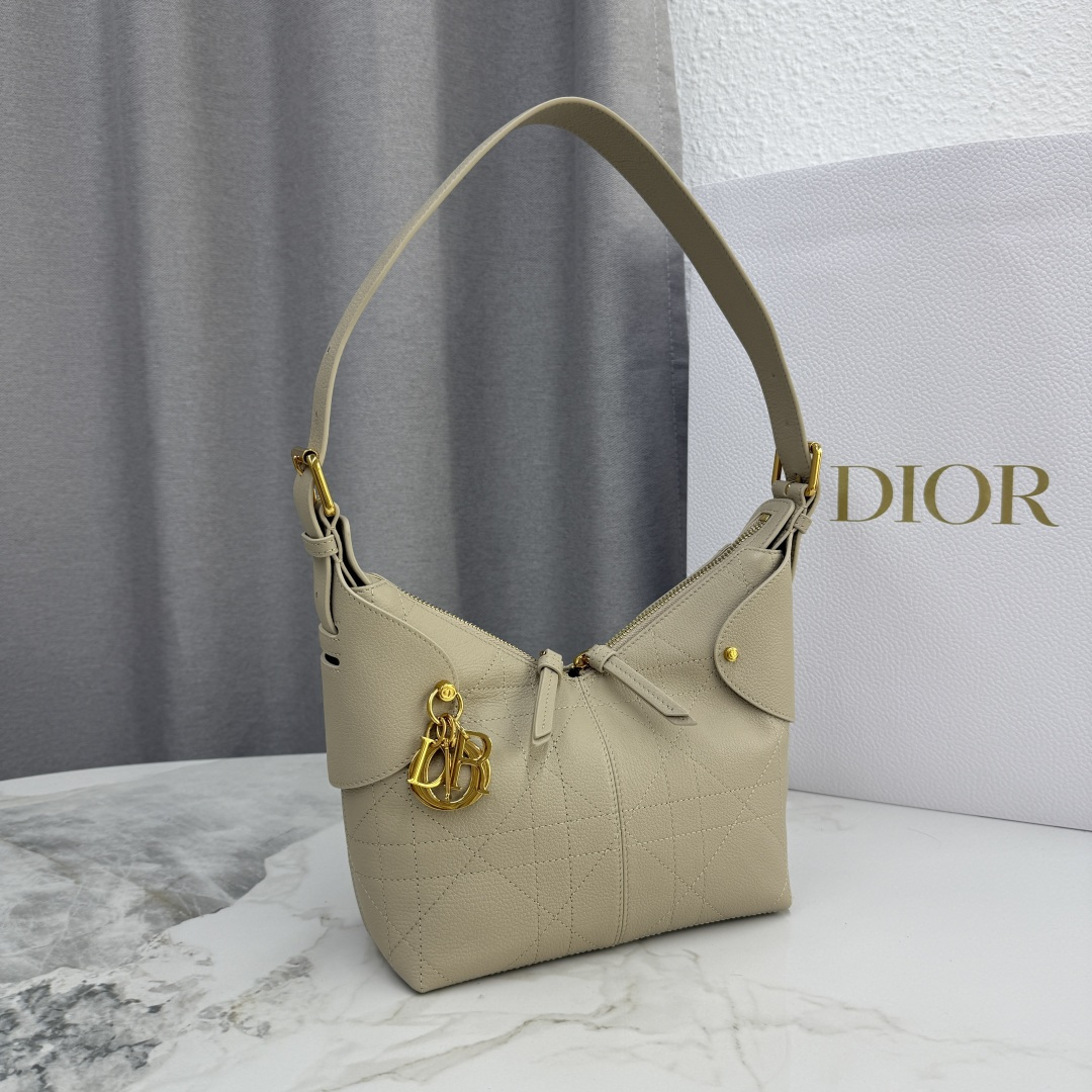 This Dior Voyage handbag is part of the early spring 2026 ready-to-wear collection, combining soft lines and elegant details to create a harmonious silhouette. Meticulously crafted from rouge riz calfskin, it features flat, oversized cannage stitching, offering a fresh interpretation of Dior's classic pattern. The soft silhouette is enhanced with a vintage gold-finished metal D.I.O.R. charm and meticulously crafted leather accents, adding structure and sophistication. The main compartment is secured with a practical and safe two-way zipper closure. The small size, with a top handle and an adjustable clasp, can be carried on the shoulder, making it an ideal companion for everyday styling.