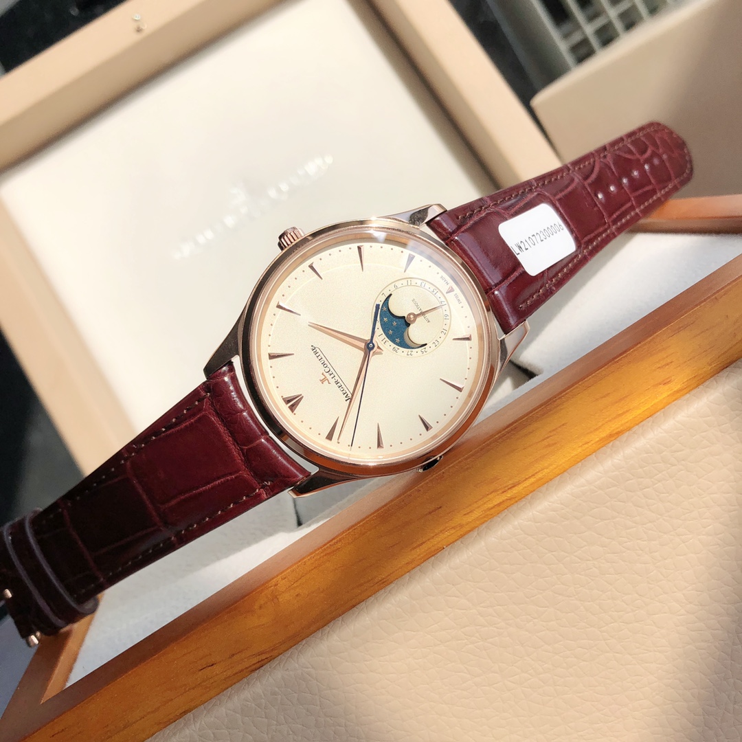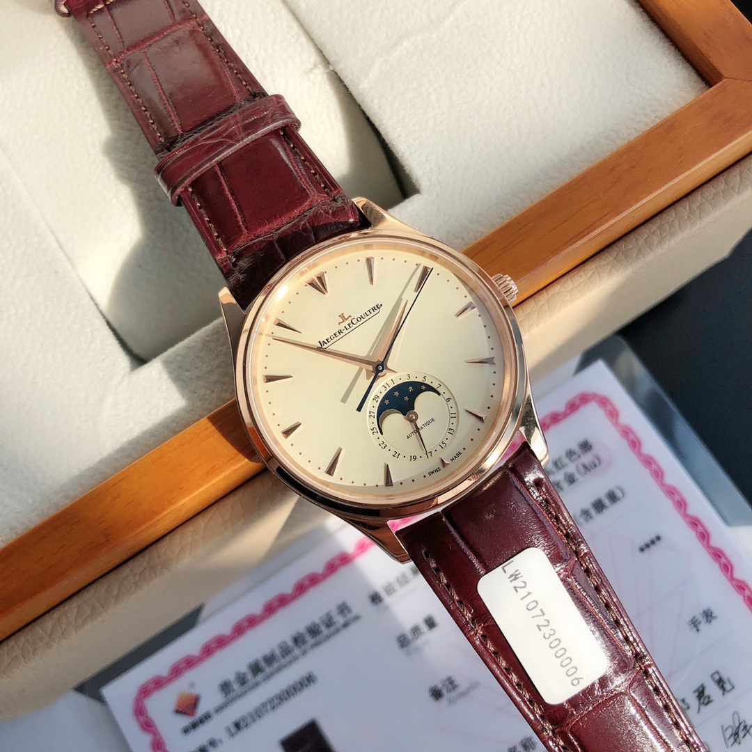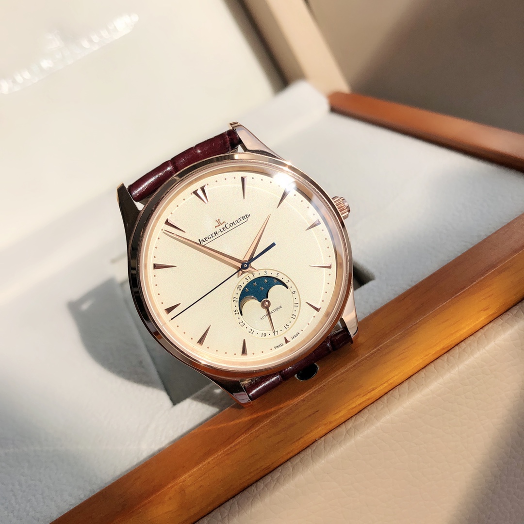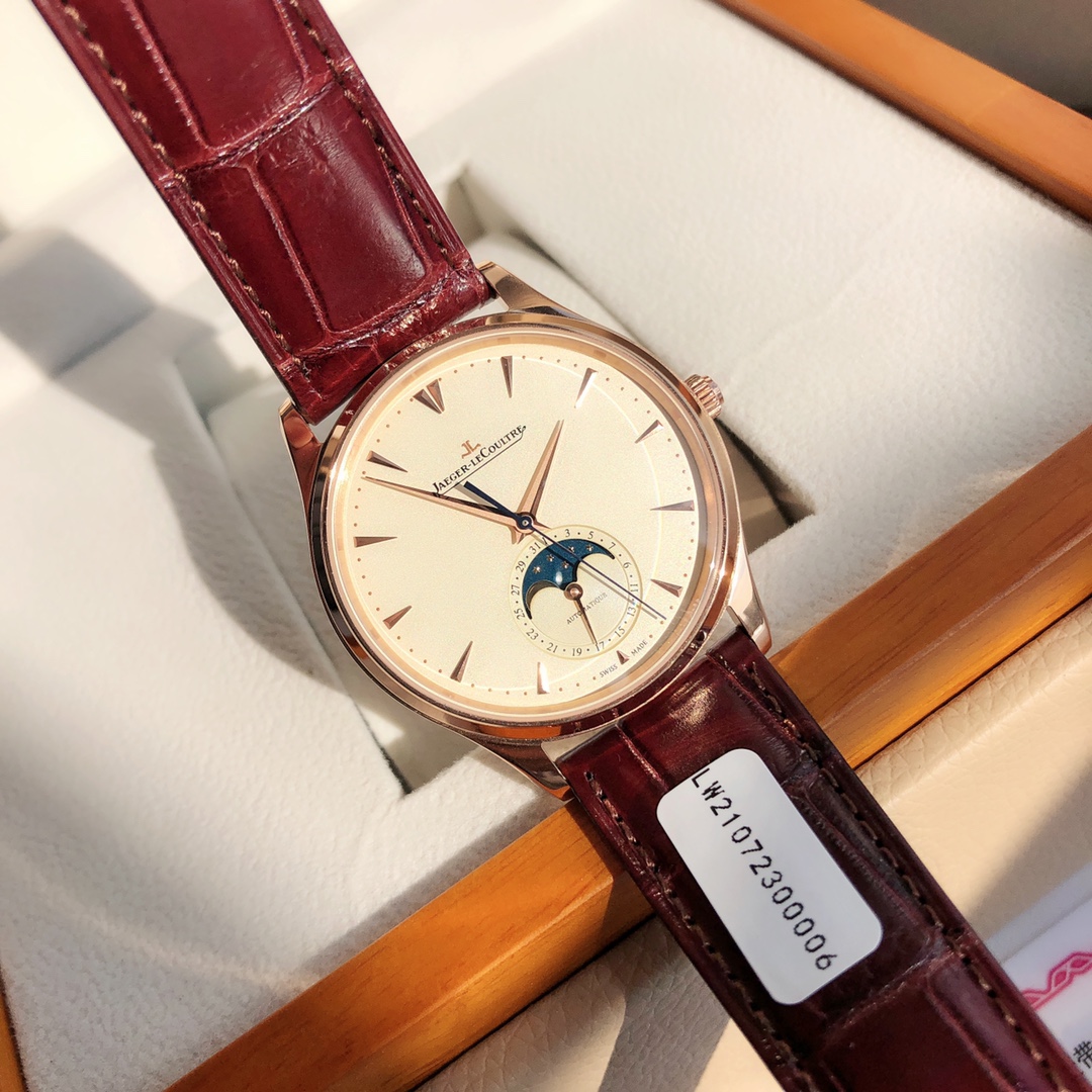Top-grade 18k gold-plated rose gold Jaeger-LeCoultre Master Moon Phase watch. 39mm diameter, all functions synchronized with original. GTC certificate included.