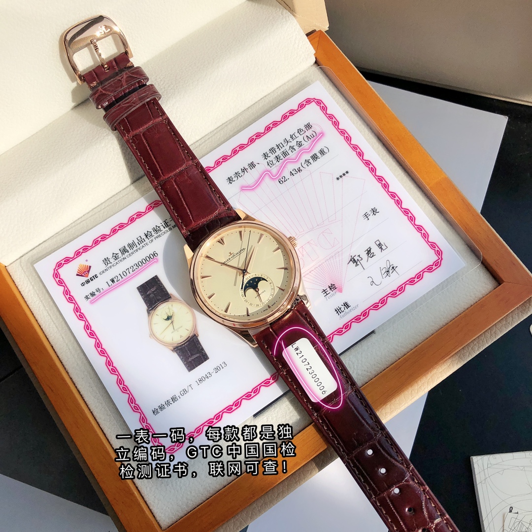 Top-tier version 18k gold-plated rose gold. Comes with China GTC inspection certificate. 100% gold-plated. Supports re-inspection. Jaeger-LeCoultre Master Moon Phase series, correcting all shortcomings of any current versions on the market. Classic moon phase dial, showcasing romantic charm! The simple and sleek case is finely polished, ensuring the polishing craftsmanship matches and the texture is synchronized with the genuine product. Equipped with an alligator strap and includes a cowhide strap; case diameter 39mm x 9.9mm, synchronized with the original. The sub-dial at six o'clock features dual display of Gregorian and lunar calendars (moon phase), with the moon phase completing one cycle per month, functions fully consistent with the genuine product. Uses a modified 9015 movement to Jaeger-LeCoultre's self-produced Cal.925/1 movement, functions 100% synchronized with the original self-produced movement. Stable timekeeping, robust quality. Observing the watch dial from the side reveals a slight curvature; achieving this effect required time-consuming and laborious multiple mold adjustments to ensure the charm and feel can rival the original. Jaeger-LeCoultre Master Moon Phase, fulfilling all your beautiful sentiments towards the moon phase.