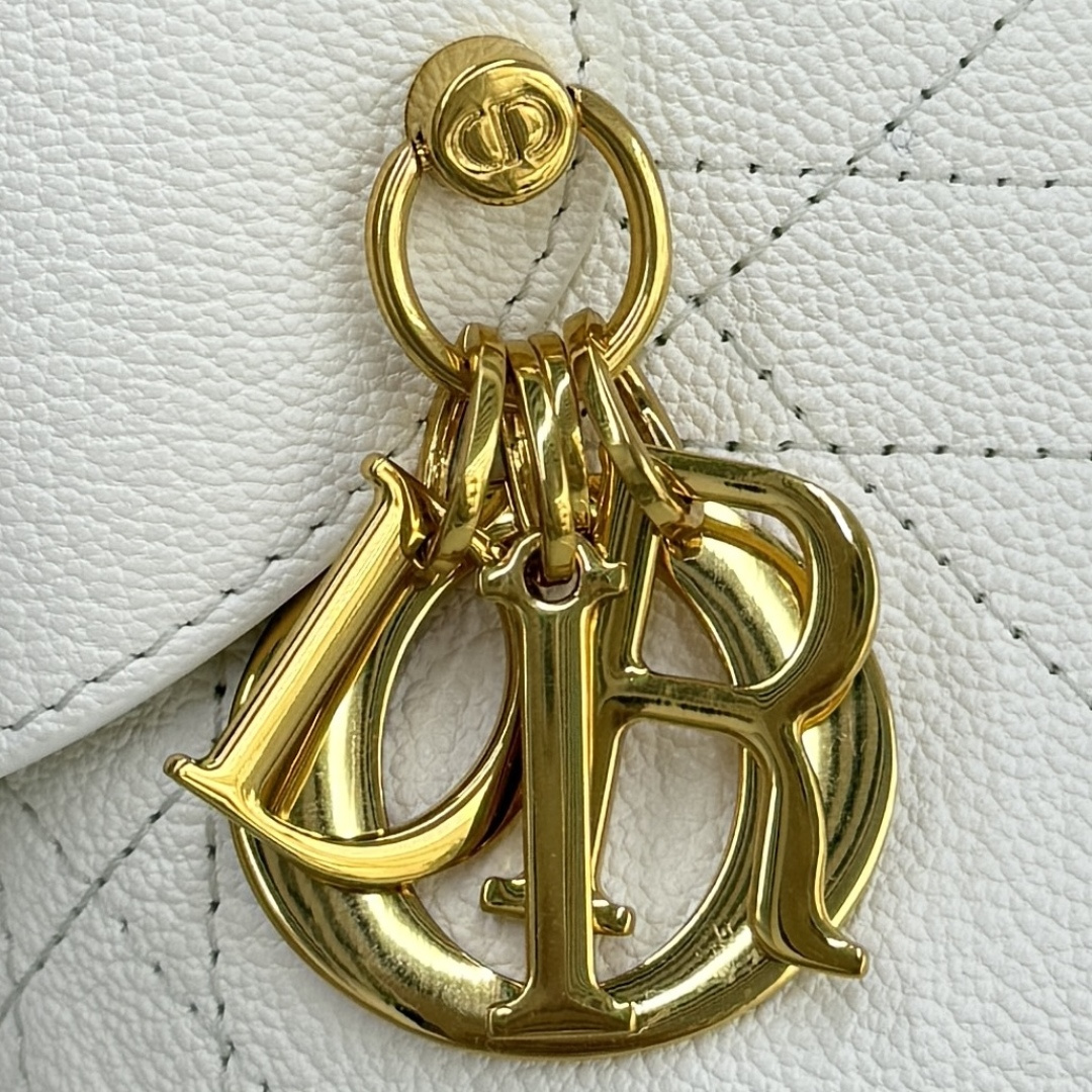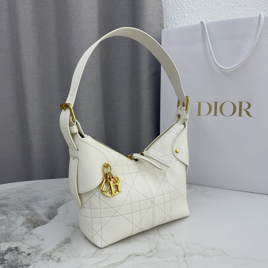 This Dior Voyage handbag is part of the early spring 2026 ready-to-wear collection, combining soft lines and elegant details to create a harmonious silhouette. Meticulously crafted from off-white grained calfskin, it features flat, oversized cannage stitching, offering a fresh interpretation of Dior's classic pattern. The soft structure is enhanced by an antique gold-finished metal D.I.O.R. charm and meticulously crafted leather accents, adding sophistication and structure. The main compartment is secured with a practical and safe two-way zipper closure. The medium size features a top handle with an adjustable clasp, allowing it to be carried on the shoulder, making it an ideal companion for everyday styling.