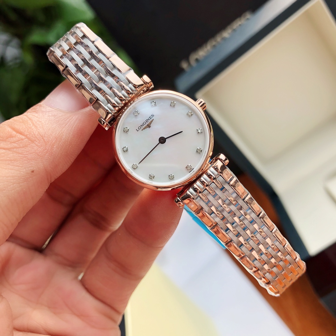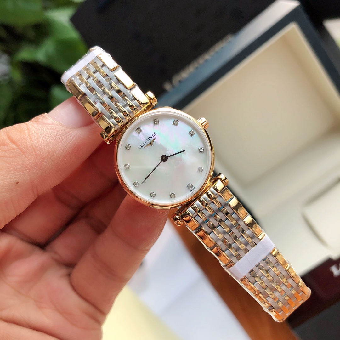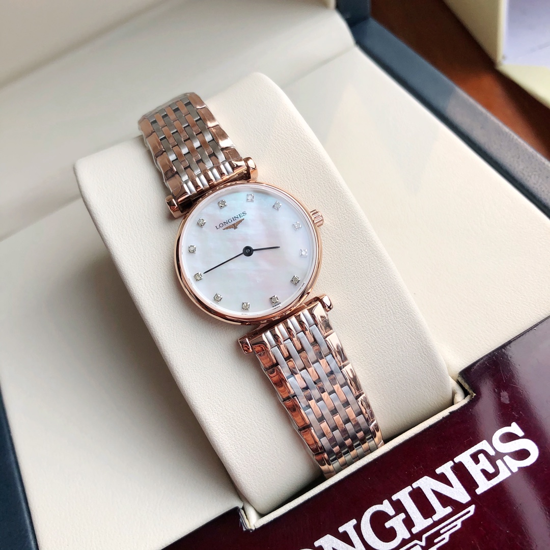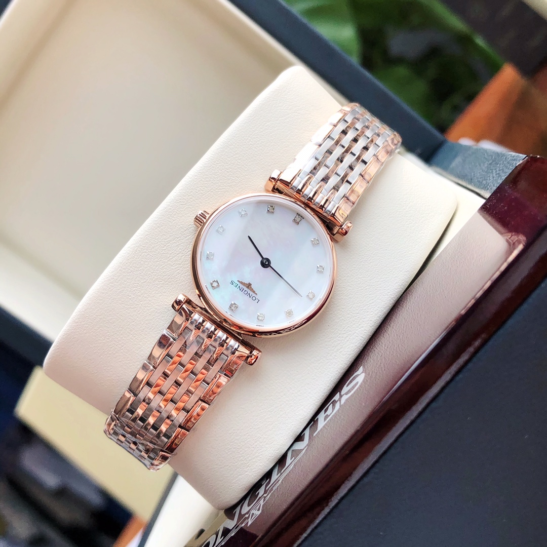 Batch Ultra-thin 4mm... The dial is set with 12 natural real VVS1.1 diamonds. Longines La Grande series - casual and fashionable ladies' quartz watch, size 24mm. Longines La Grande embodies the oldest manufacturing aesthetics of the Longines brand, renowned for its winged hourglass emblem. The uniquely designed case, with its ultra-thin silhouette, creates timeless beauty. Equipped with an original Swiss L.209 quartz movement, scratch-resistant sapphire crystal, a triple-fold safety clasp and push-button opening mechanism. Black hands add refinement to the entire dial. Original factory components highlight the essence of the watch. One watch, one code. The watch case back, tag, and warranty card have matching codes. Exclusive supply.