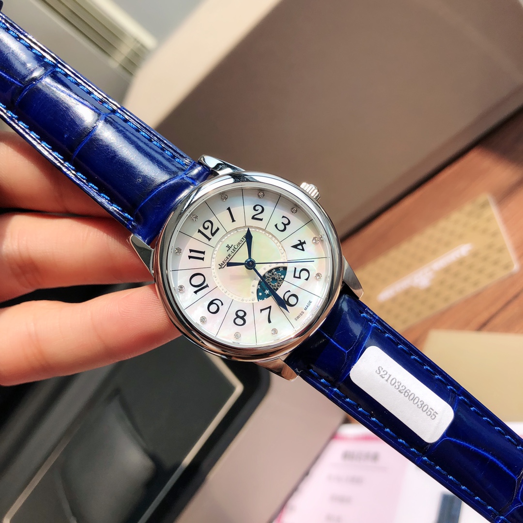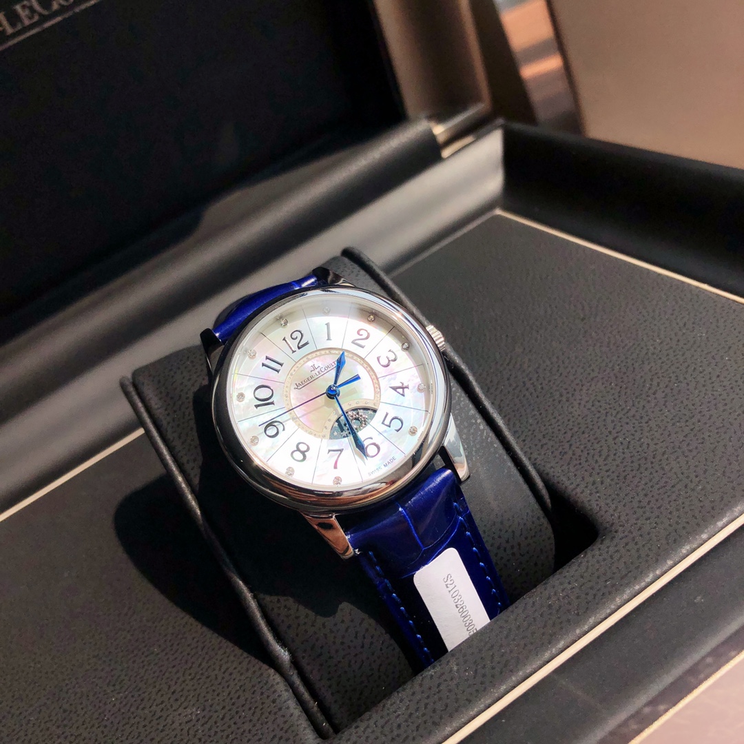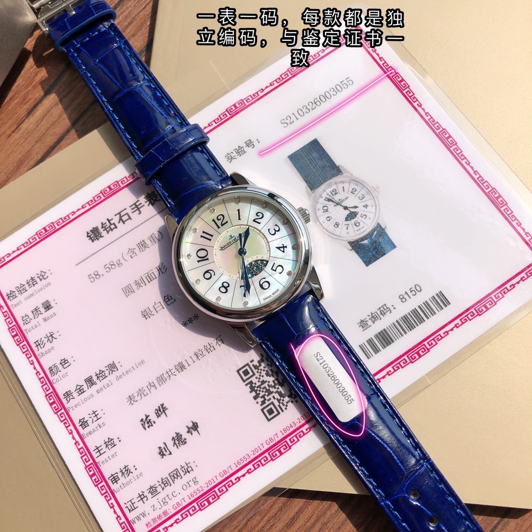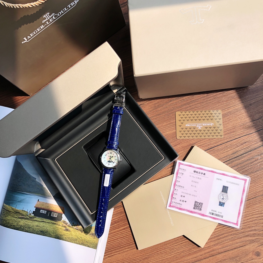 New hard goods! Jaeger-LeCoultre Rendez-Vous series watches make a romantic debut. Set with real diamonds, featuring imported American crocodile leather strap. Corrects all shortcomings of any current versions on the market. Simple and elegant, fully displaying romantic charm! Watch size 34MM/thickness 8.9MM, the simple and capable case is finely polished, ensuring polishing craftsmanship matches and texture synchronizes with the genuine product. The dial is set with 11 top-grade VS1.2 natural diamonds from South Africa. Meticulous setting, heavily invested to create. Restores the most beautiful style of the genuine product! Equipped with national inspection agency testing certificate, verifiable and queryable! Uses original Swiss imported stone movement, perfectly achieving original calendar day/night star option/hour-minute-second change functions, closely following original replication! Accurate timekeeping. Quality guaranteed! Exactly the same as the genuine product, electric light blued hands shine brilliantly in sunlight. Imported American crocodile leather strap. Lightweight and breathable, excellent texture, paired with Jaeger-LeCoultre classic folding clasp. Comes with original gift box, perfect recommendation for gifting or personal use!!