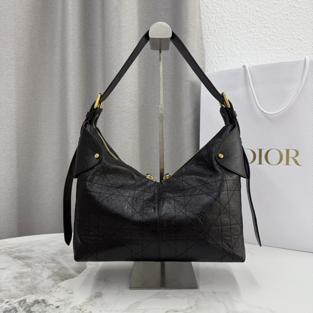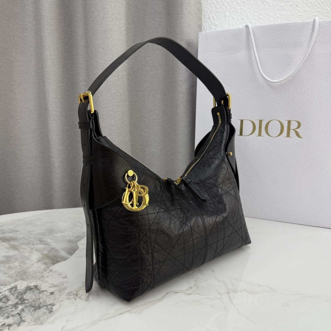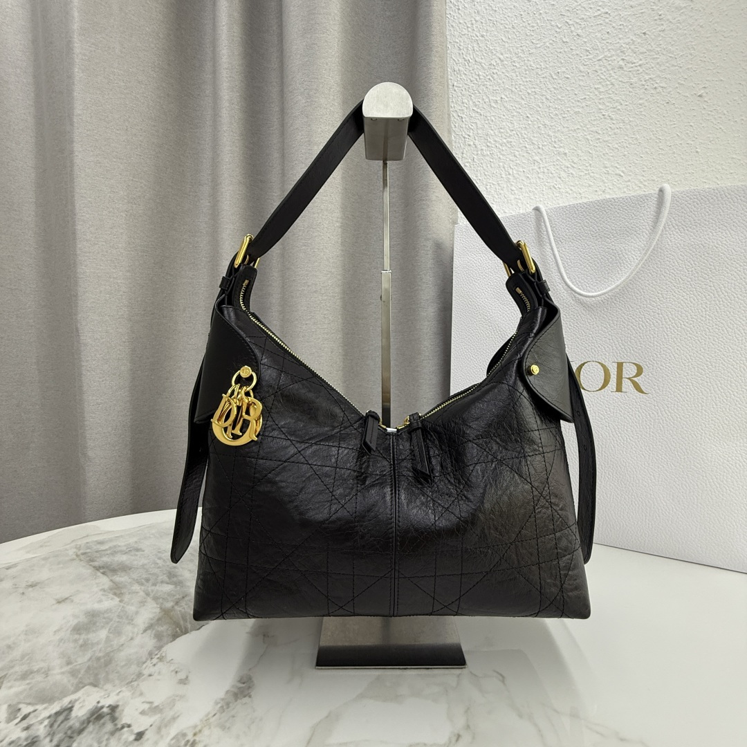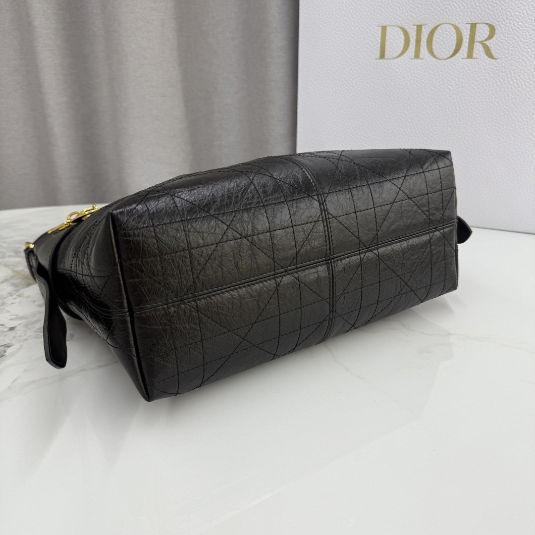 This Dior Voyage handbag is part of the 2026 early spring ready-to-wear collection, blending soft lines and elegant details to create a harmonious silhouette. Meticulously crafted from black pleated calfskin, it features flat, oversized cannage stitching, offering a fresh interpretation of Dior's classic pattern. The soft silhouette is enhanced with a vintage gold-finished metal D.I.O.R. charm and meticulously crafted leather accents, adding structure and sophistication. The main compartment is secured with a practical and safe two-way zipper closure. The medium size features a top handle with an adjustable clasp, making it suitable for shoulder wear and an ideal companion for everyday styling.