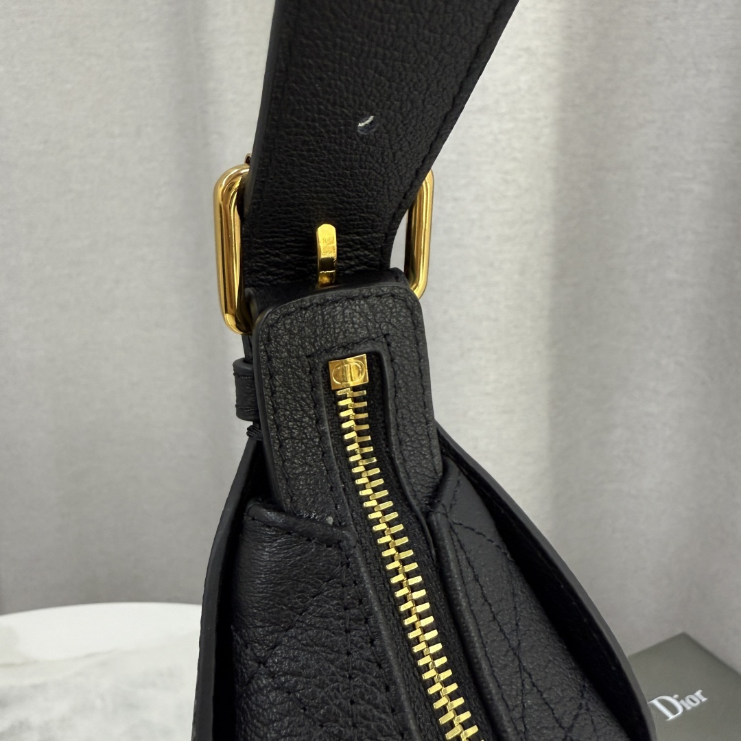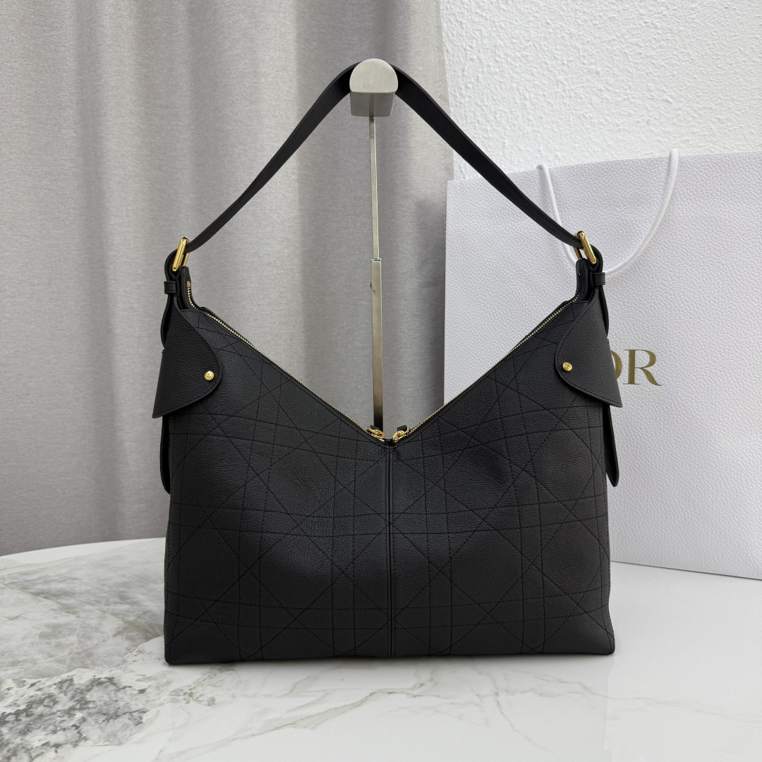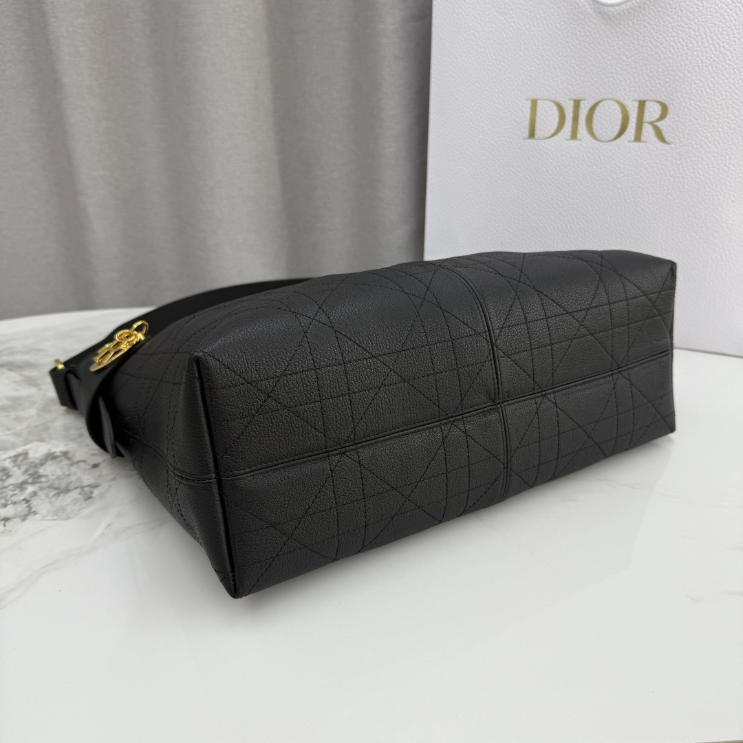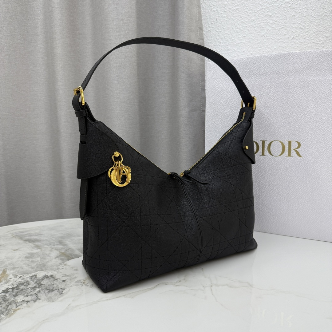 This Dior Voyage handbag is part of the early spring 2026 ready-to-wear collection, combining soft lines and elegant details to create a harmonious dumpling bag silhouette. Meticulously crafted from black grained calfskin, it features flat, oversized cannage stitching, offering a fresh interpretation of Dior's classic pattern. The soft silhouette is enhanced with an antique gold-finished metal D.I.O.R. charm and meticulously crafted leather accents, adding sophistication and structure. The main compartment is secured with a practical and safe two-way zipper closure. In a large size, it features a top handle with an adjustable clasp, allowing it to be carried on the shoulder, making it an ideal companion for everyday styling.