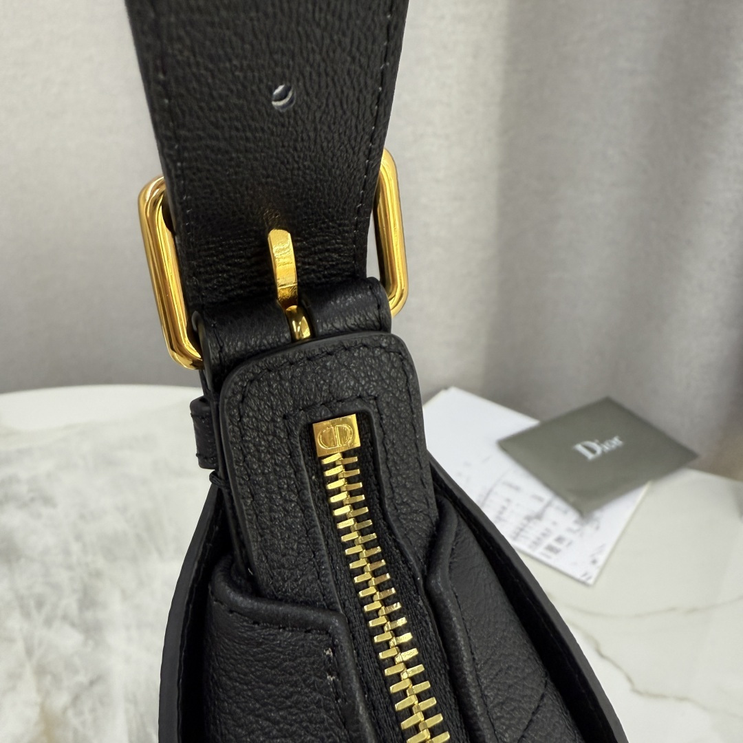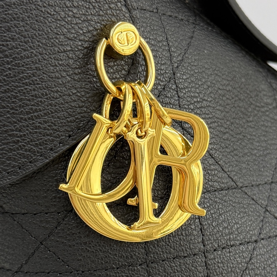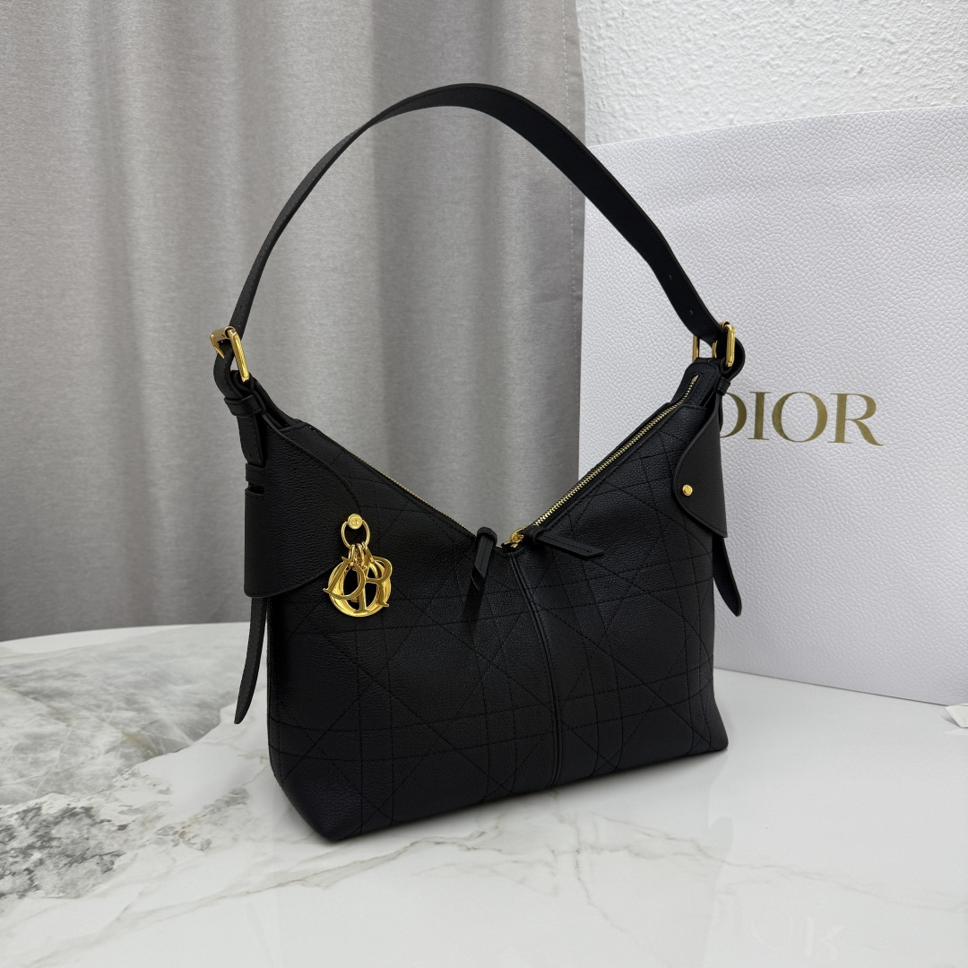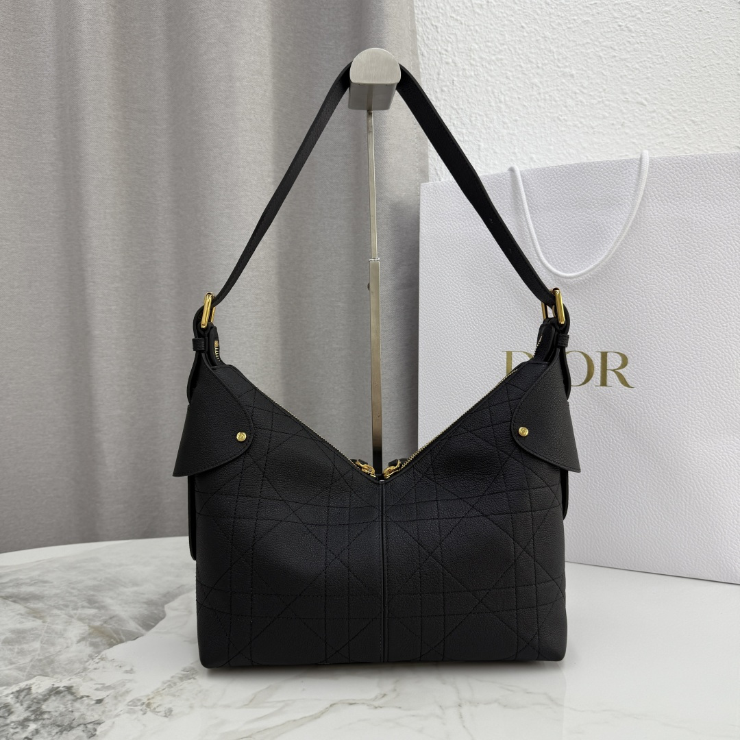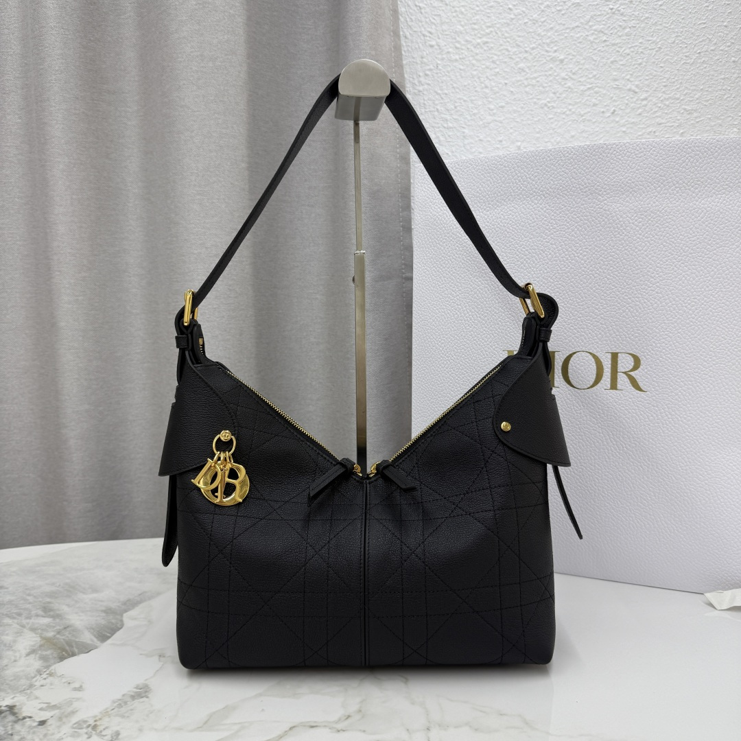 This Dior Voyage bag is part of the 2026 early spring ready-to-wear collection, combining soft lines and elegant details to create a harmonious silhouette. Meticulously crafted from black grained calfskin, it features flat, oversized cannage stitching, offering a fresh interpretation of Dior's classic pattern. The soft structure is enhanced with an antique gold-finished metal D.I.O.R. charm and meticulously crafted leather accents, adding sophistication and providing more structure to the shape. The main compartment is secured with a practical and safe two-way zip closure. The medium size features a top handle with an adjustable clasp, allowing it to be carried on the shoulder, making it an ideal companion for everyday styling.