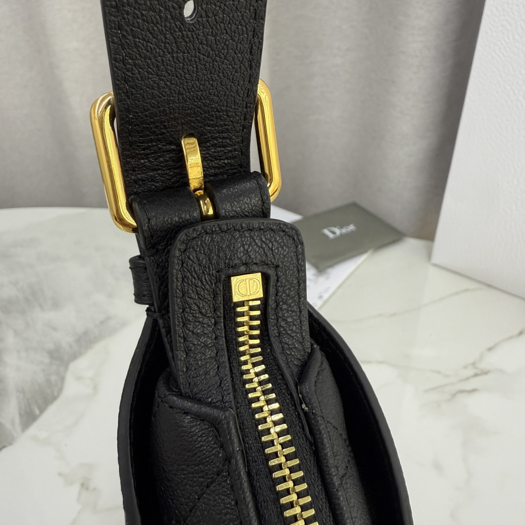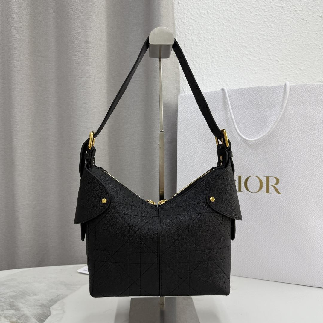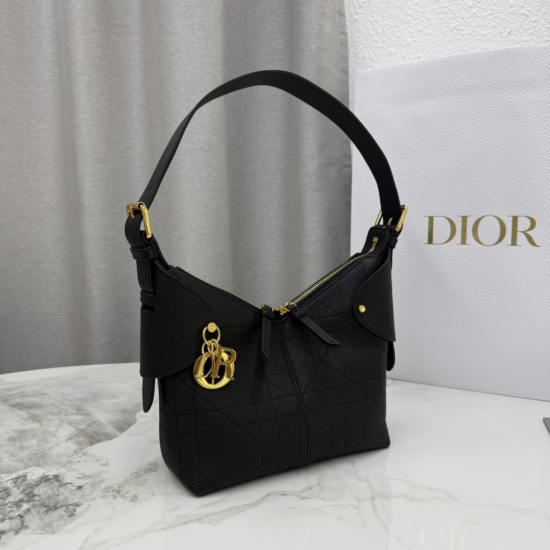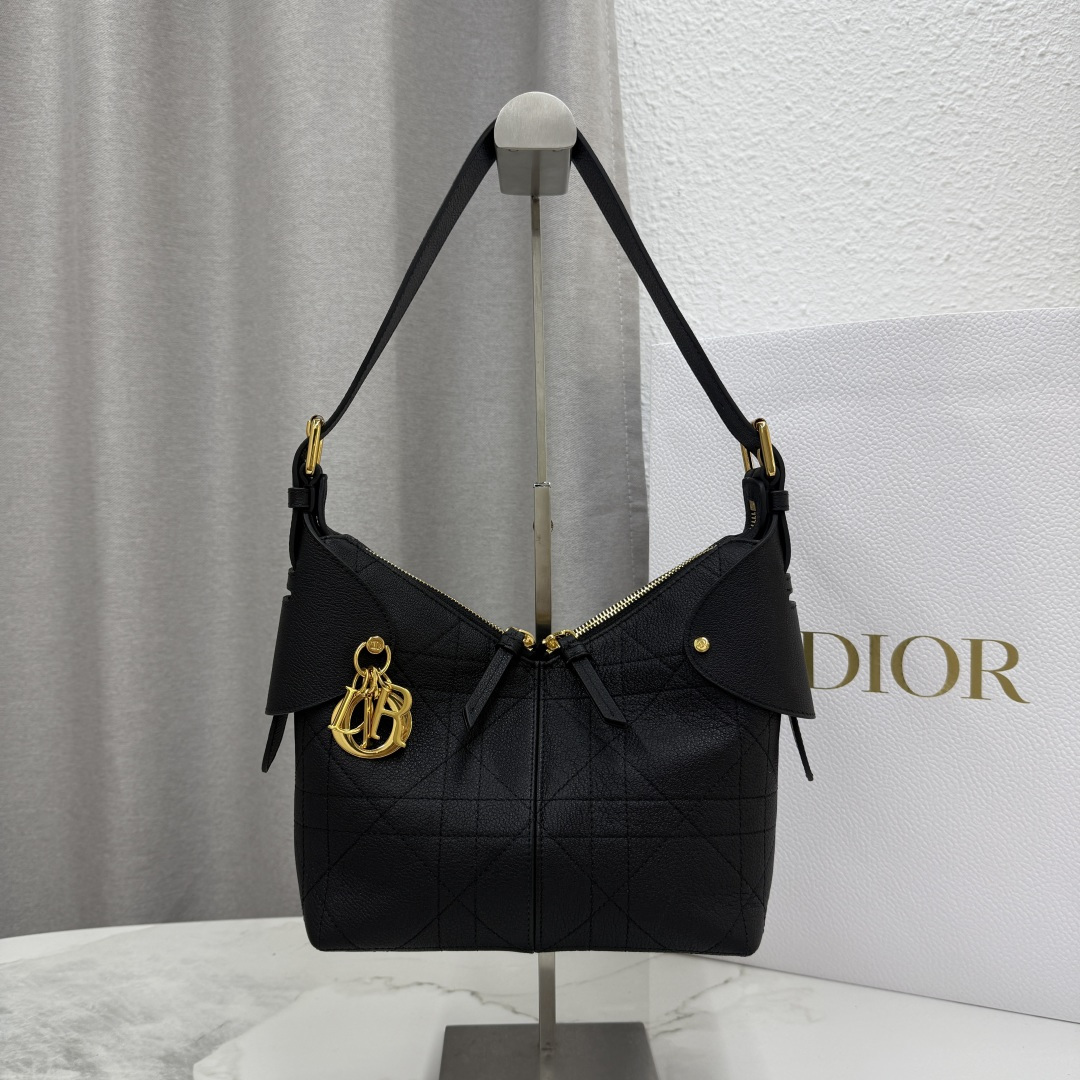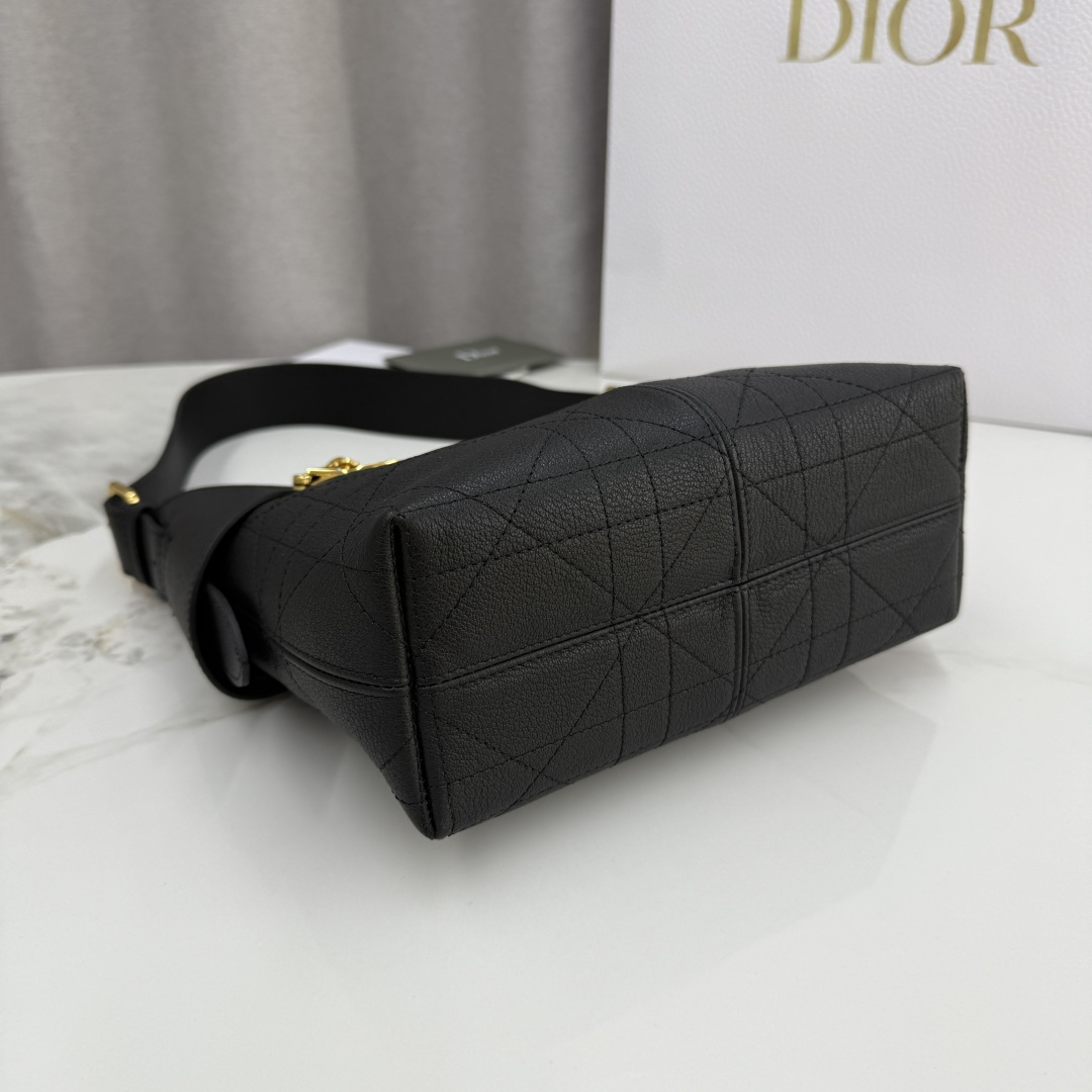 This Dior Voyage handbag is part of the early spring 2026 ready-to-wear collection, blending soft lines and elegant details to create a harmonious silhouette. Meticulously crafted from black grained calfskin, it features flat, oversized cannage stitching, offering a fresh reinterpretation of Dior's classic pattern. The soft structure is enhanced with an antique gold-finished metal D.I.O.R. charm and meticulously crafted leather accents, adding sophistication and structure. The main compartment is secured with a practical two-way zipper closure. The small design includes a top handle with an adjustable clasp, allowing it to be carried on the shoulder, making it an ideal companion for everyday styling.