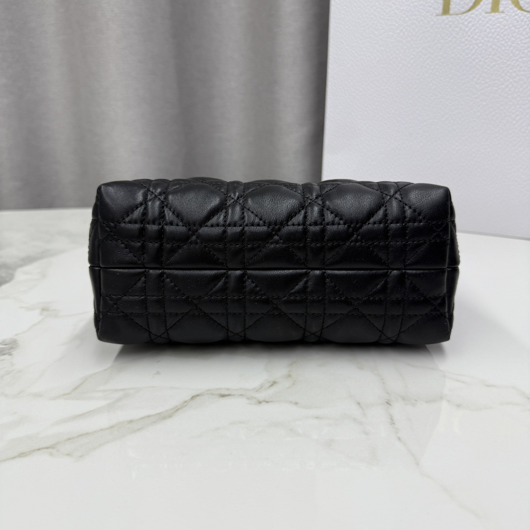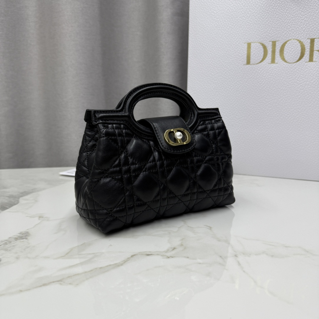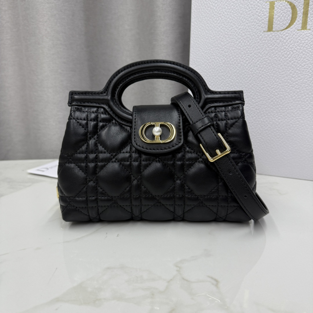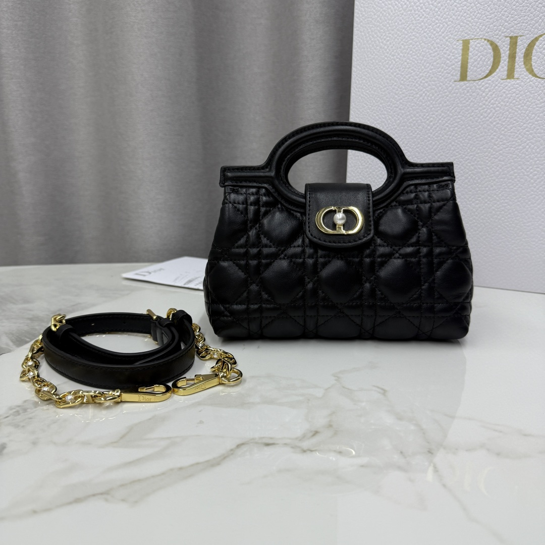 This Dior Jolie Top Handle mini chain bag is part of the early spring 2026 ready-to-wear collection, featuring an elegant and practical design. Meticulously crafted from black lambskin leather, it is adorned with a cannage pattern. The flap is embellished with a gold-finished metal CD logo and white resin beads. Inside, there is one compartment to hold various daily essentials. It comes with dual top handles and an adjustable, detachable CD chain strap. The strap consists of a leather band and CD links, decorated with white resin beads, allowing for comfortable hand-carrying, shoulder wear, or cross-body styling. It can be paired with both everyday and evening outfits.