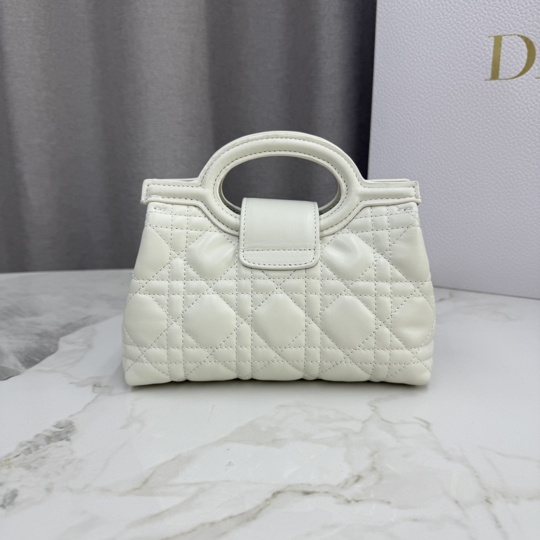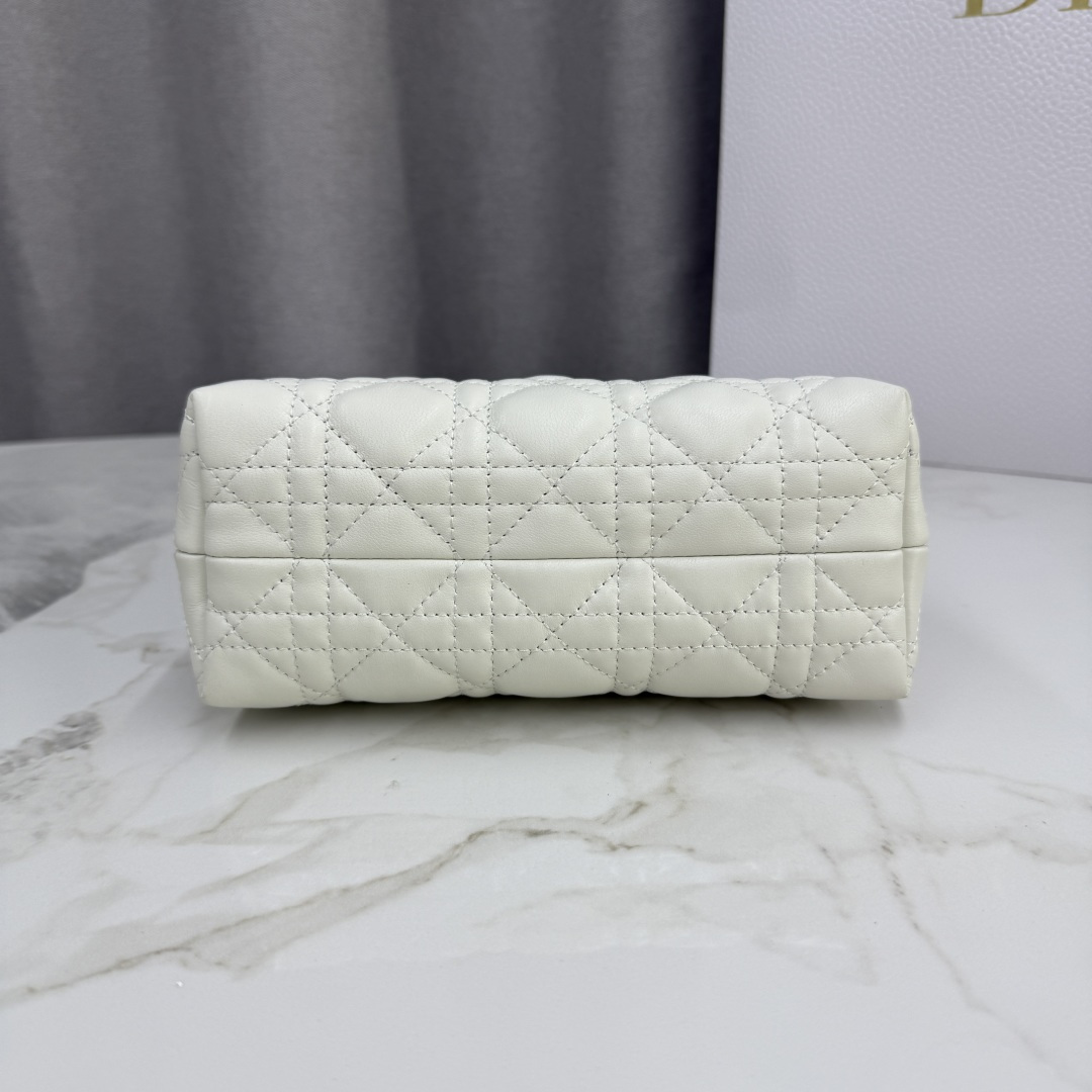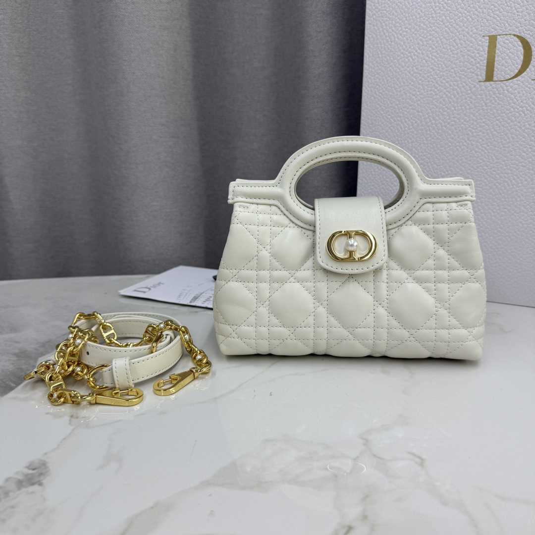 This Dior Jolie Top Handle mini chain bag is part of the early spring 2026 ready-to-wear collection, showcasing an elegant and practical design. Meticulously crafted from white lambskin, it features a cannage pattern, with the flap adorned by a gold-finish metal CD logo and white resin beads. Inside, there is one compartment to hold various daily essentials. It comes with dual top handles and an adjustable, detachable CD chain shoulder strap. The strap is composed of a leather band and CD chain links, decorated with white resin beads, allowing for comfortable hand-carrying, shoulder wear, or cross-body styling. It pairs well with both everyday and evening outfits.