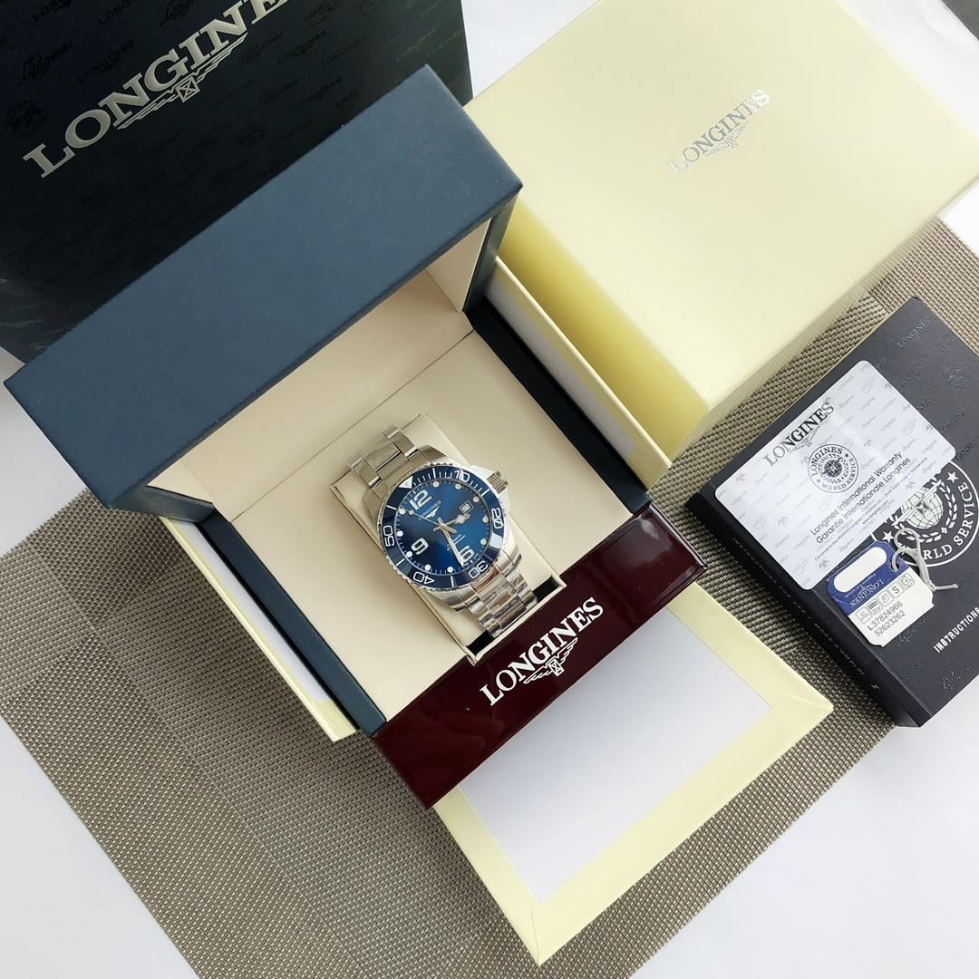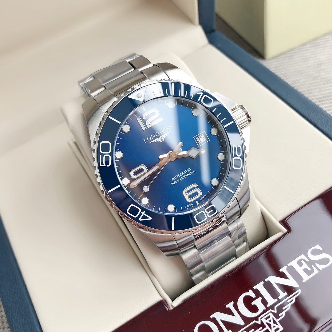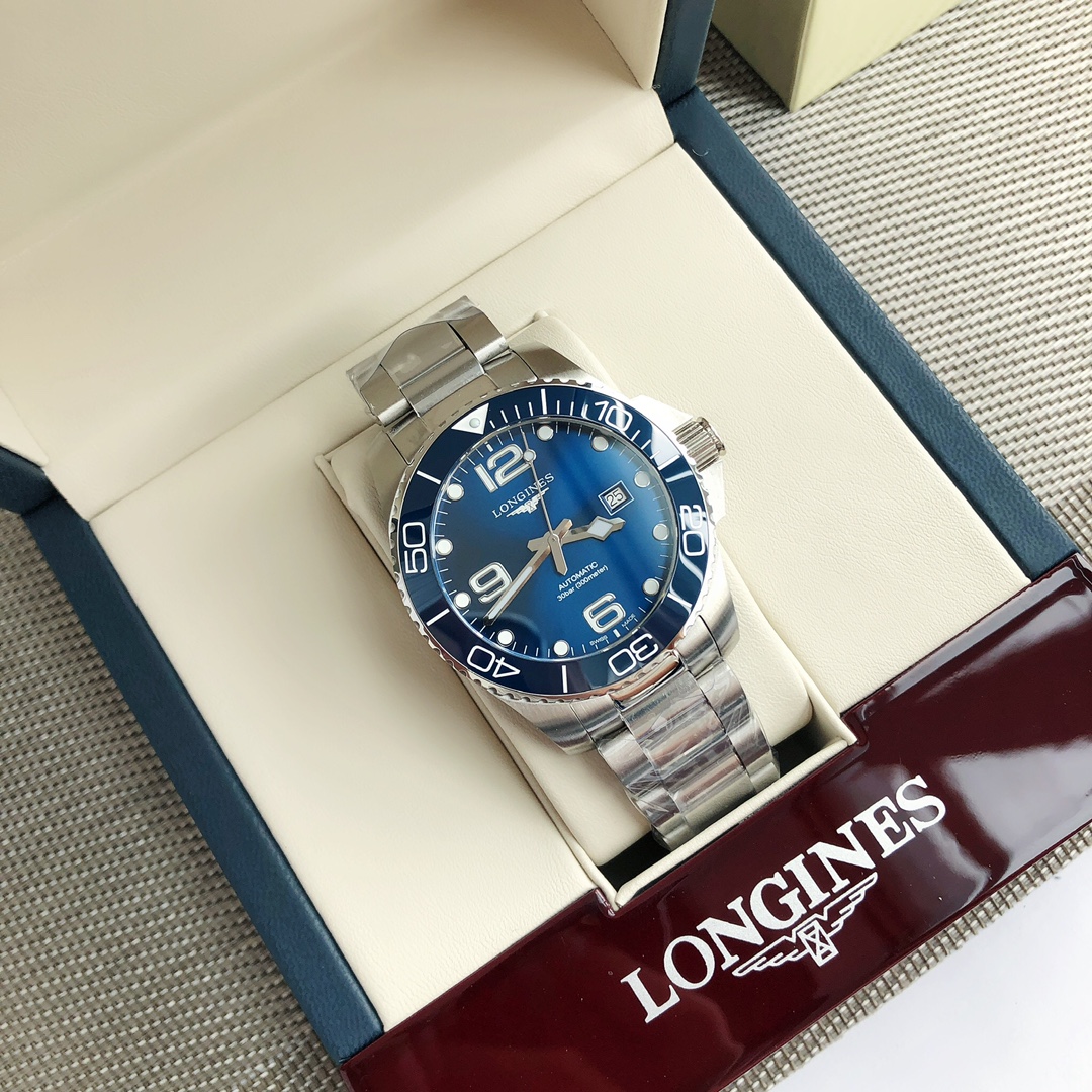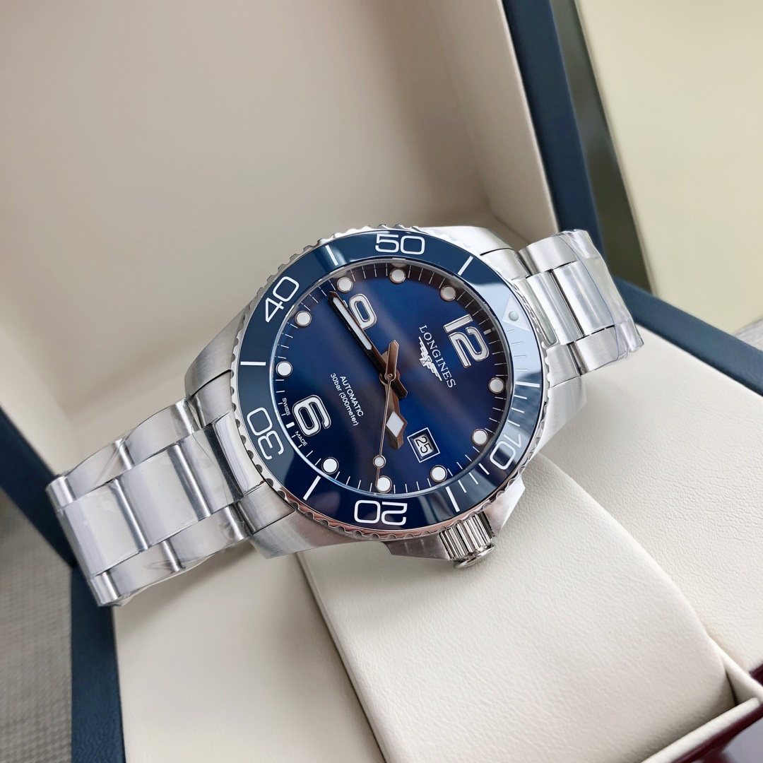 Batch Longines-Longines, Conquest Diving Series men's watch, the Longines equivalent of a diver's watch, waterproof up to 300 meters, case diameter 43mm, automatic mechanical 2824 movement model S T 1900, original case back cover, simple and stylish, suitable for business and casual wear. Screw-in crown, ceramic bezel, double folding safety clasp with diving extension device; sapphire crystal with multi-layer anti-reflective coating on both sides, comes with full set packaging, exclusive first release!