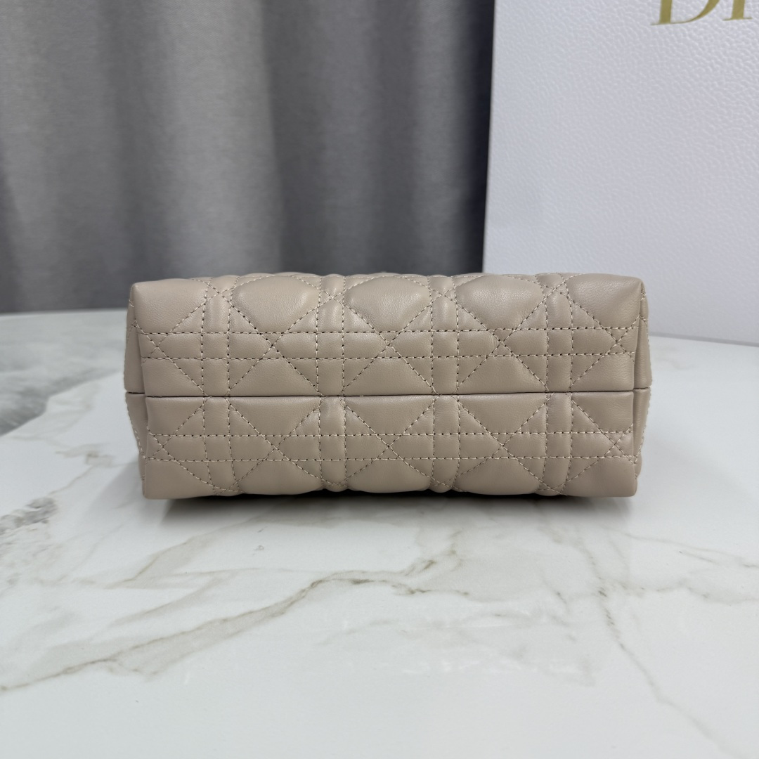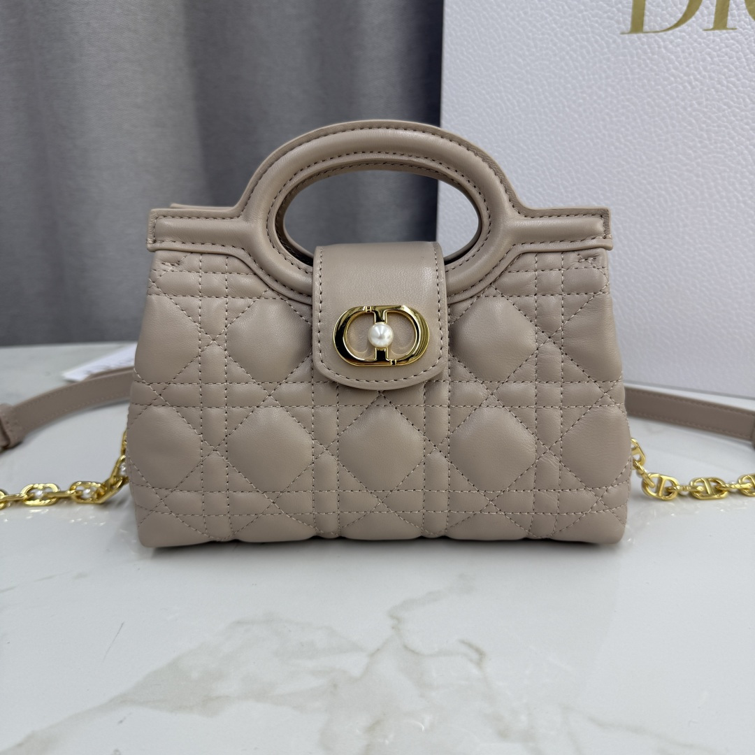 This Dior Jolie Top Handle mini chain bag is part of the early spring 2026 ready-to-wear collection, featuring an elegant and practical design. Meticulously crafted from blushed beige lambskin, it is adorned with a cannage pattern. The flap is embellished with a gold-finish metal CD logo and white resin beads. It includes one interior compartment to organize various daily essentials. Equipped with dual top handles and an adjustable, detachable CD chain strap. The strap is composed of a leather strip and CD links, decorated with white resin beads, allowing for comfortable hand-carry, shoulder, or cross-body wear. It pairs well with both daily and evening outfits.