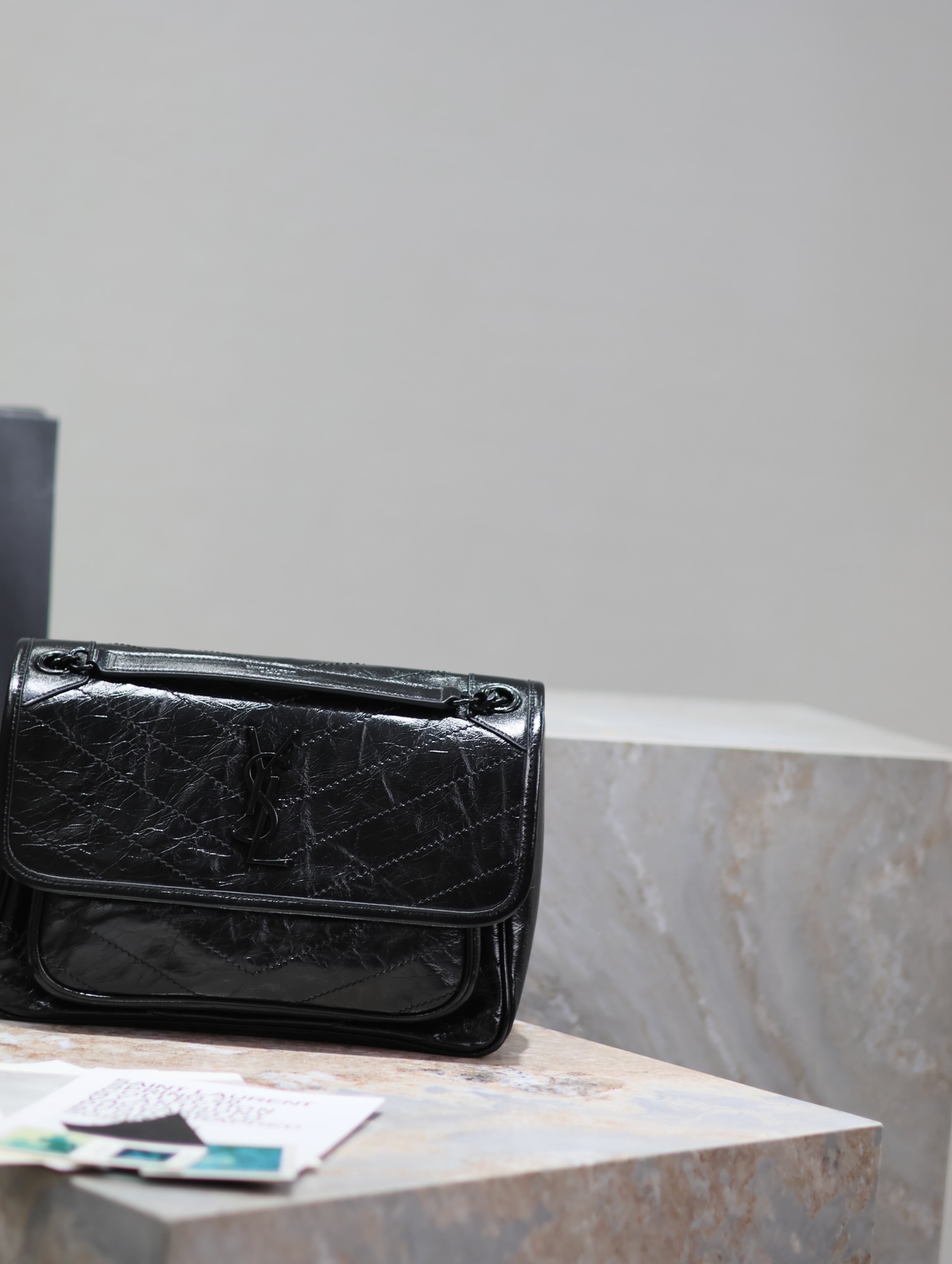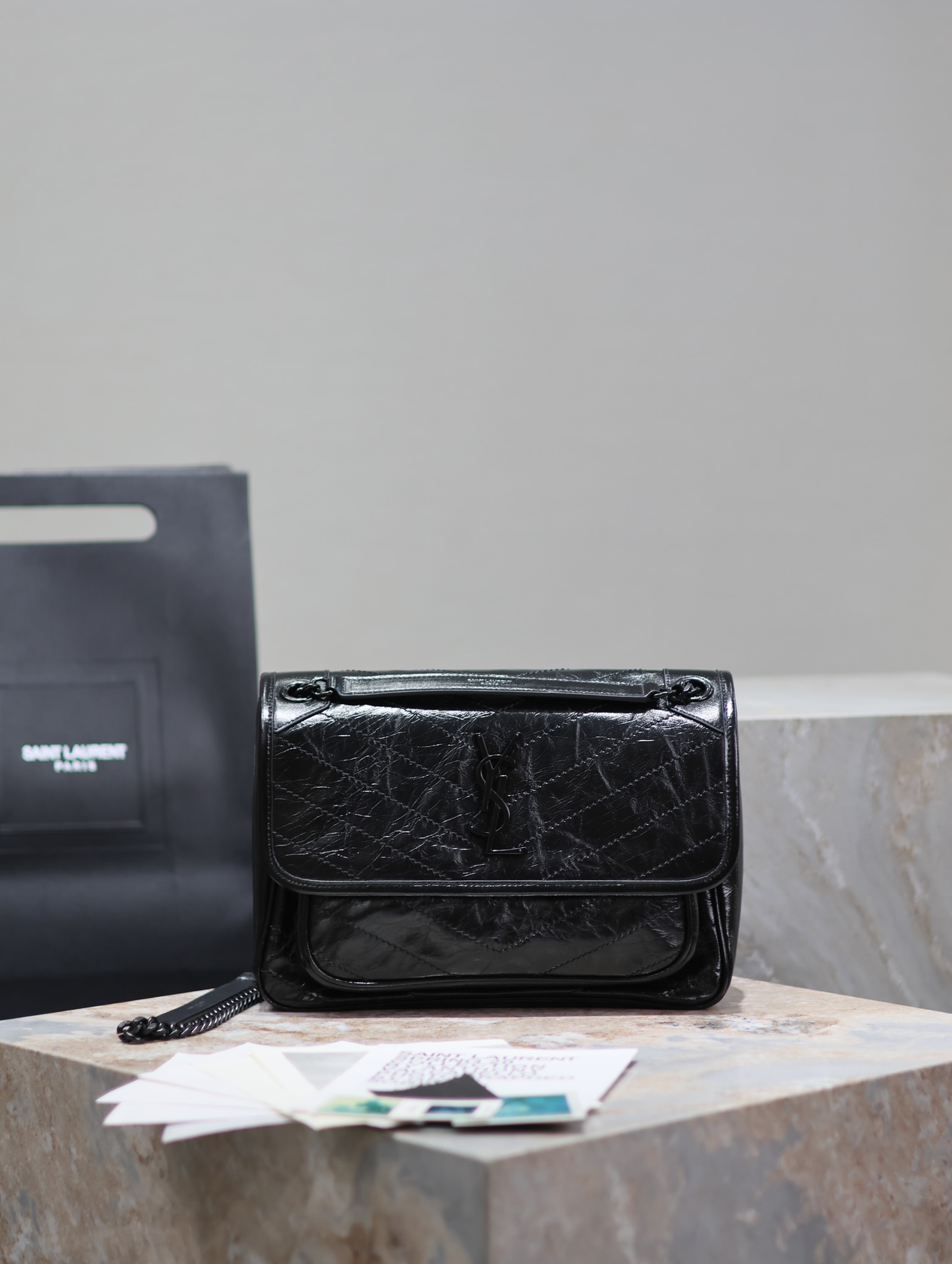 Home • Luggage • YSL Saint Laurent Medium 28cm Niki Bag in Black with Chain Strap. Enhanced with D-rings for added durability. Original factory leather. Includes full packaging.
