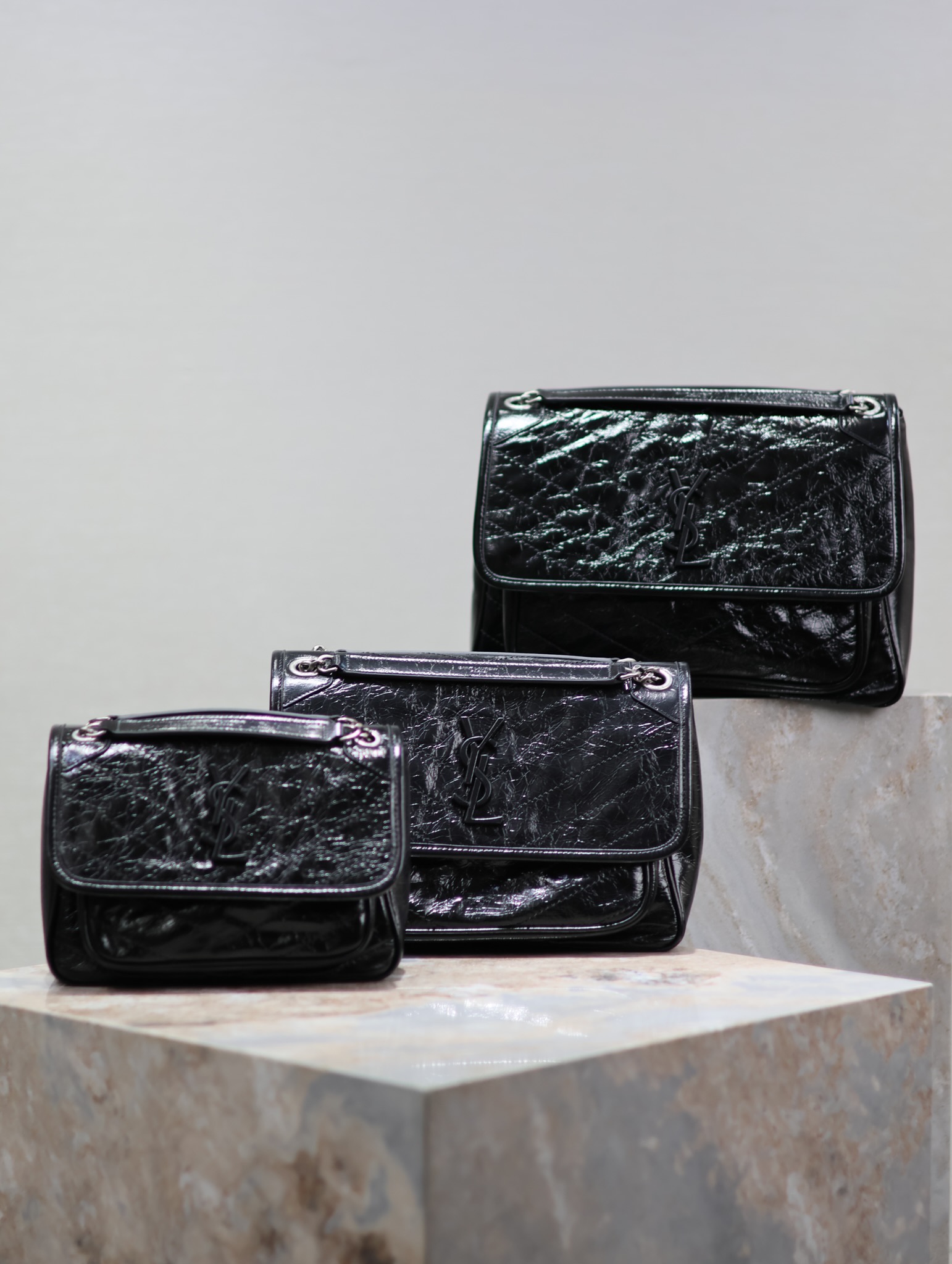 YSL Saint Laurent Niki Black Silver Hardware Waxed Leather