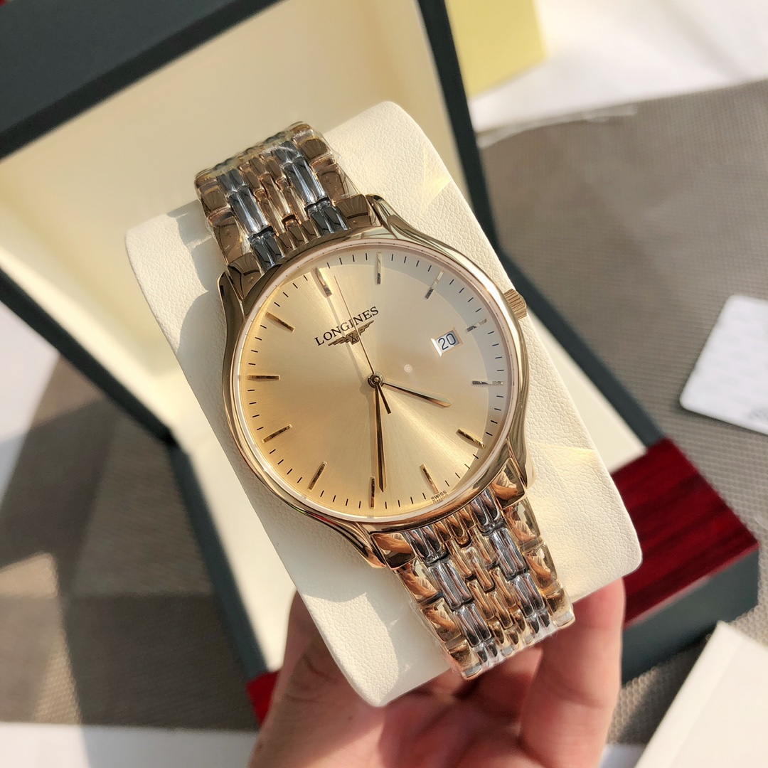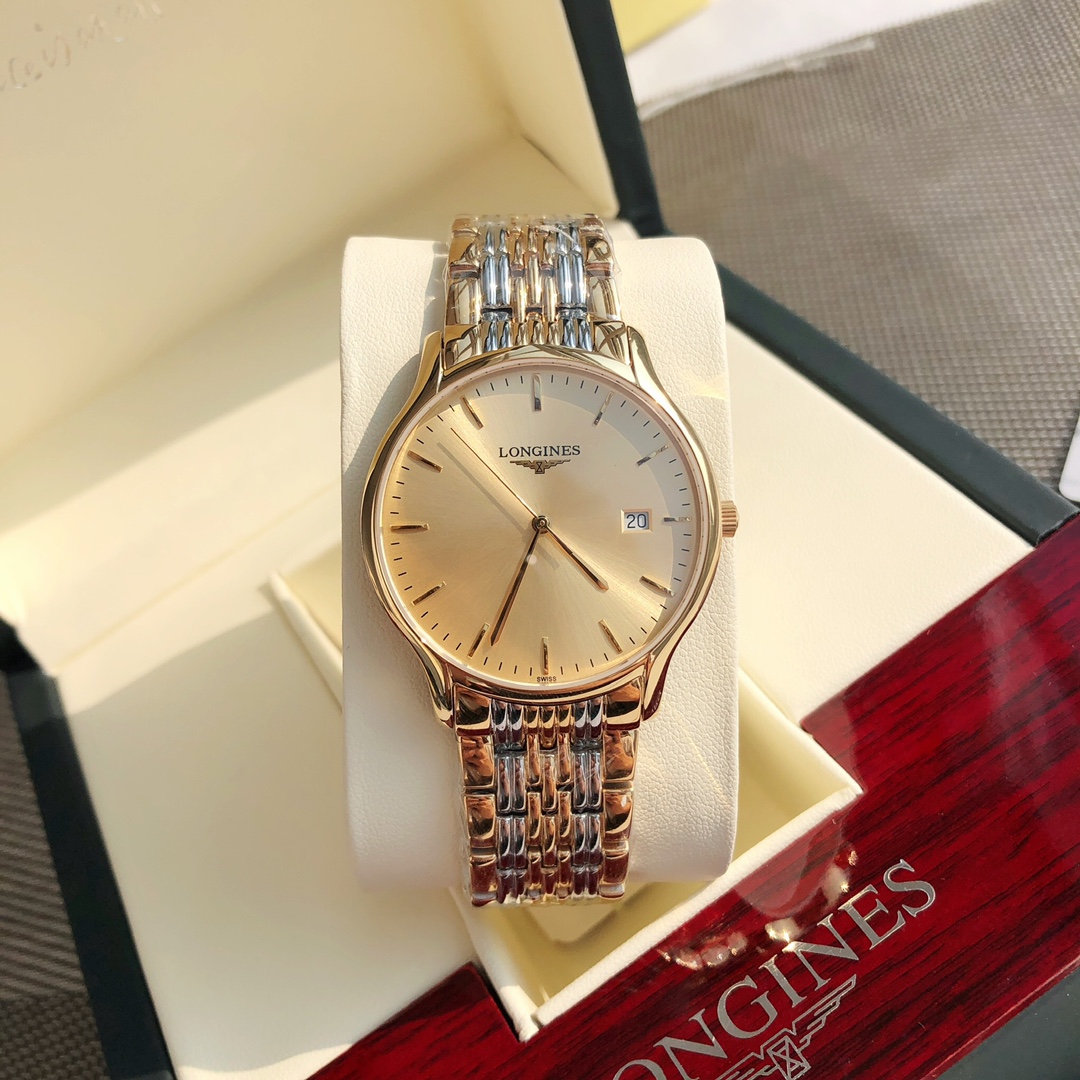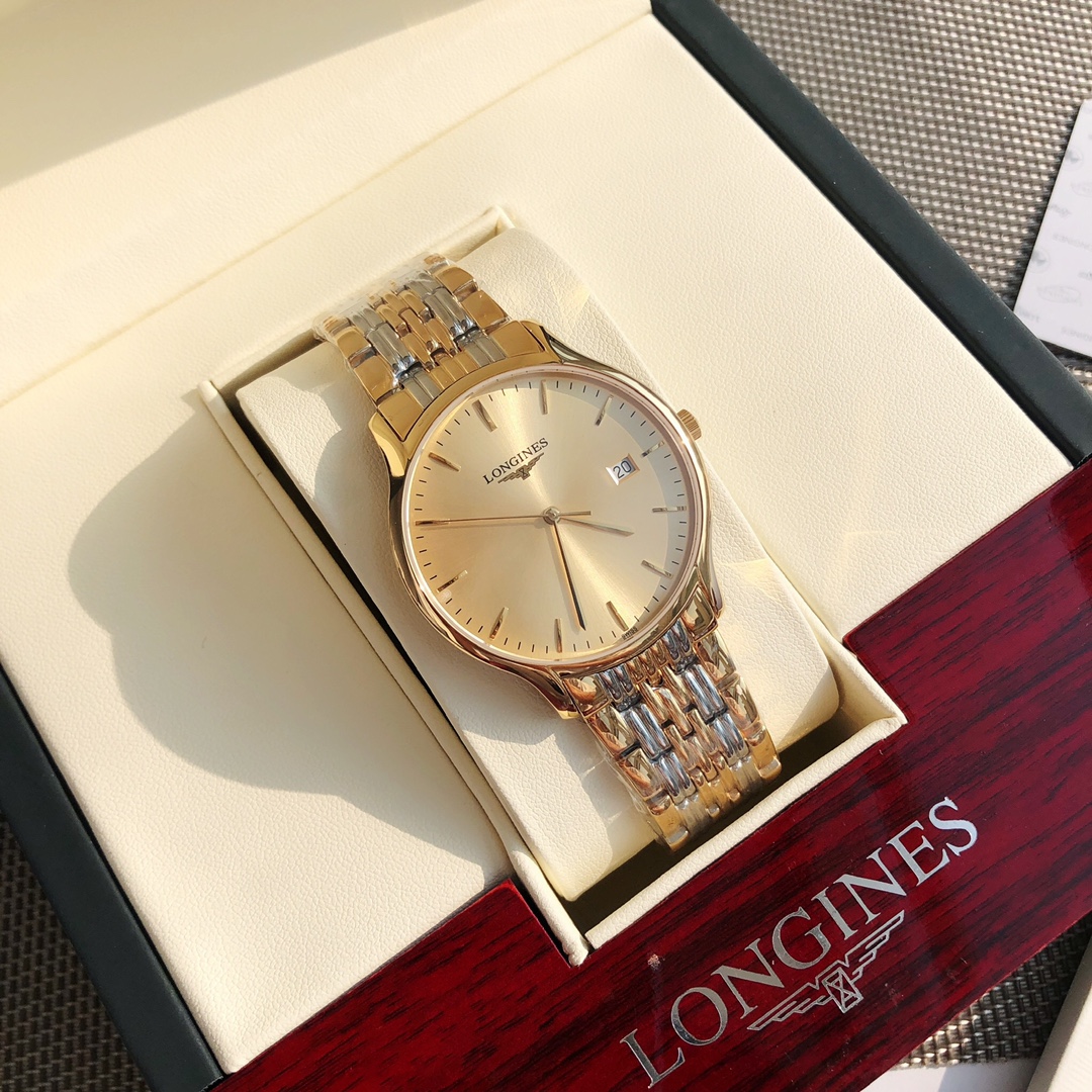 This time, we bring you a couple's Longines watch from the OEM factory channel. The men's version has a 38.5mm diameter, and the women's version has a 25mm diameter, both at the same price! The classic and timeless Longines Elegant Collection—casual and fashionable women's quartz watch—embodies the oldest manufacturing aesthetics of the Longines brand, renowned for its winged hourglass emblem. The uniquely designed case, with its ultra-thin silhouette, creates eternal beauty. The men's version features a Swiss Ronda 515 quartz movement, while the women's version has a Swiss Ronda 585 quartz movement. It includes a scratch-resistant sapphire crystal, a triple-fold safety clasp with a push-button opening mechanism, and simple silver hands that enhance the dial's elegance. Original large accessories highlight the essence of the watch, and it comes with a lifetime warranty.