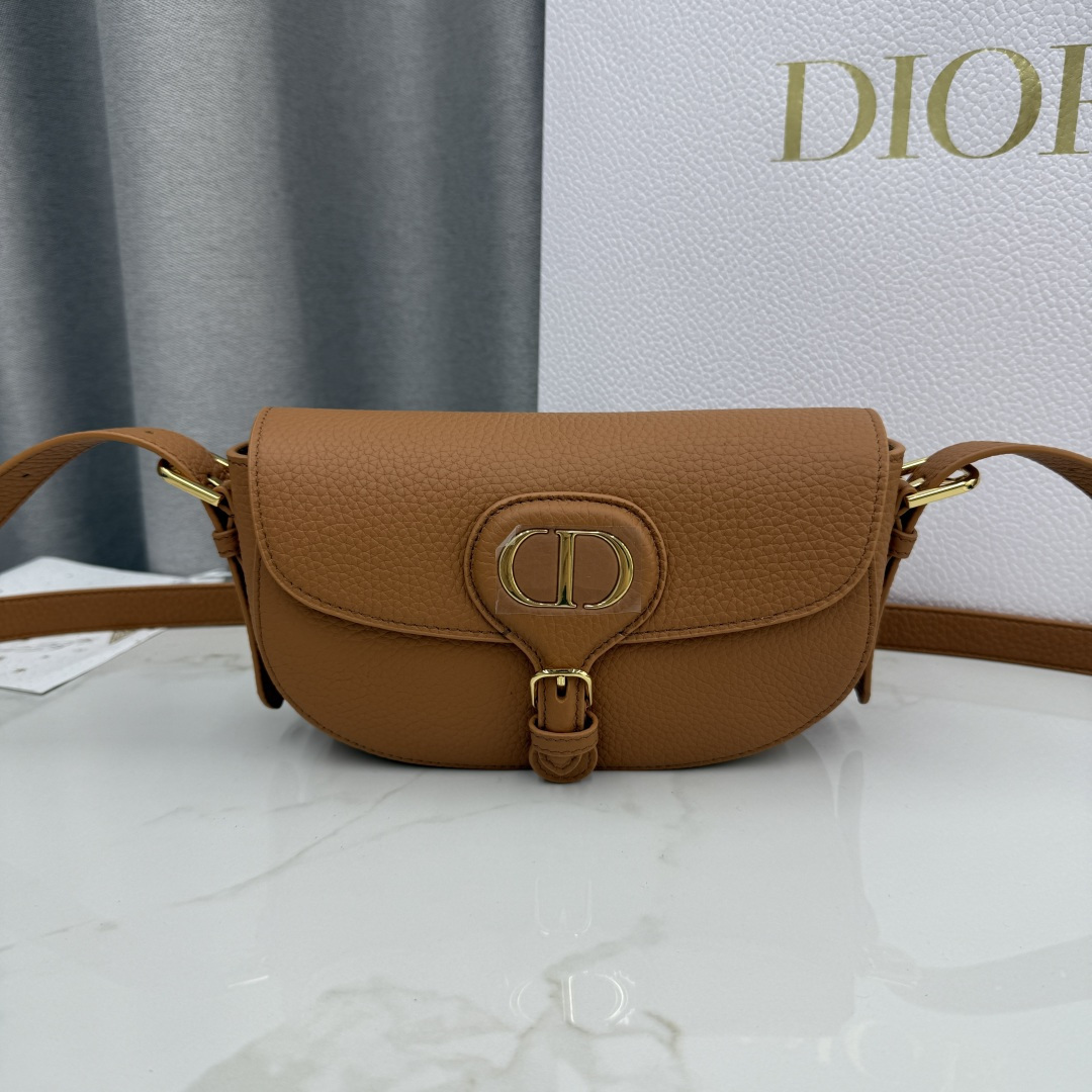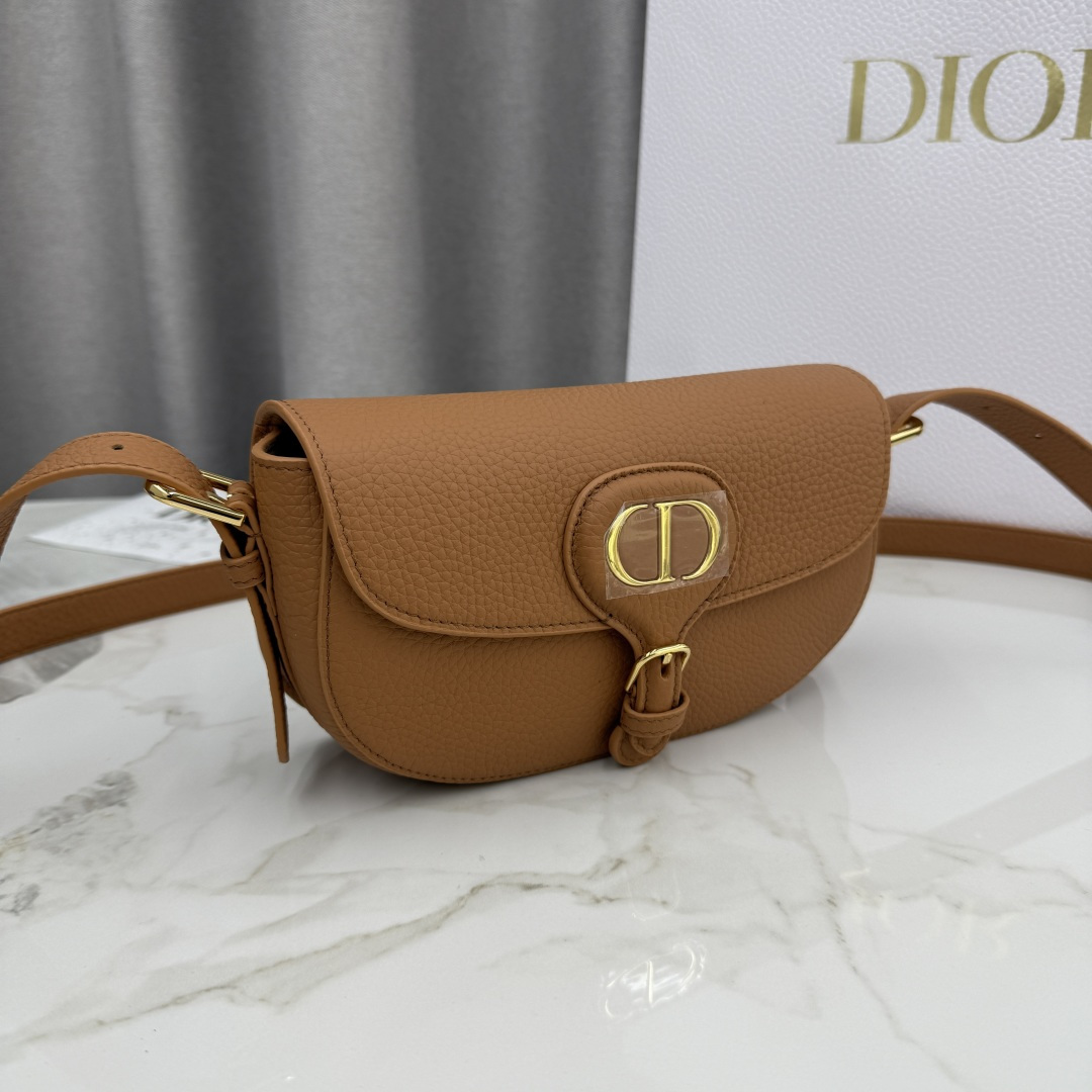 This Dior Bobby East-West handbag is a new product from the early spring 2025 collection. It reinterprets the dumpling bag silhouette with elegant lines and balanced proportions, showcasing Dior's style. Crafted from brown grained calfskin, it features vintage gold-toned metal details that enhance its sophistication. The detachable and adjustable strap can be modified using an elegant pin buckle, allowing it to be carried by hand or over the shoulder for a refined daytime or evening look. It can also be worn crossbody for a sporty style.