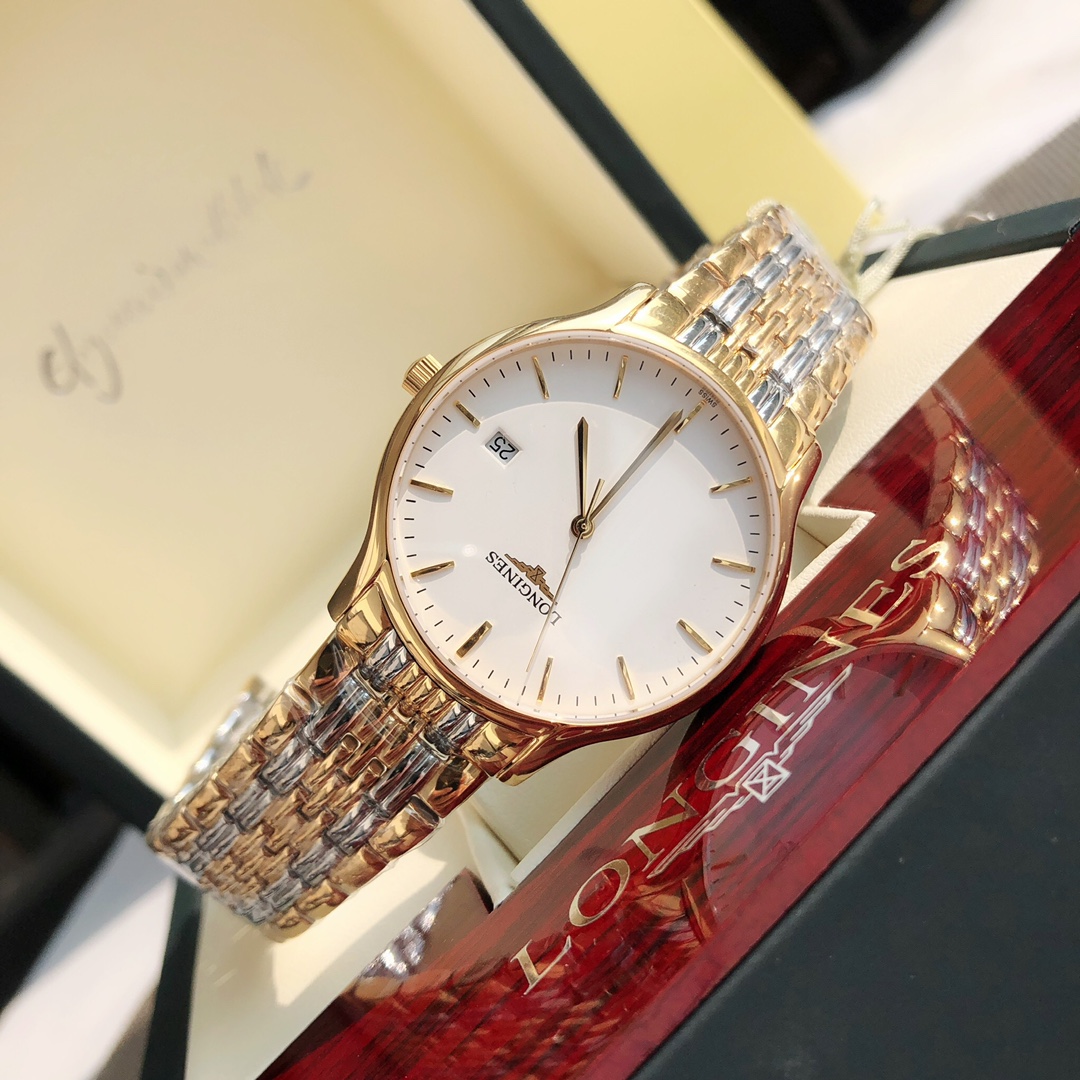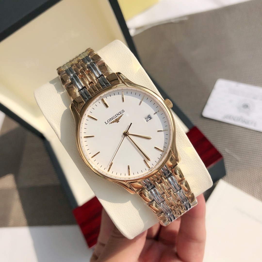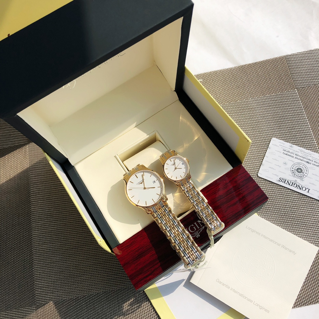 This time, we bring you a couple's Longines watch from the OEM factory channel. The men's version has a 38.5mm diameter, and the women's version has a 25mm diameter, both at the same price! The classic and timeless Longines Elegant Collection—casual and fashionable ladies' quartz watch—embodies the oldest manufacturing aesthetics of the Longines brand, renowned for its winged hourglass emblem. The uniquely designed case, with its ultra-thin silhouette, creates eternal beauty. The men's version features a Swiss Ronda 515 quartz movement, while the women's version features a Swiss Ronda 585 quartz movement. Both are equipped with scratch-resistant sapphire crystal, a triple-fold safety clasp, and a push-button opening mechanism. The simple silver hands add elegance to the entire dial. Original large accessories highlight the essence of the watch, and it comes with a lifetime warranty.