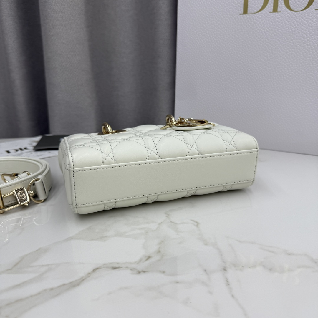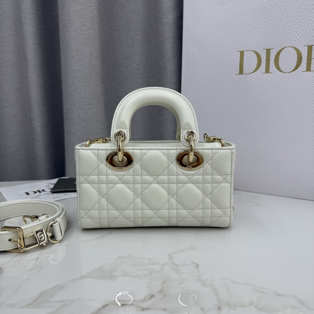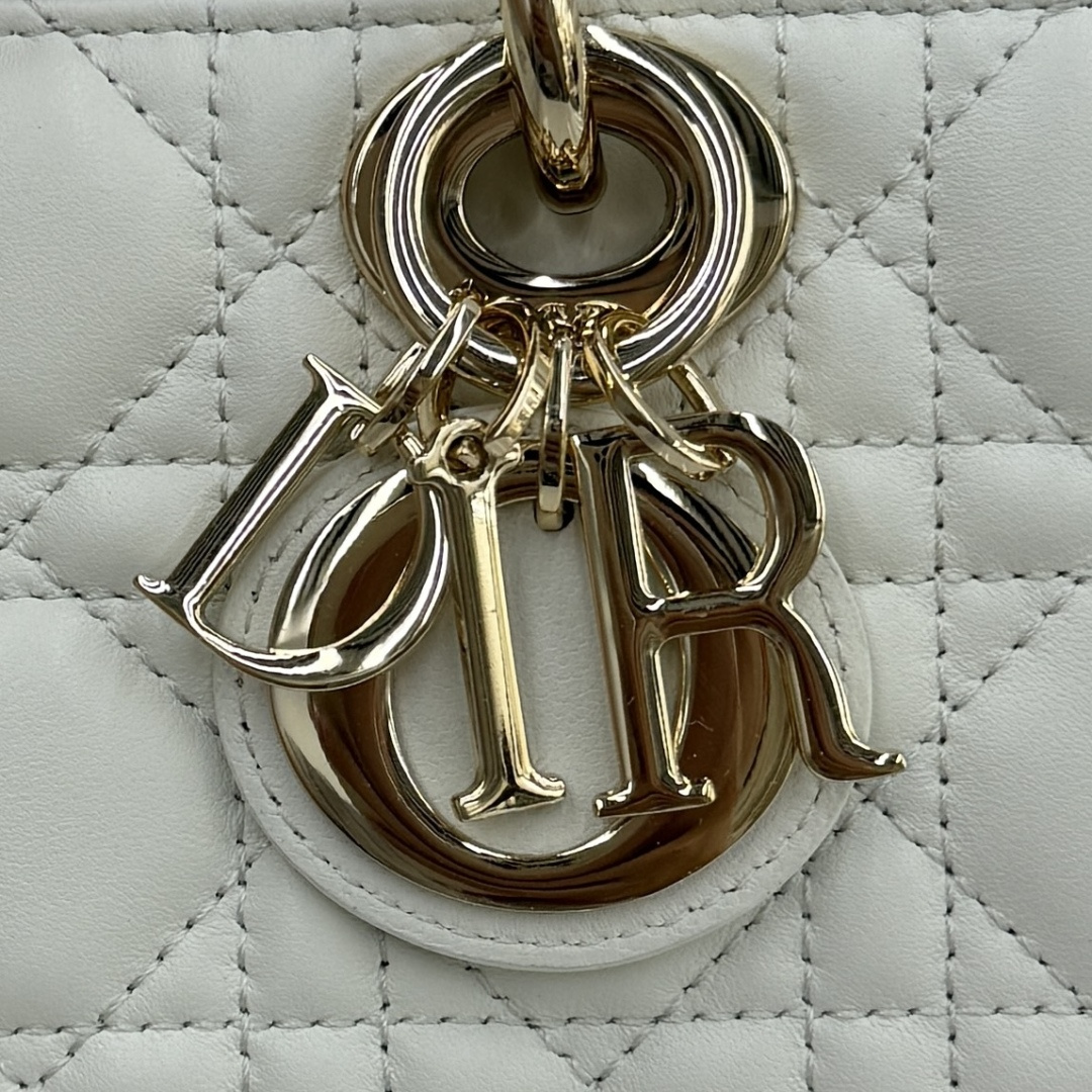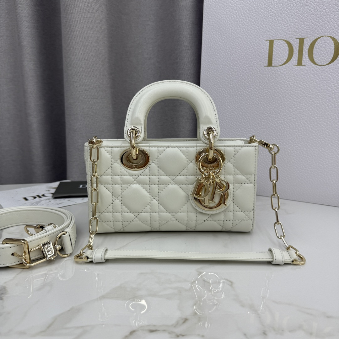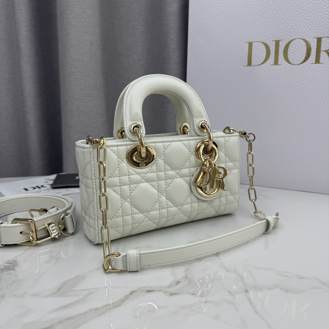 This Lady D-Joy bag is a new addition to the Fall-Winter 2025 ready-to-wear collection, highlighting the classic minimalist aesthetic of the Lady Dior line and embodying Dior's profound insight into elegance and beauty. Meticulously crafted from white lambskin and adorned with cannage stitching, its stylish and elegant design is timeless. The light gold-finished metal D.I.O.R. charm enhances the style, adding a touch of dynamism to the exquisite silhouette. The mini design, featuring a detachable chain strap and an adjustable, detachable leather strap, can be carried by hand, on the shoulder, or cross-body, making it an ideal choice for everyday styling.