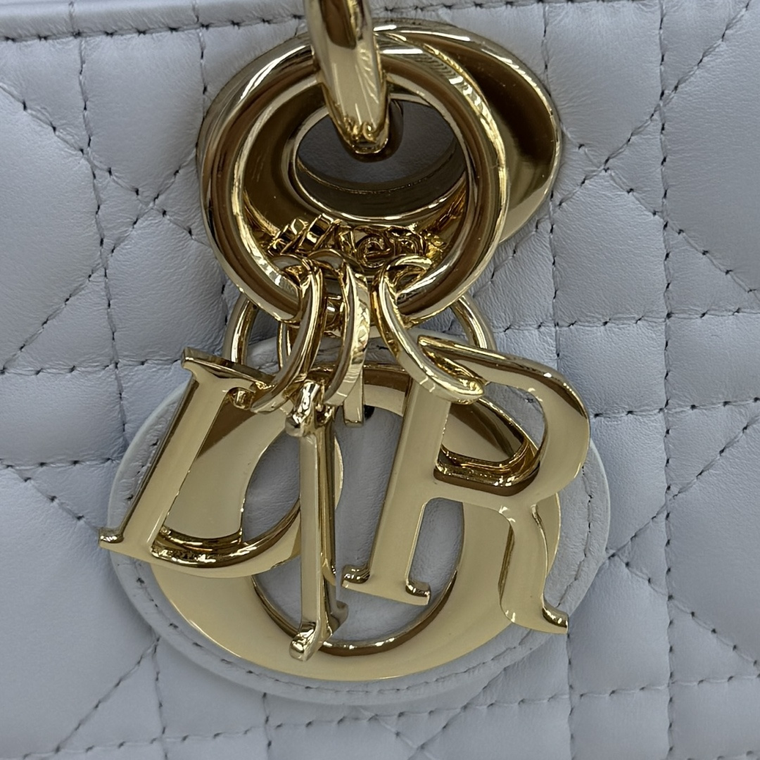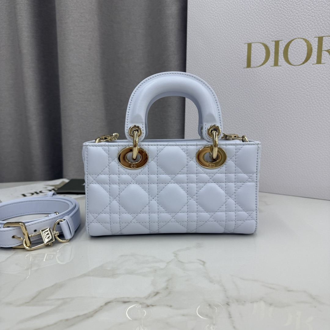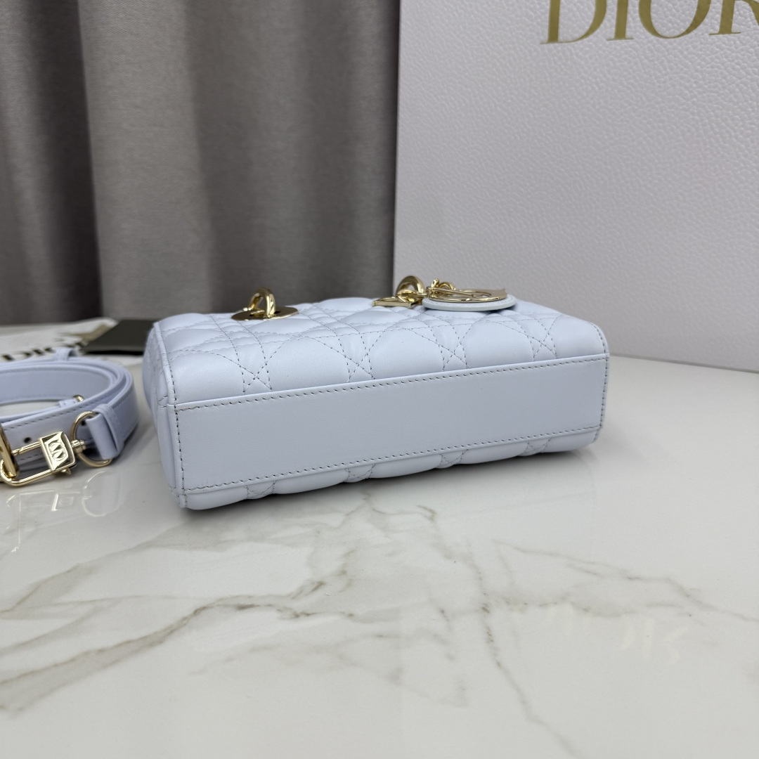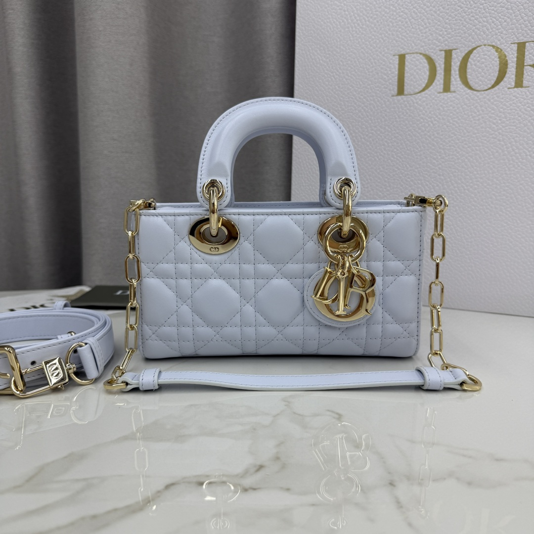 This Lady D-Joy bag is a new addition to the Fall-Winter 2025 ready-to-wear collection, highlighting the classic minimalist aesthetic of the Lady Dior line and embodying Dior's profound insight into elegance and beauty. Meticulously crafted from glacier blue lambskin, adorned with cannage quilting, its stylish and elegant design is timeless. A light gold-finished metal D.I.O.R. charm enhances the style, adding a touch of dynamism to the exquisite silhouette. The mini design, featuring a detachable chain strap and an adjustable, detachable leather strap, can be carried by hand, on the shoulder, or cross-body, making it an ideal choice for everyday styling.