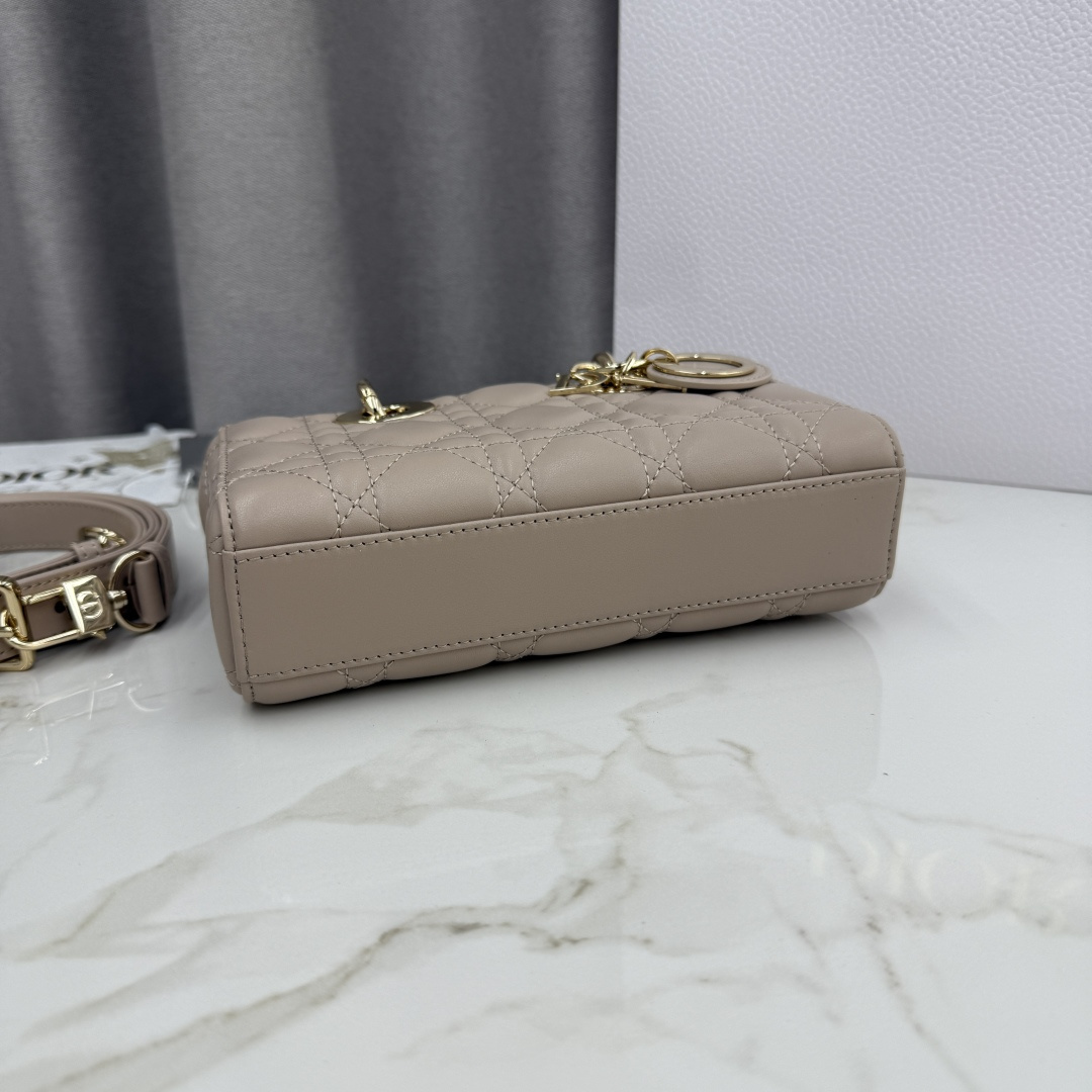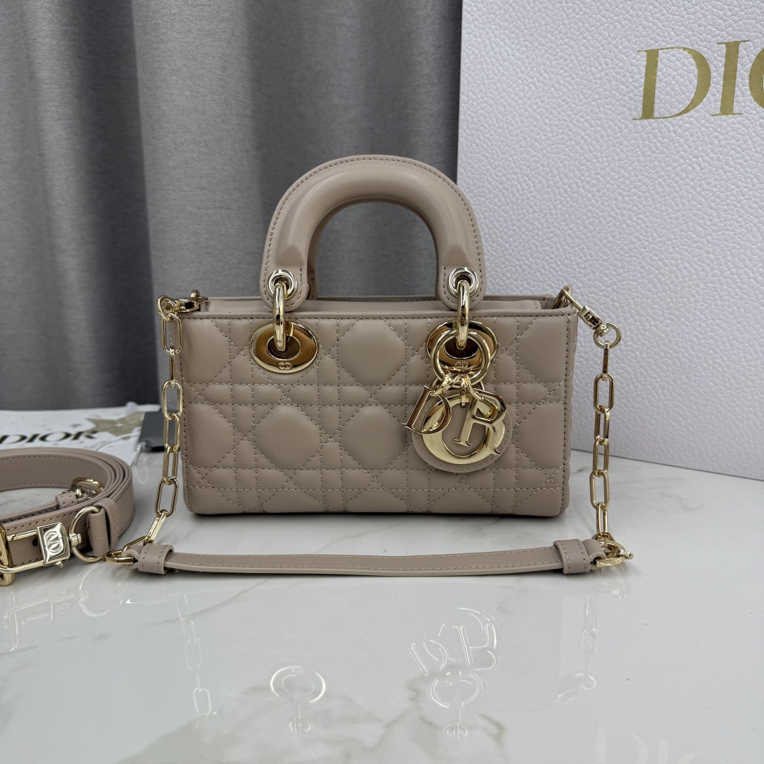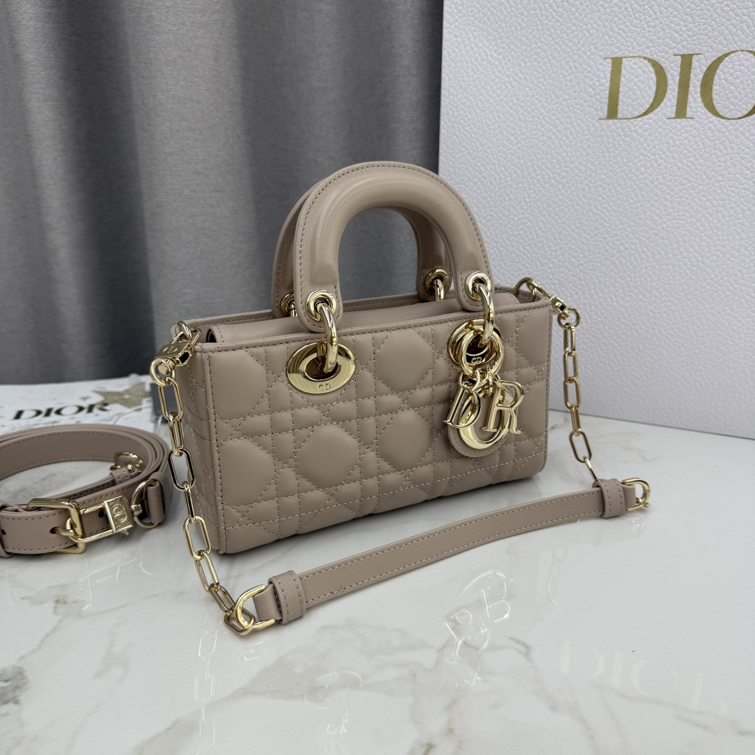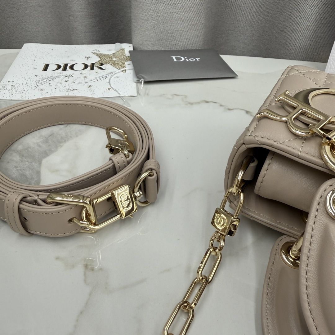 This Lady D-Joy bag is a new addition to the Fall-Winter 2025 ready-to-wear collection, highlighting the classic minimalist aesthetic of the Lady Dior line and embodying Dior's profound insight into elegance and beauty. Meticulously crafted from rouge beige lambskin, adorned with cannage stitching, its stylish and elegant design is timeless. The light gold-finished metal D.I.O.R. charm enhances the style, adding a touch of dynamism to the exquisite silhouette. The mini design, featuring a detachable chain strap and an adjustable, detachable leather strap, can be carried by hand, on the shoulder, or cross-body, making it an ideal choice for everyday styling.