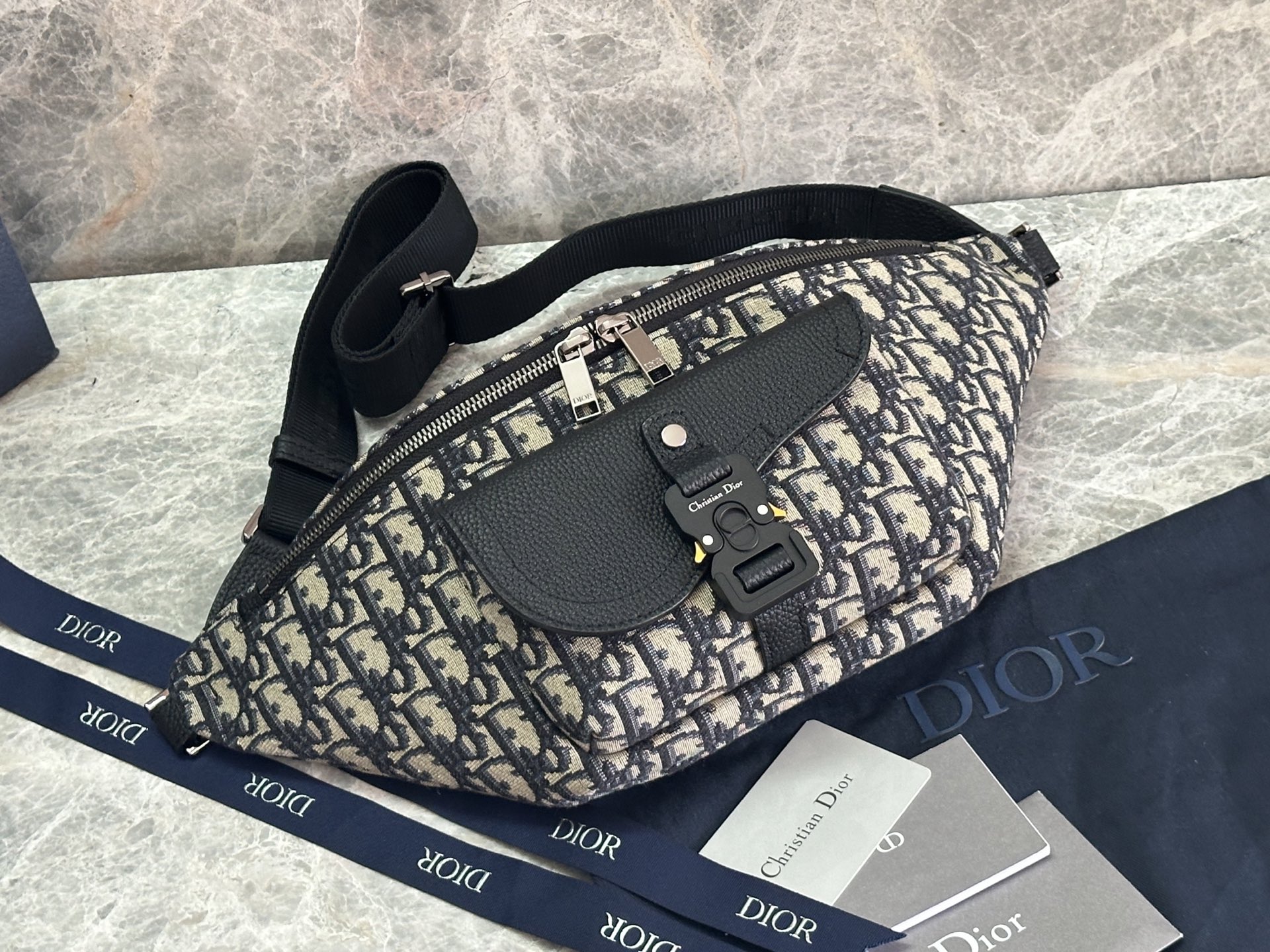 Batch 470 (Genuine Development, Top Original) This Dior 8 waist bag is a new arrival from Dior's Spring 2025 collection, combining fashion and practicality. Meticulously crafted from black Oblique printed fabric, it features a front flap pocket adorned with a Dior 8 buckle. The zippered compartment holds various daily essentials, and it comes with an adjustable leather strap for wearing around the waist or across the body.