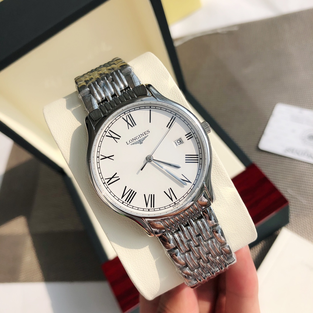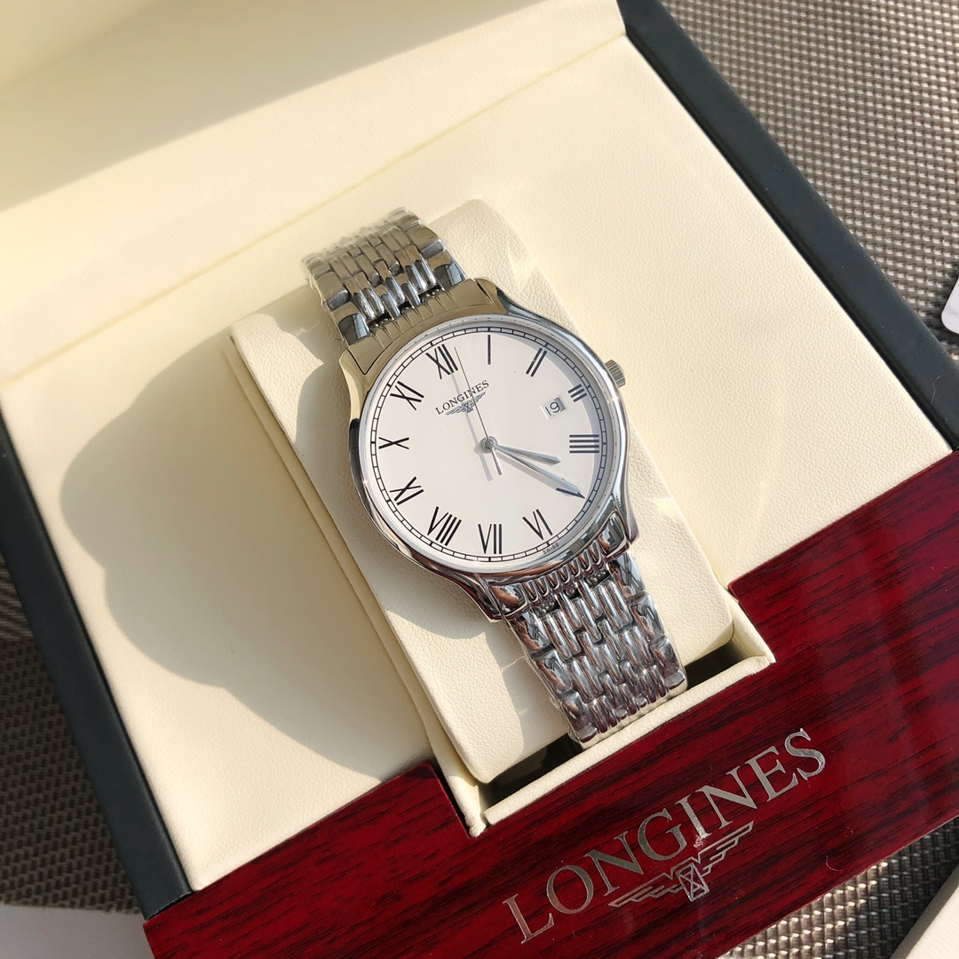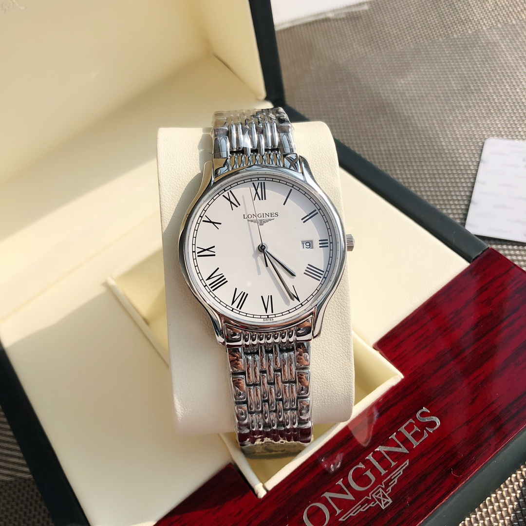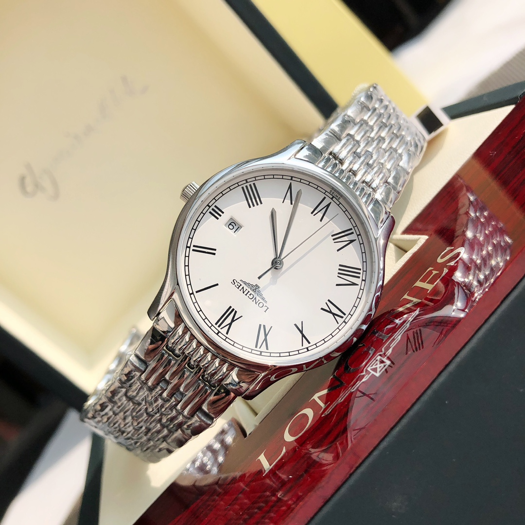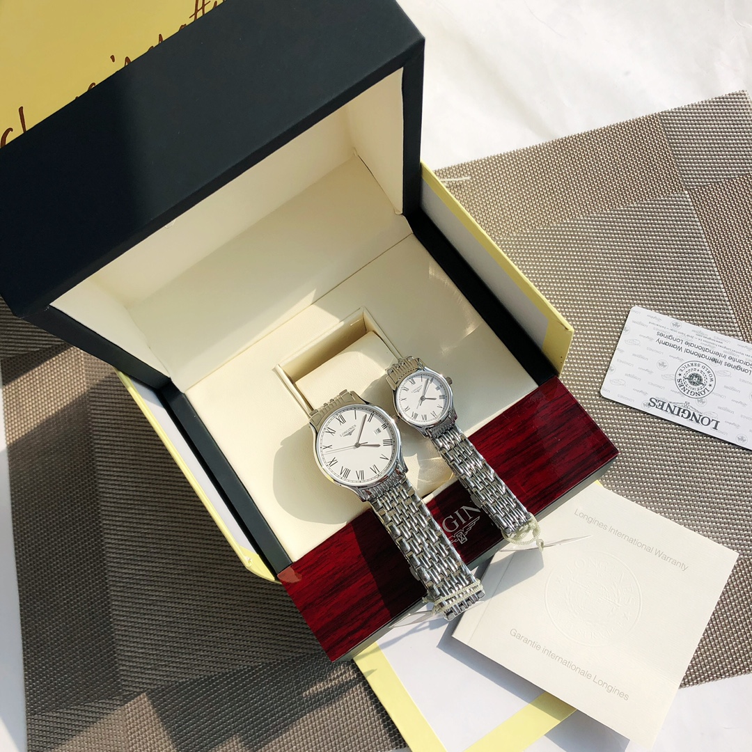 This time, we bring you a couple's Longines watch from the OEM factory channel. The men's version has a 38.5mm diameter, and the women's version has a 25mm diameter, both at the same price! The classic, timeless Longines Elegant Collection—casual and fashionable ladies' quartz watch—embodies the oldest manufacturing aesthetics of the Longines brand, renowned for its winged hourglass emblem. The uniquely designed case, with its ultra-thin silhouette, creates an eternal beauty. The men's version features a Swiss Ronda 515 quartz movement, while the women's version has a Swiss Ronda 585 quartz movement. Both are equipped with scratch-resistant sapphire crystal, a triple-fold safety clasp, and a push-button opening mechanism. The simple silver hands add refinement to the entire dial. With original large accessories, the essence of the watch is immediately apparent, and it comes with a lifetime warranty.
