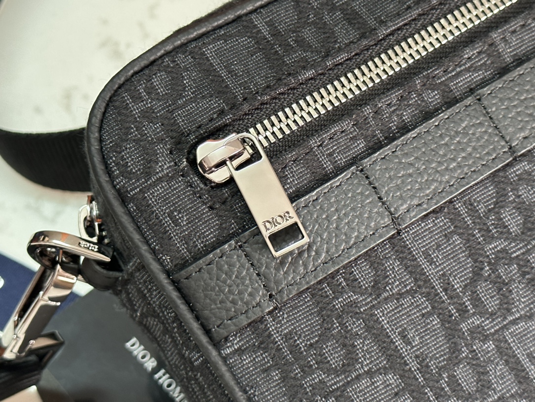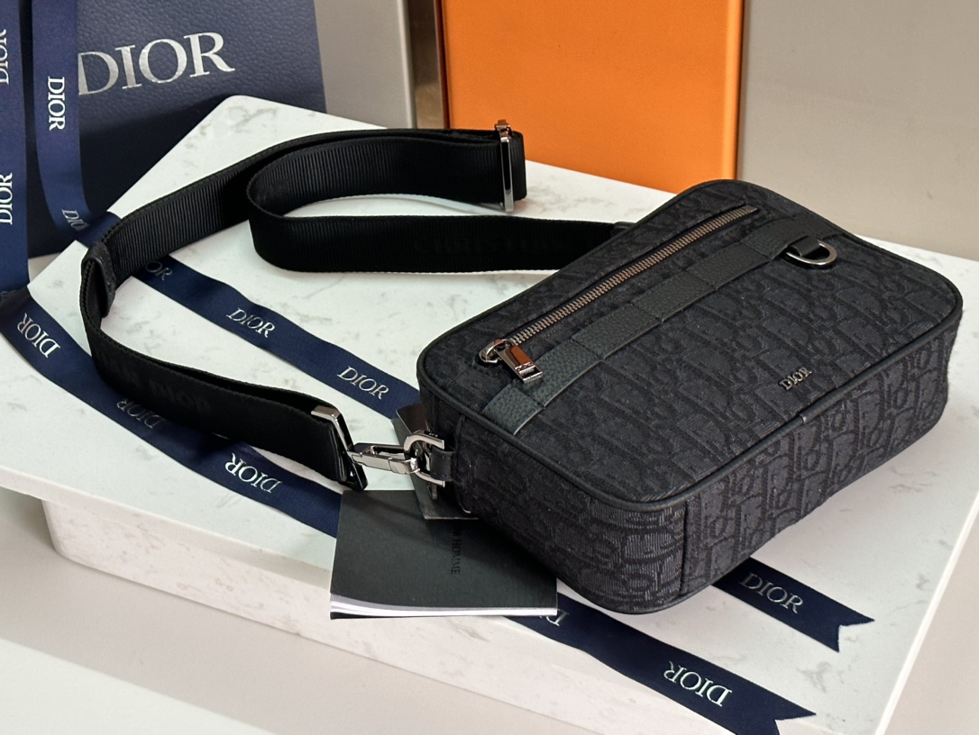 This Safari messenger bag is practical and compact, ideal for daily use. Meticulously crafted from beige and black Oblique printed fabric, it features black grained calfskin leather details. The zippered compartment and front pocket can hold various daily essentials. It comes with an adjustable strap adorned with the Christian Dior logo, allowing it to be carried on the shoulder or across the body.
