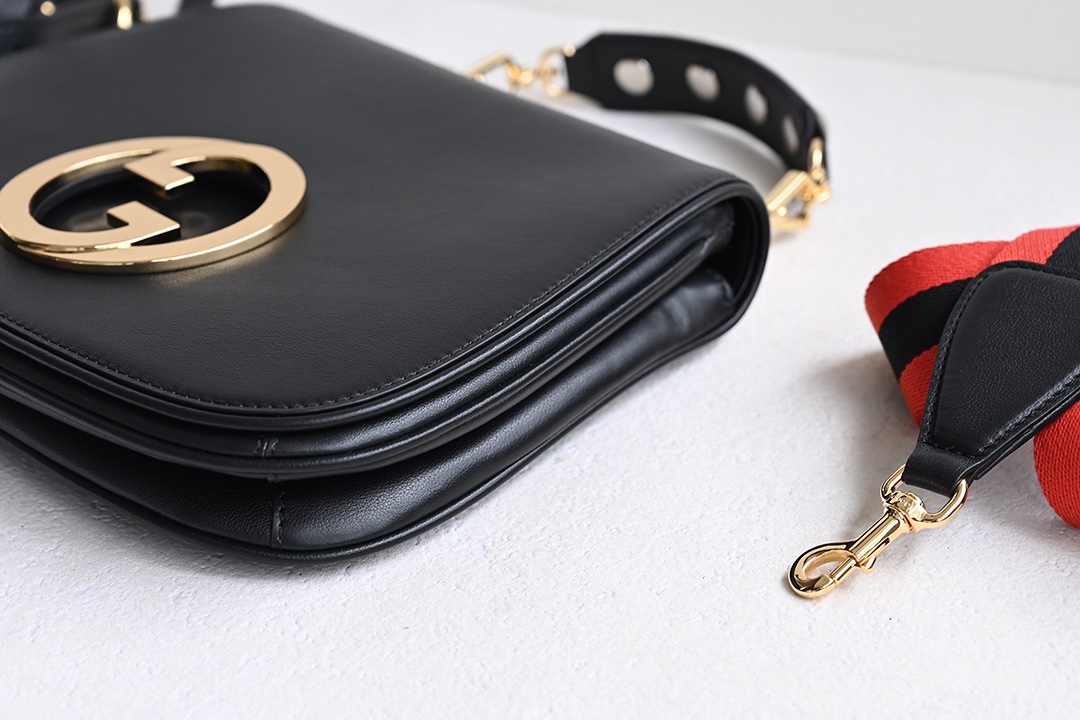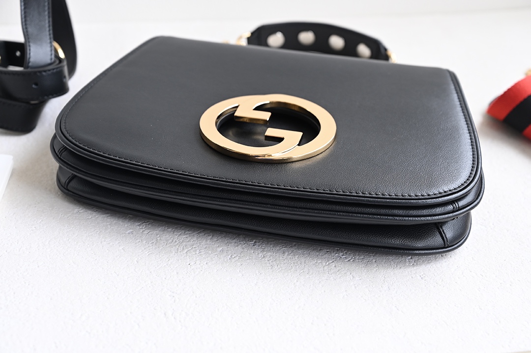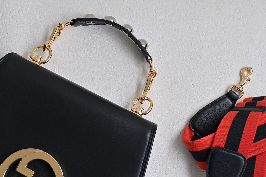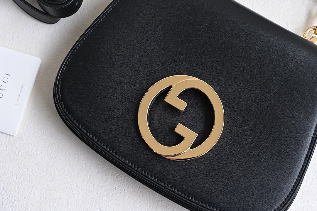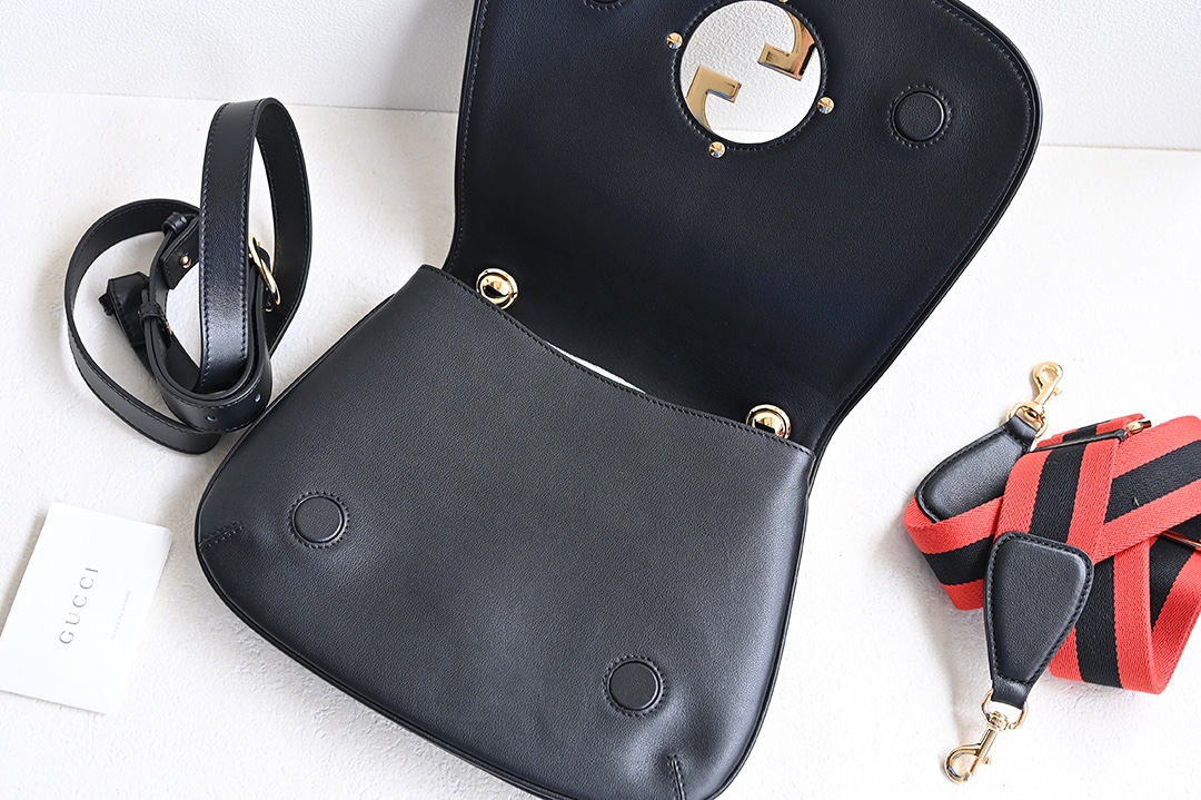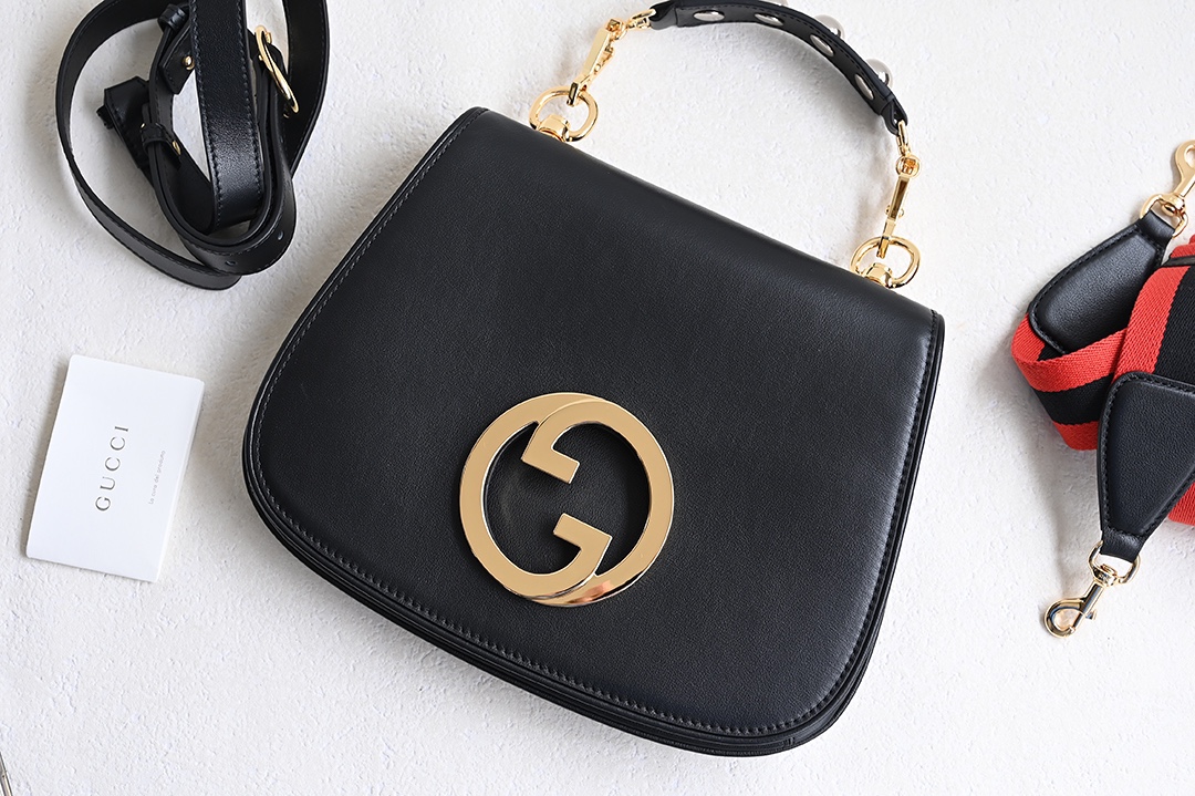 Gucci Blondie Medium Bag. The brand's archival elements are reinterpreted with geometric shapes, refreshing the interlocking double G motif and presenting a range of chic pieces. Gold-toned hardware adds an elegant vintage touch to this item, highlighting the timeless design style, which complements the Hollywood luxury showcased in the fashion show. This GG Supreme canvas bag comes with two interchangeable straps. Beige and ebony GG Supreme canvas, brown leather trim, gold-toned hardware, cotton and linen lining, circular interlocking double G. Interior: 2 main compartments and 1 zippered pocket. Studded handle (12 cm height) webbing strap (52 cm height); leather strap (56 cm height) magnetic closure.