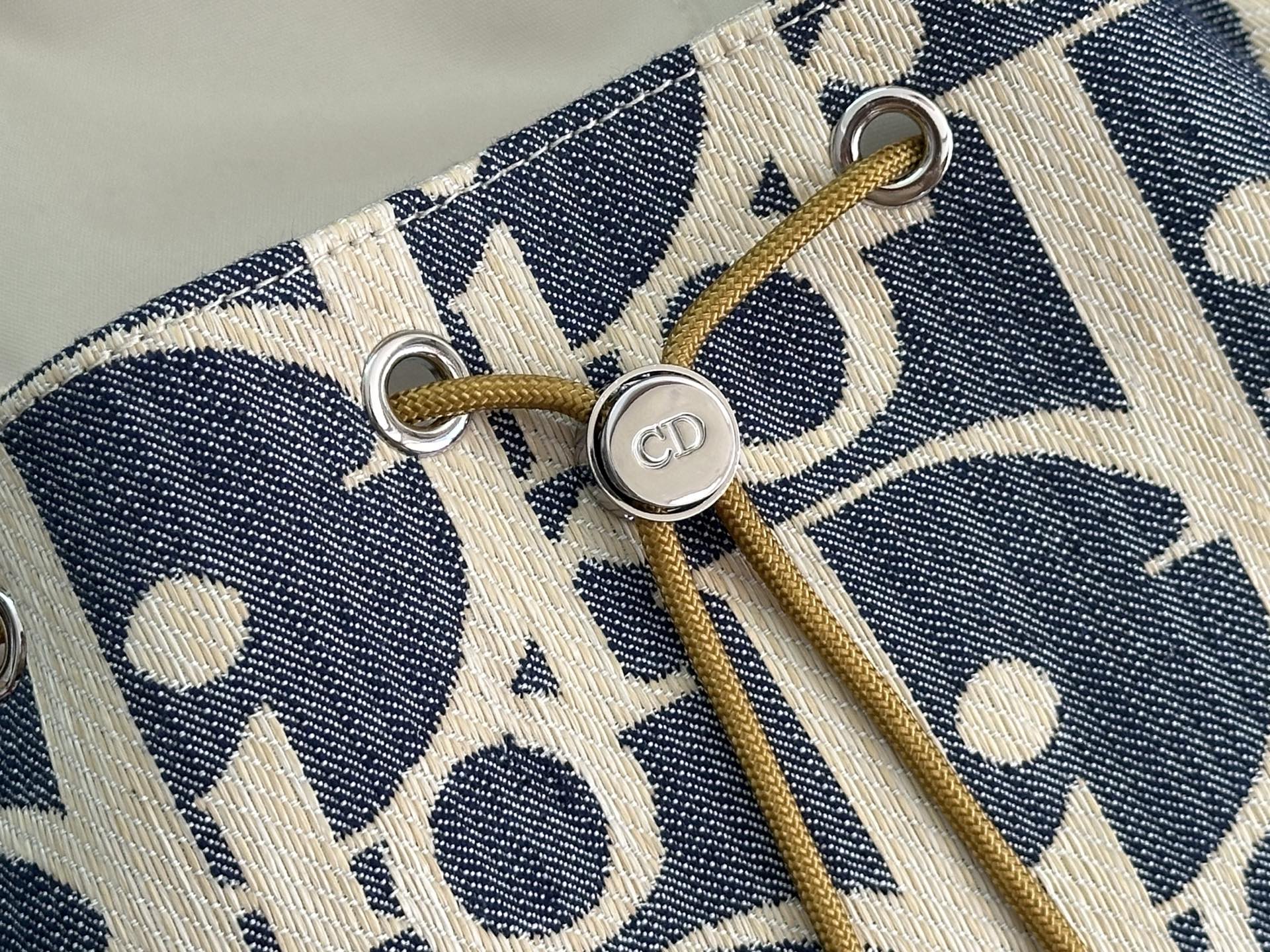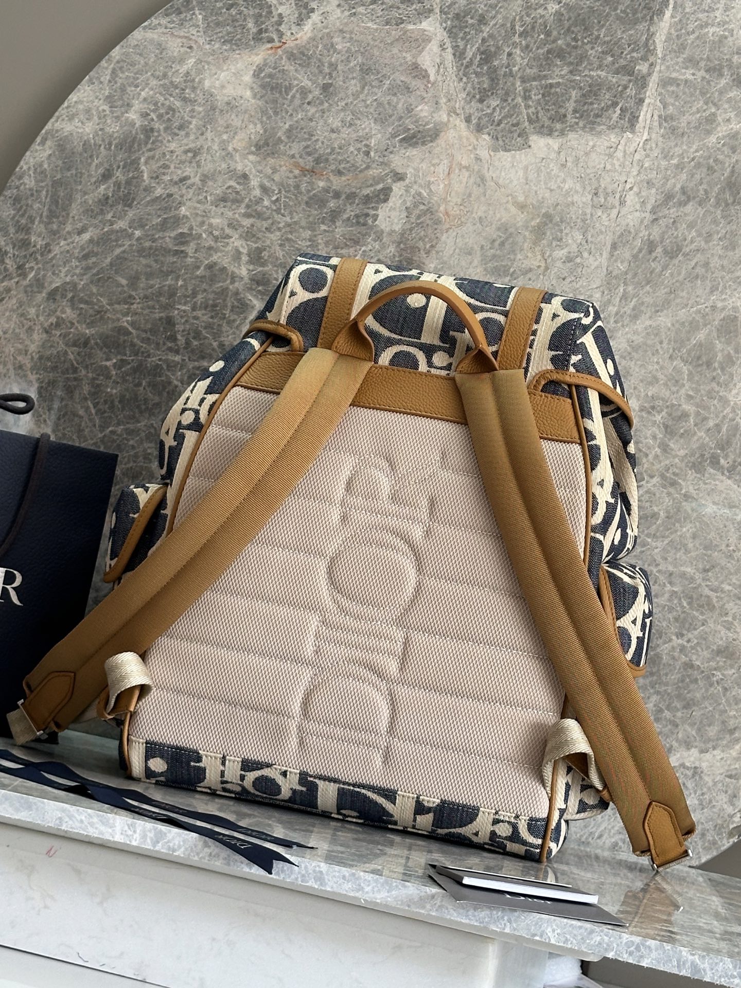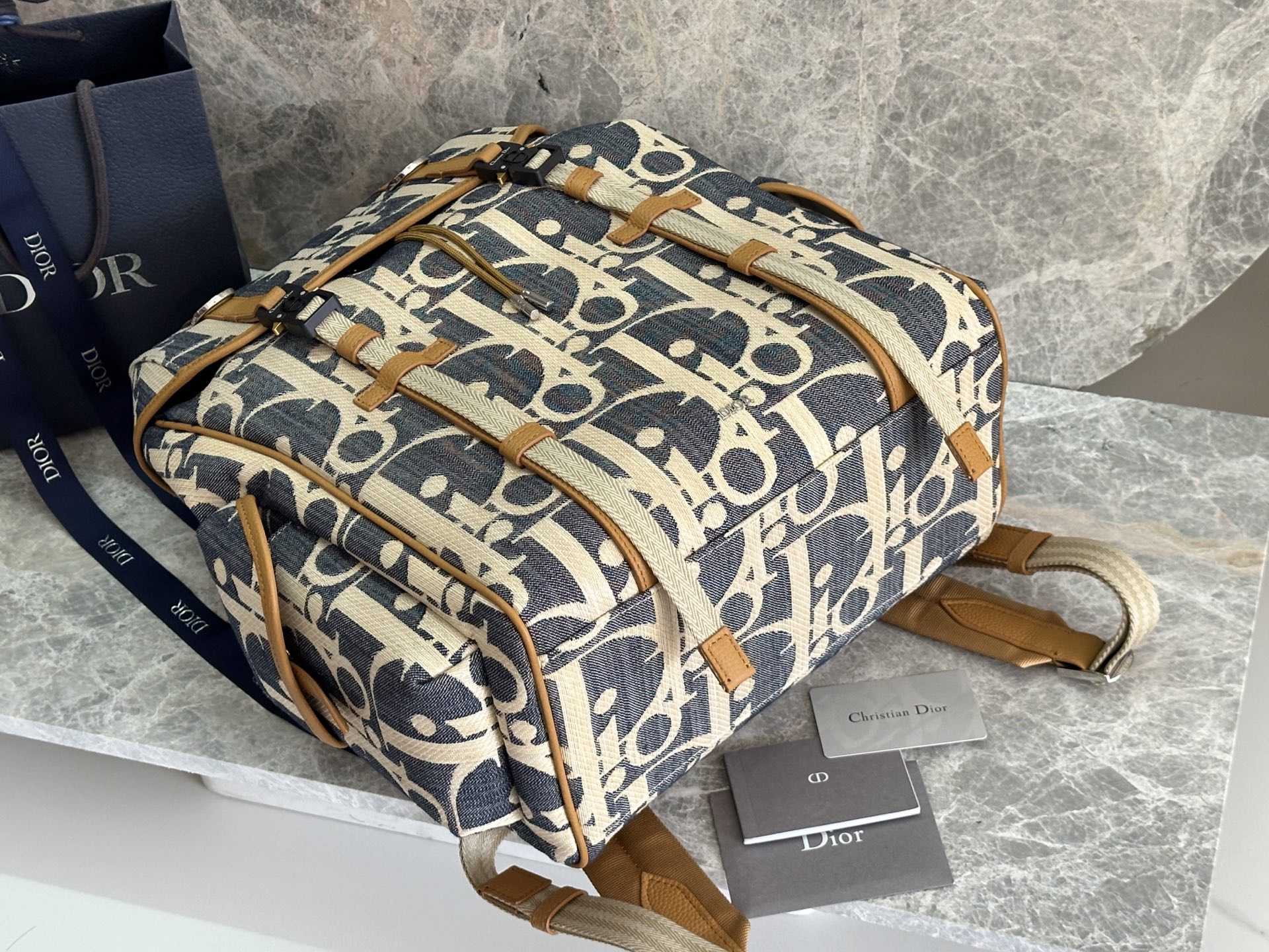 This Dior Hit The Road flap backpack blends modern style with Dior's haute couture spirit. Meticulously crafted from materials such as raffia-effect Oblique printed denim fabric, adorned with blue jacquard embroidery and accented with contrasting beige stitching, it offers a fresh interpretation of the classic Dior logo. Featuring details in brown grained calfskin leather, the flap is equipped with a mini CD aluminum buckle and two herringbone-pattern straps. It includes a spacious main compartment and two side pockets with magnetic flaps. The practical design pairs excellently with various casual outfits.