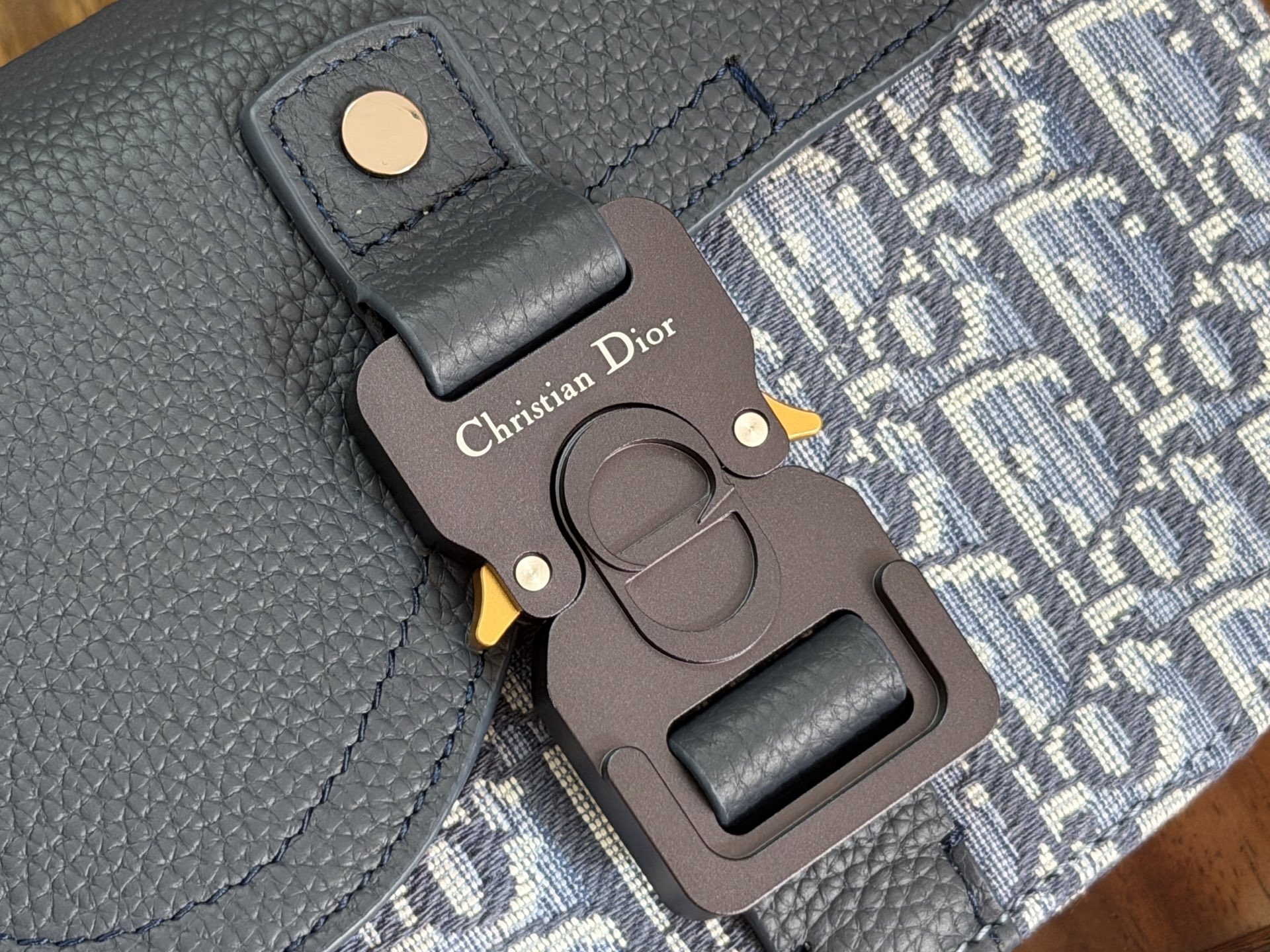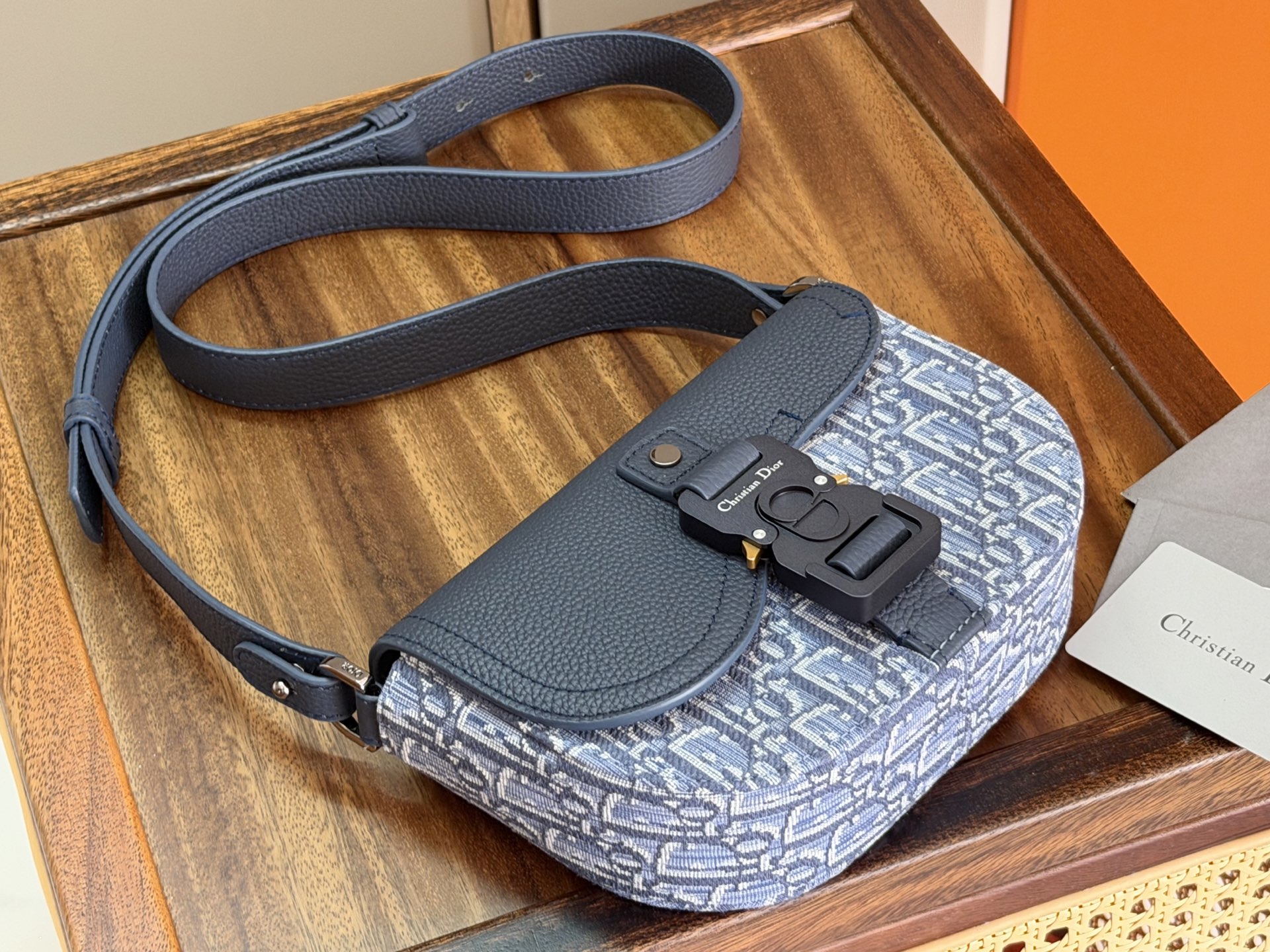 This saddle messenger bag highlights a fashionable design with a flap, showcasing exquisite elegance and enhancing the style of the saddle series. Meticulously crafted from materials such as blue Oblique printed fabric, it features a saddle flap in grained calfskin leather in the same tone, adorned with a Christian Dior logo aluminum buckle. The mini style comes with an adjustable, detachable leather strap, allowing it to be carried by hand, over the shoulder, or cross-body.