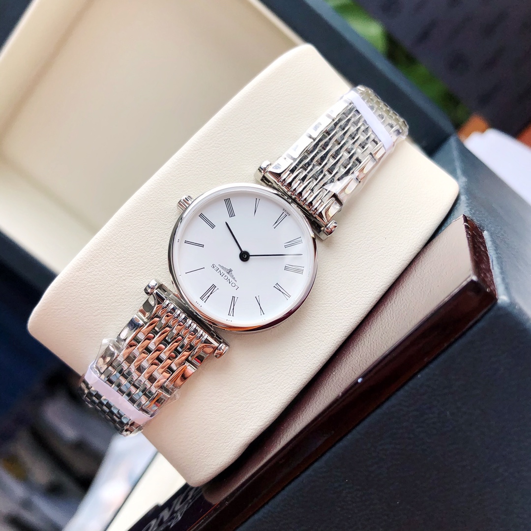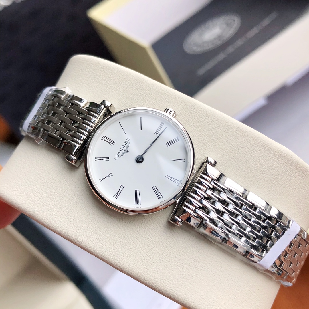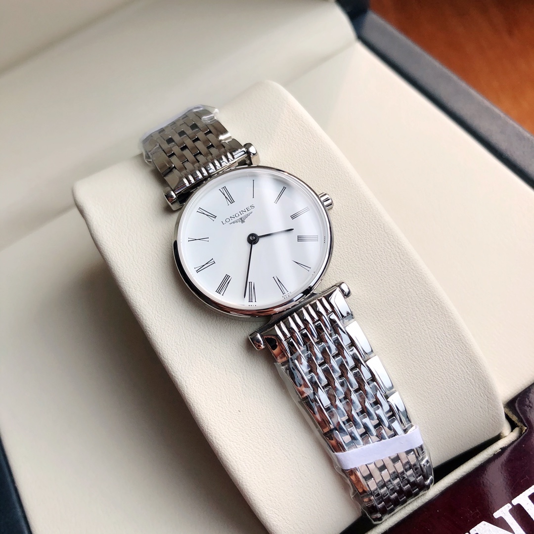 Batch Ultra-thin 4mm... Classic Roman numerals! Longines La Grande series - casual and fashionable ladies' quartz watch, size 24mm. The Longines La Grande embodies the oldest manufacturing aesthetics of the Longines brand, renowned for its winged hourglass emblem. The uniquely designed case, with its ultra-thin profile, creates timeless beauty. Equipped with an original Swiss L.209 quartz movement, scratch-resistant sapphire crystal, triple-fold safety clasp and push-button opening mechanism. Black hands add refinement to the entire dial. Original large components highlight the essence of the watch. One watch, one code. The watch case back, tag, and warranty card have matching codes. Exclusive supply.